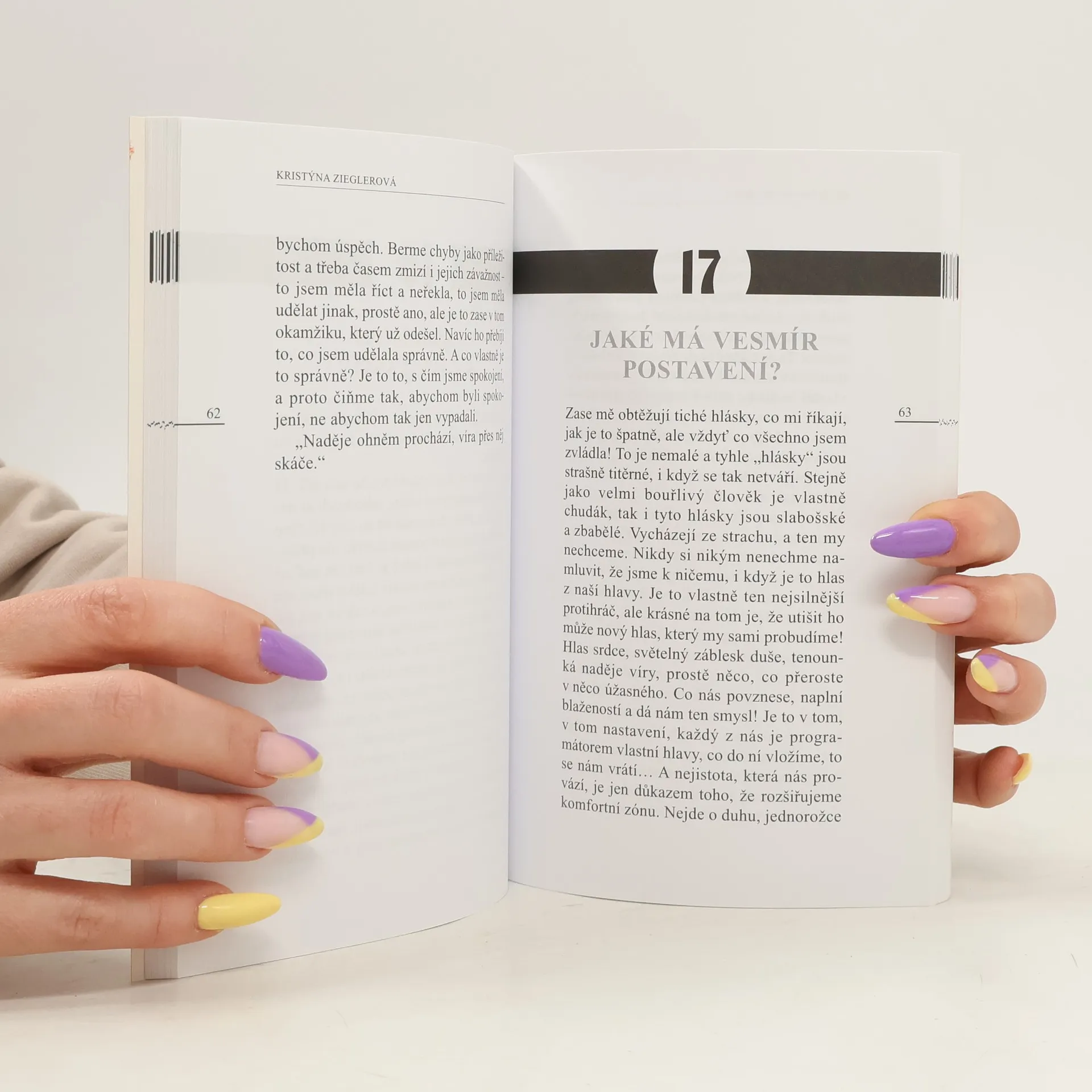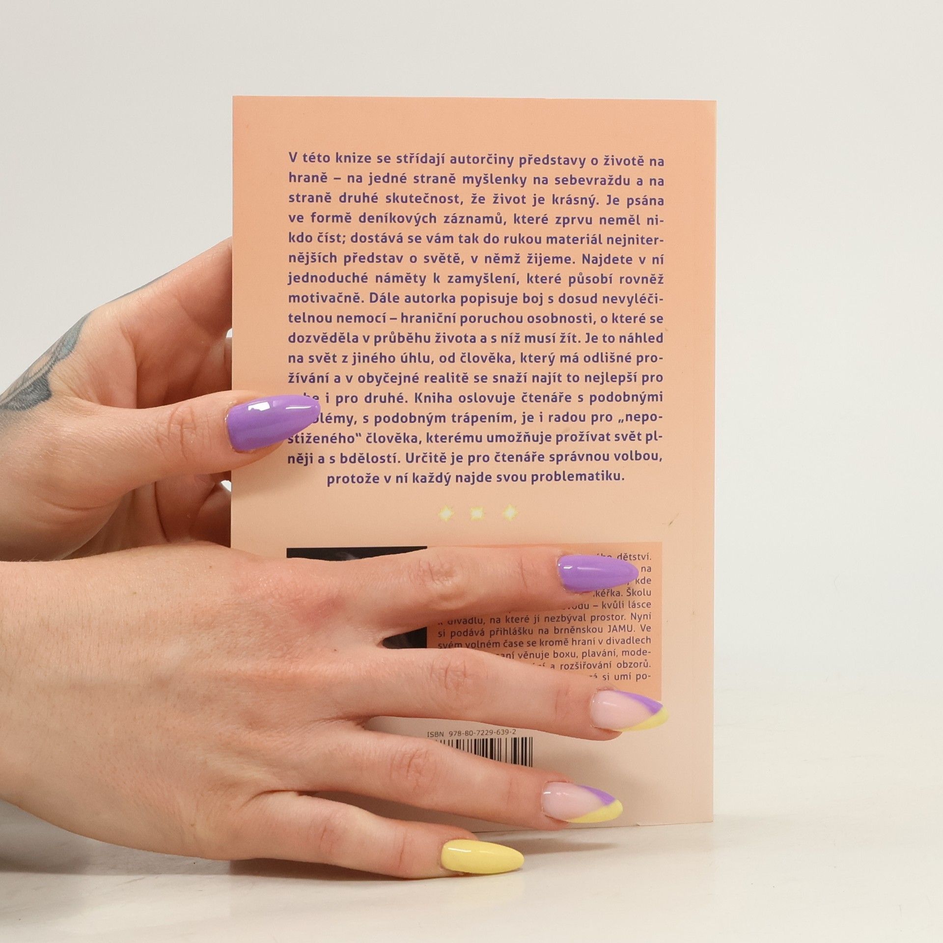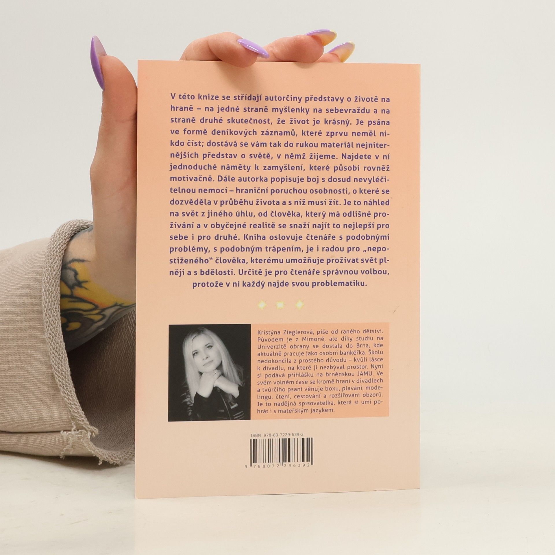 V této knize se střídají autorčiny představy o životě na hraně – na jedné straně myšlenky na sebevraždu a na straně druhé skutečnost, že život je krásný. Je psána ve formě deníkových záznamů, které zprvu neměl nikdo číst; dostává se vám tak do rukou materiál nejniternějších představ o světě, v němž žijeme. Najdete v ní jednoduché náměty k zamyšlení, které působí rovněž motivačně. Dále autorka popisuje boj s dosud nevyléčitelnou nemocí – hraniční poruchou osobnosti, o které se dozvěděla v průběhu života a s níž musí žít. Je to náhled na svět z jiného úhlu, od člověka, který má odlišné prožívání a v obyčejné realitě se snaží najít to nejlepší pro sebe i pro druhé. Kniha oslovuje čtenáře s podobnými problémy, s podobným trápením, je i radou pro „nepostiženého“ člověka, kterému umožňuje prožívat svět plněji a s bdělostí. Určitě je pro čtenáře správnou volbou, protože v ní každý najde svůj osud.