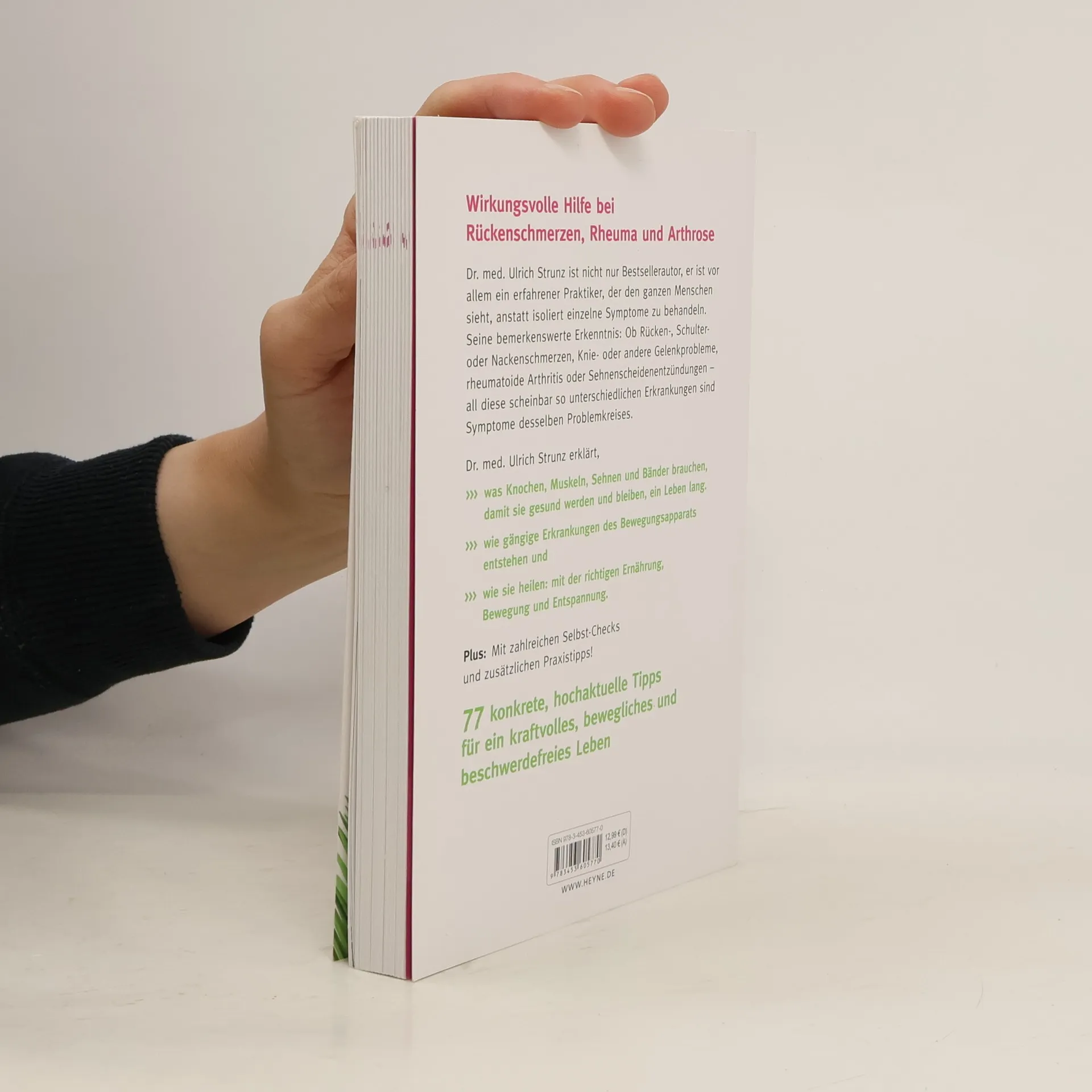 Warum sind Rücken und Gelenke so anfällig für Schmerzen? Warum plagen uns Schulter- und Nackenschmerzen, Gelenkprobleme, Knieschmerzen, Arthrose, Rheuma, Sehnenscheidenentzündungen? Warum leidet jeder Dritte unter Rückenschmerzen, sind im Alter zwei Drittel von Arthrose betroffen? Das Verblüffende: All diese scheinbar so unterschiedlichen Erkrankungen hängen miteinander zusammen, sind Symptome desselben Problemkreises! Dr. med. Ulrich Strunz erklärt, was Knochen, Muskeln, Sehnen und Bänder brauchen, damit sie gesund werden und bleiben, ein Leben lang. Er zeigt, wie gängige Erkrankungen des Bewegungsapparats entstehen und wie sie heilen: mit der richtigen Ernährung, Bewegung und Entspannung. Einzigartige Tipps für alle, die sich vor Erkrankungen an Knochen, Muskeln und Gelenken schützen oder endlich wieder schmerzfrei leben möchten. Mit einleuchtenden Fakten, praktischen Anleitungen und motivierenden Ideen für die Lebensstilveränderung! Ausstattung: durchg. 2c