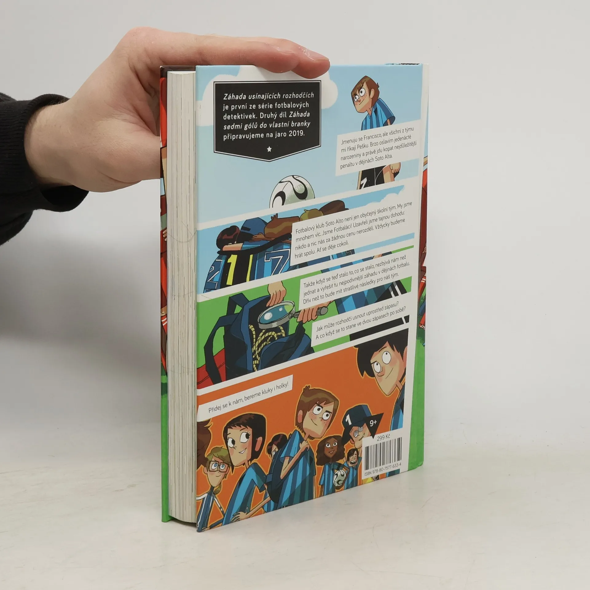 Jmenuju se Francisco, ale všichni z týmu mi říkají Pako. Nedávno mi bylo jedenáct a právě jdu kopat tu nejdůležitější penaltu v dějinách Soto Alta. Sedmý fotbalový tým Soto Alto není jen obyčejný školní oddíl. My jsme mnohem víc. My jsme Fotbaláci! Máme dohodu: nikdo a nic nás za žádnou cenu nerozdělí. Vždycky budeme hrát spolu. Ať se děje cokoli. Takže když se stalo to, co se stalo, neměli jsme jinou možnost než začít jednat: zapojit mozkové závity a přijít na kloub té nejpodivnější záhadě, jakou kdy kdo ve fotbale zažil. Jak může rozhodčí usnout uprostřed zápasu? Jak můžou usnout dva rozhodčí ve dvou zápasech? Záhada usínajících rozhodčích je první ze série fotbalových detektivek. Druhý díl Tajemství sedmi gólů do vlastní branky připravujeme na jaro 2019. Pro čtenáře od devíti let