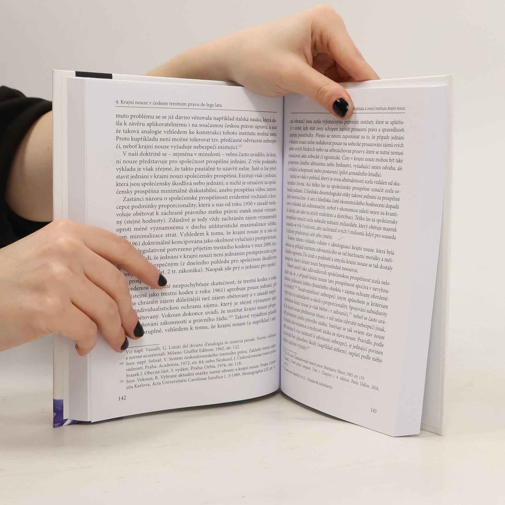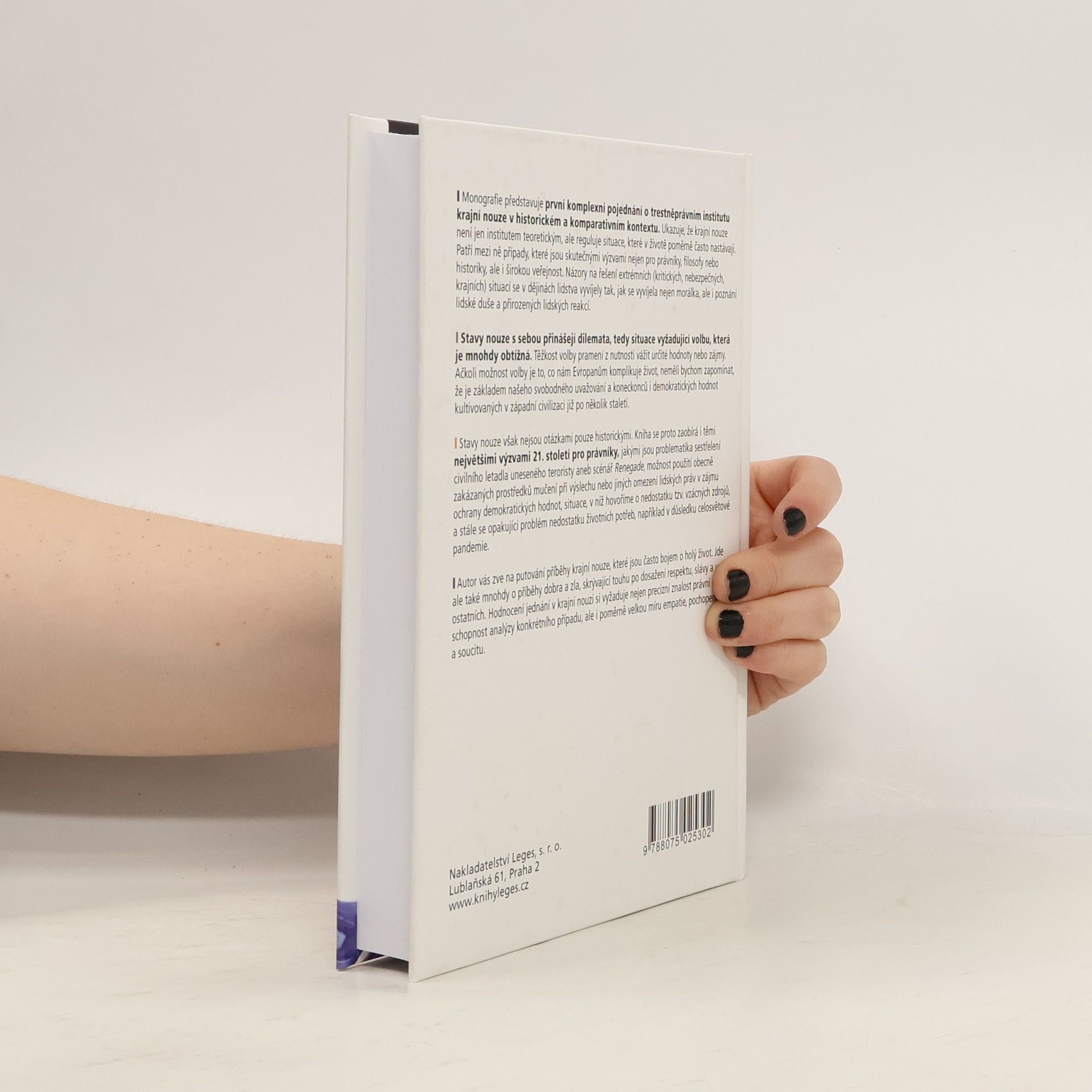 Monografie představuje první komplexní pojednání o trestněprávním institutu krajní nouze v historickém a komparativním kontextu. Ukazuje, že krajní nouze není jen institutem teoretickým, ale reguluje situace, které v životě poměrně často nastávají. Patří mezi ně případy, které jsou skutečnými výzvami nejen pro právníky, filosofy nebo historiky, ale i širokou veřejnost. Názory na řešení extrémních (kritických, nebezpečných, krajních) situací se v dějinách lidstva vyvíjely tak, jak se vyvíjela nejen morálka, ale i poznání lidské duše a přirozených lidských reakcí. Stavy nouze s sebou prˇina´sˇeji´ dilemata, tedy situace vyzˇaduji´ci´ volbu, ktera´ je mnohdy obti´zˇna´. Teˇzˇkost volby prameni´ z nutnosti va´zˇit urcˇite´ hodnoty nebo za´jmy. Acˇkoli mozˇnost volby je to, co na´m Evropanu°m komplikuje zˇivot, neměli bychom zapomínat, že je za´kladem nasˇeho svobodne´ho uvazˇova´ni´ a koneckoncu° i demokraticky´ch hodnot kultivovany´ch v za´padni´ civilizaci jizˇ po neˇkolik staleti´. Stavy nouze však nejsou otázkami pouze historickými. Kniha se proto zaobírá i těmi největšími výzvami 21. století pro právníky, jakými jsou problematika sestrˇeleni´ civilni´ho letadla unesene´ho teroristy aneb sce´na´rˇ Renegade, mozˇnost pouzˇití obecneˇ zaka´zany´ch prostrˇedku° mucˇeni´ prˇi vy´slechu nebo jiny´ch omezeni´ lidsky´ch pra´v v zájmu ochrany demokratických hodnot, situace, v ni´zˇ hovorˇi´me o nedostatku tzv. vza´cny´ch zdroju°, a sta´le se opakuji´ci´ proble´m nedostatku zˇivotni´ch potrˇeb, například v důsledku celosvětové pandemie. Autor vás zve na putování příběhy krajní nouze, které jsou často bojem o holý život. Jde ale také mnohdy o příběhy dobra a zla, skrývající touhu po dosažení respektu, slávy a uznání ostatních. Hodnocení jednání v krajní nouzi si vyžaduje nejen precizní znalost právní úpravy, schopnost analýzy konkrétního případu, ale i poměrně velkou míru empatie, pochopení a soucitu.