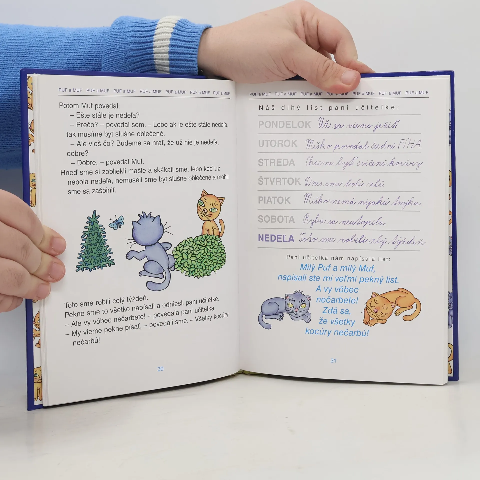 Naučiť sa pekne a rýchlo čítať, to je túžba každého prváka a druháka. Na pomoc im prichádza Nataša Tanská so svojimi veselými rozprávkami o dvoch nezbedných kocúrikoch v knihe s veľkými písmenkami a milými ilustráciami Heleny Zmatlíkovej. Kapitoly: Zajtra ideme do školy, Puf a Muf, Puf a Muf na dedine, Puf a Muf a vrabec Oskár, Puf a Muf v divadle.