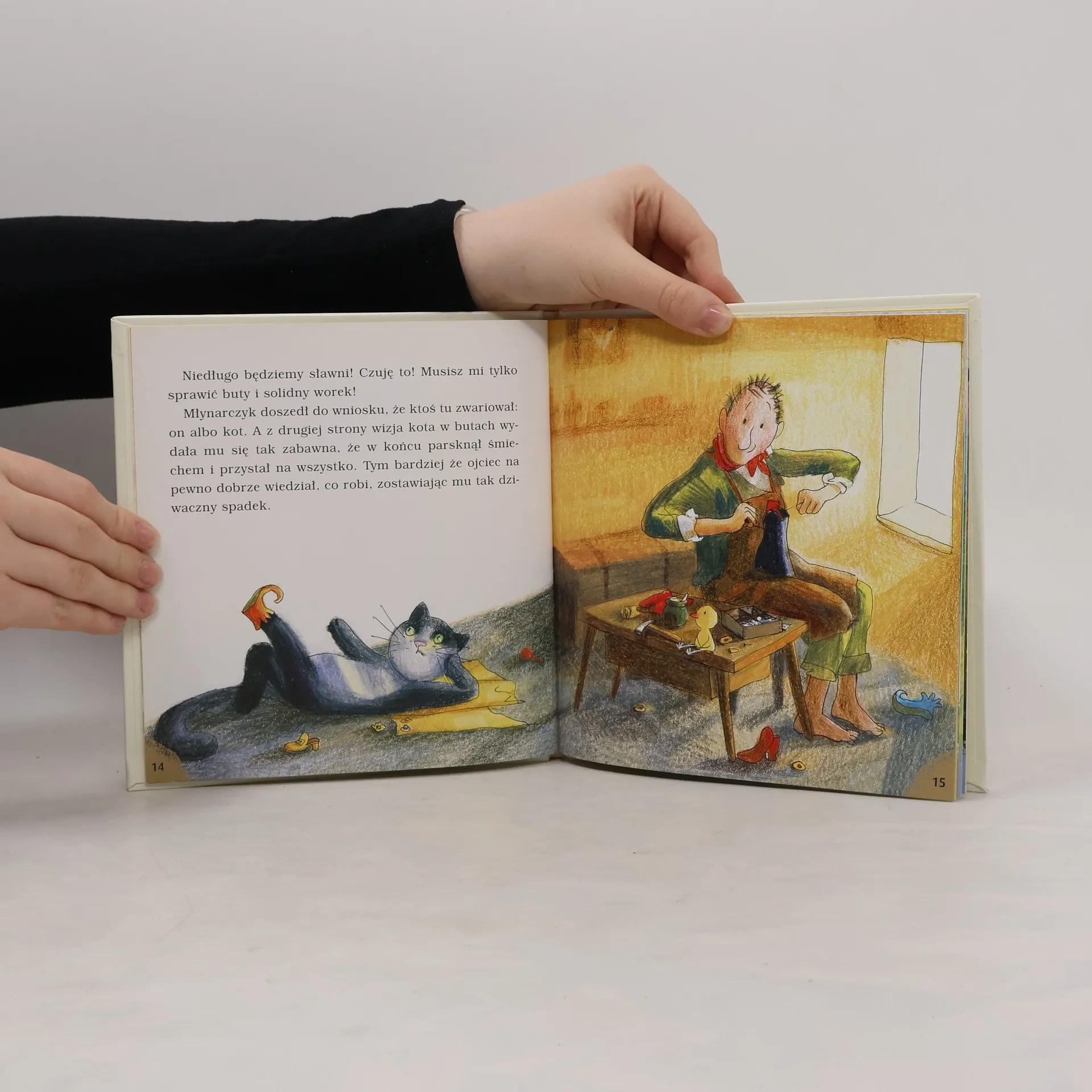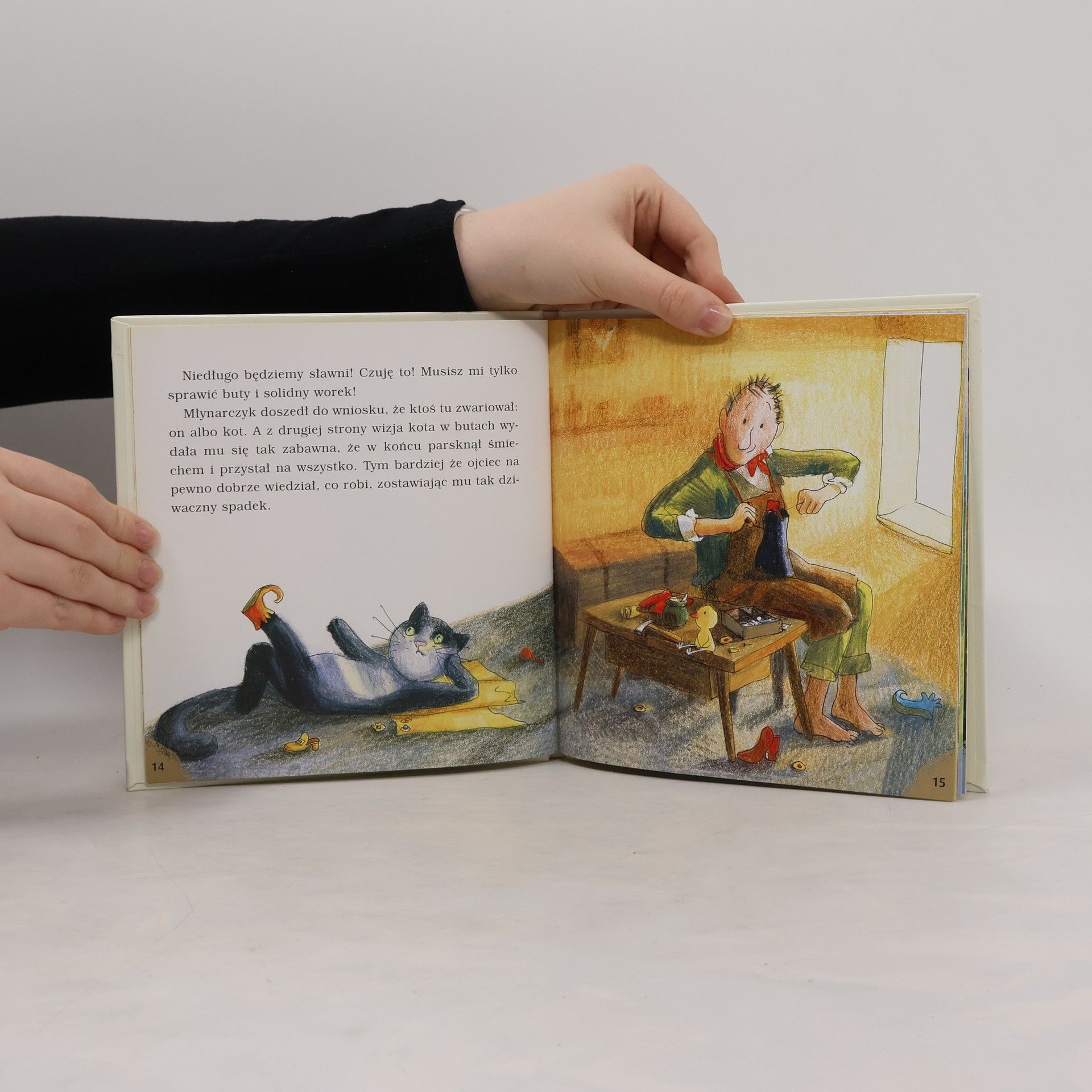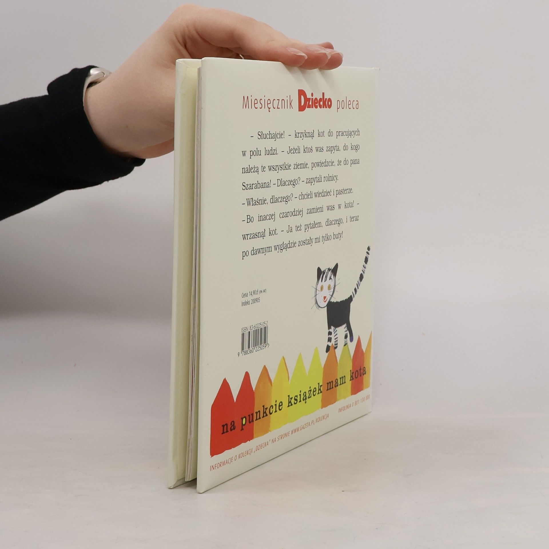 Słuchajcie! - krzyknął kot do pracujących w polu ludzi. - Jeżeli ktoś was zapyta, do kogo należą te wszystkie ziemie, powiedzcie, że do pana Szarabana! - Dlaczego? - zapytali rolnicy. - Właśnie, dlaczego? - chcieli wiedzieć i pasterze. - Bo inaczej czarodziej zamieni was w kota! - wrzasnął kot. - Ja też pytałem, dlaczego, i teraz po dawnym wyglądzie zostały mi tylko buty!u.