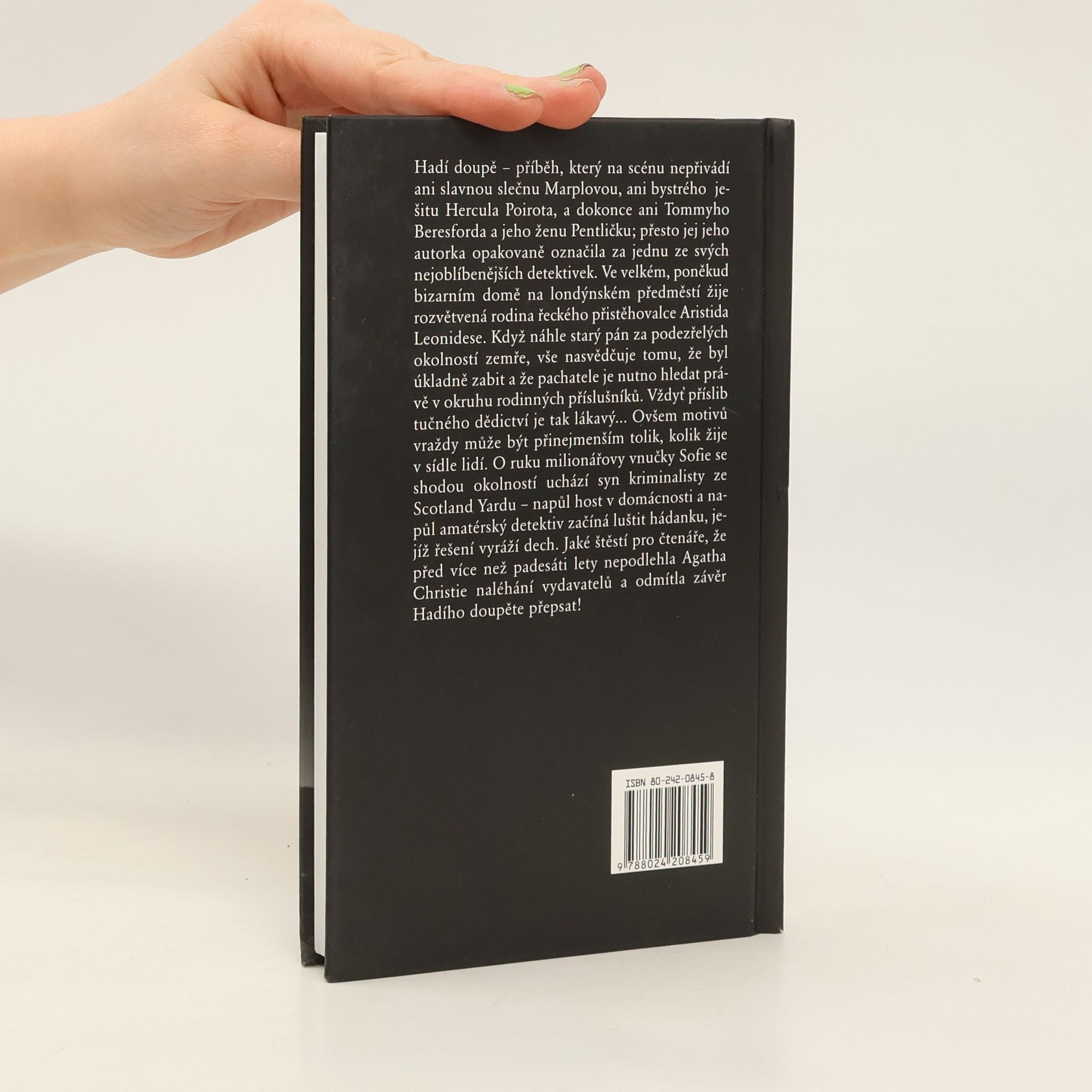 Hadí doupě – příběh, který na scénu nepřivádí ani slavnou slečnu Marplovou, ani bystrého ješitu Hercula Poirota, a dokonce ani Tommyho Beresforda a jeho ženu Pentličku; přesto jej jeho autorka opakovaně označila za jednu ze svých nejoblíbenějších detektivek. Ve velkém, poněkud bizarním domě na londýnském předměstí žije rozvětvená rodina řeckého přistěhovalce Aristida Leonidese. Když náhle starý pán za podezřelých okolností zemře, vše nasvědčuje tomu, že byl úkladně zabit a že pachatele je nutno hledat právě v okruhu rodinných příslušníků. Vždyť příslib tučného dědictví je tak lákavý... Ovšem motivů vraždy může být přinejmenším tolik, kolik žije na sídle lidí. O ruku milionářovy vnučky Sofie se shodou okolností uchází syn kriminalisty ze Scotland Yardu – napůl host v domácnosti a napůl amatérský detektiv začíná luštit hádanku, jejíž řešení vyráží dech. Jaké štěstí pro čtenáře, že před více než padesáti lety nepodlehla Agatha Christie naléhání vydavatelů a odmítla závěr Hadího doupěte přepsat!... celý text
