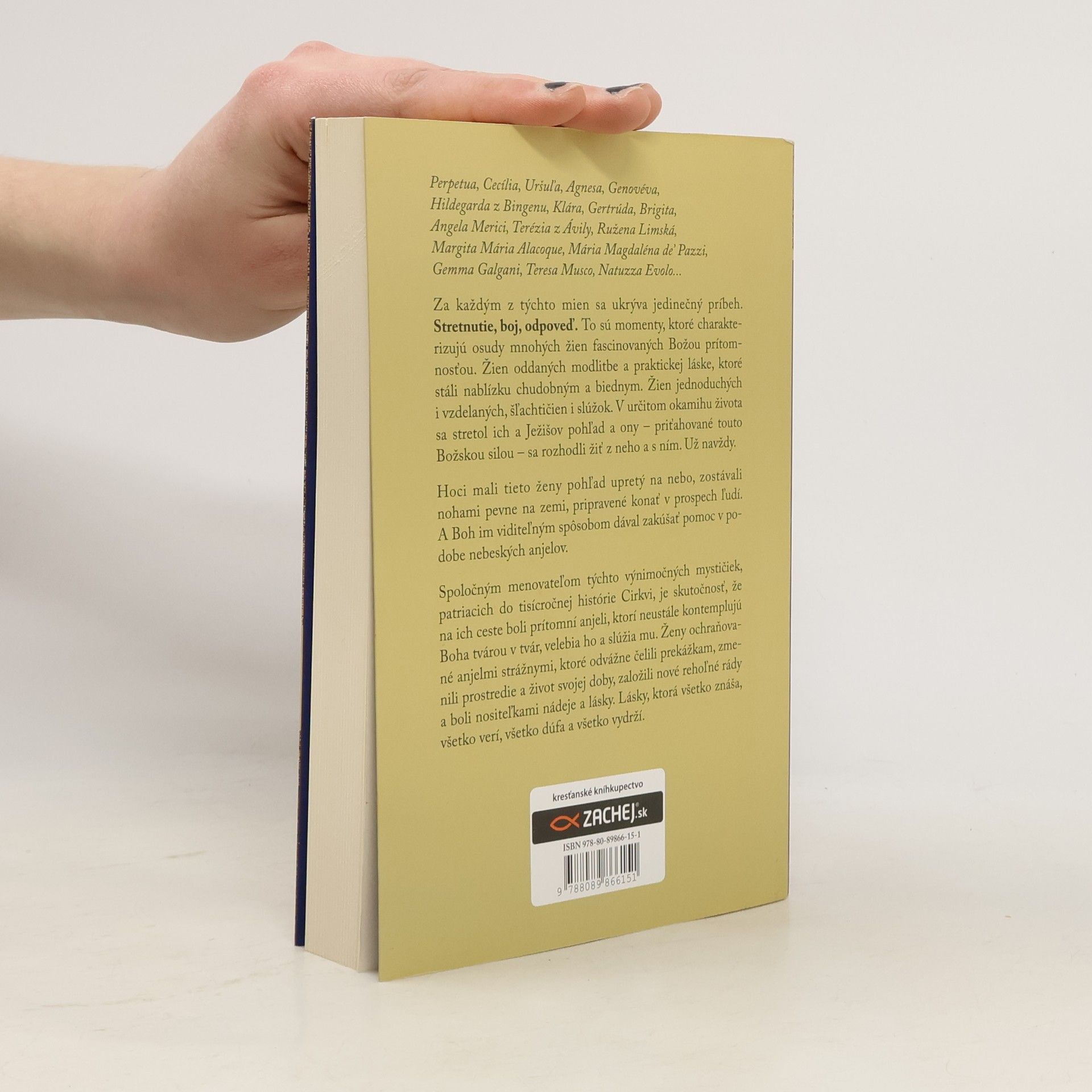 Perpetua, Cecília, Uršuľa, Agnesa, Genovéva, Hildegarda z Bingenu, Klára, Gertrúda, Brigita, Angela Merici, Terézia z Ávily, Ružena Limská, Margita Mária Alacoque, Mária Magdaléna de’ Pazzi, Gemma Galgani, Teresa Musco, Natuzza Evolo...Za každým z týchto mien sa ukrýva jedinečný príbeh. Stretnutie, boj, odpoveď. To sú momenty, ktoré charakterizujú osudy mnohých žien fascinovaných Božou prítomnosťou. Žien oddaných modlitbe a praktickej láske, ktoré stáli nablízku chudobným a biednym. Žien jednoduchých i vzdelaných, šľachtičien i slúžok. V určitom okamihu života sa stretol ich a Ježišov pohľad a ony – priťahované touto Božskou silou – sa rozhodli žiť z neho a s ním. Už navždy.Hoci mali tieto ženy pohľad upretý na nebo, zostávali nohami pevne na zemi, pripravené konať v prospech ľudí. A Boh im viditeľným spôsobom dával zakúšať pomoc v podobe nebeských anjelov.Spoločným menovateľom týchto výnimočných mystičiek, patriacich do tisícročnej histórie Cirkvi, je skutočnosť, že na ich ceste boli prítomní anjeli, ktorí neustále kontemplujú Boha tvárou v tvár, velebia ho a slúžia mu. Ženy ochraňované anjelmi strážnymi, ktoré odvážne čelili prekážkam, zmenili prostredie a život svojej doby, založili nové rehoľné rády a boli nositeľkami nádeje a lásky. Lásky, ktorá všetko znáša, všetko verí, všetko dúfa a všetko vydrží.
