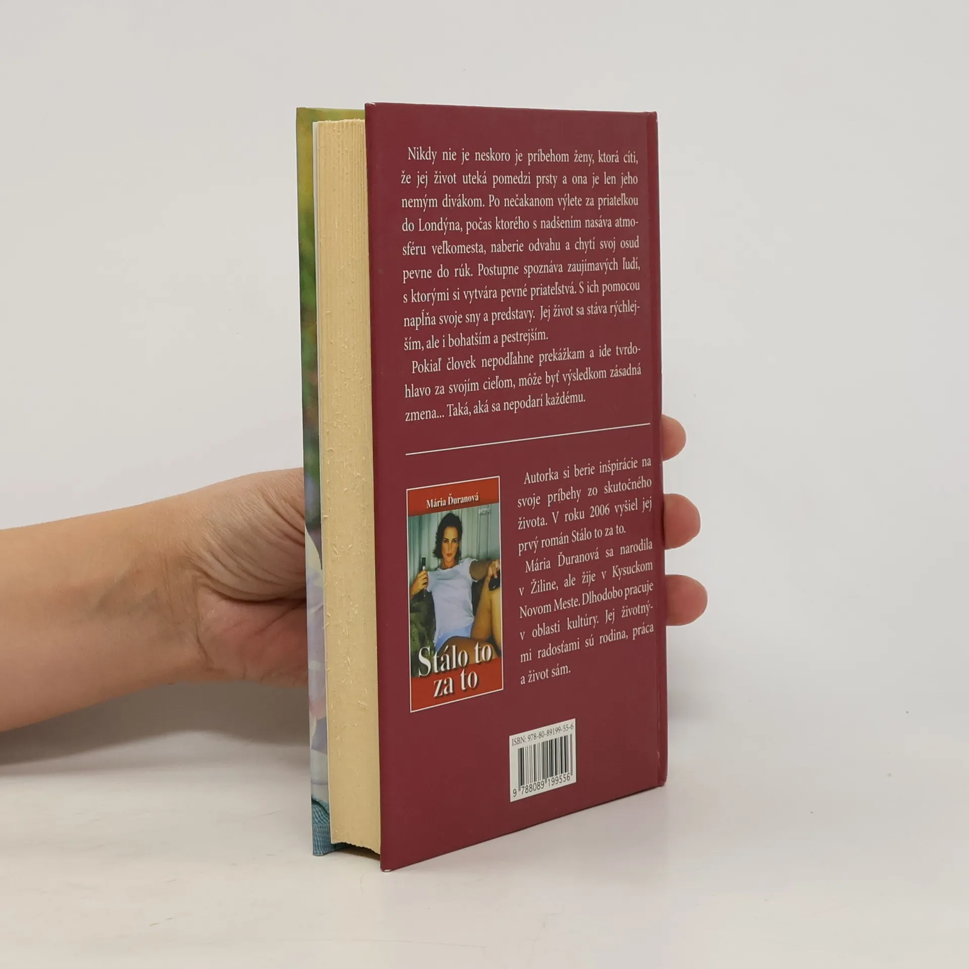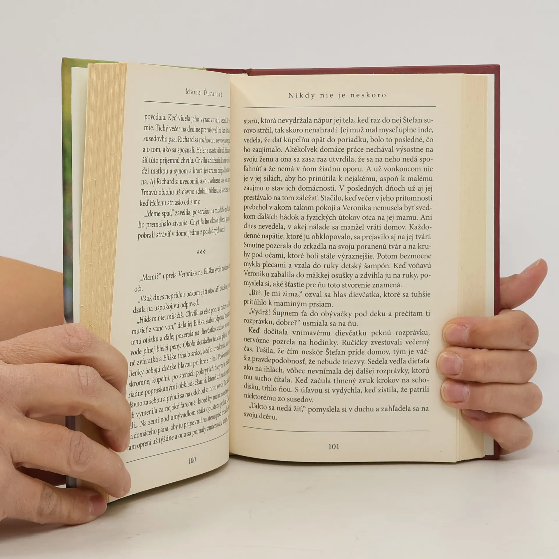 Nikdy nie je neskoro je príbehom ženy, ktorá cíti, že jej život uteká pomedzi prsty a ona je len jeho nemým divákom. Po nečakanom výlete za priateľkou do Londýna, počas ktorého s nadšením nasáva atmosféru veľkomesta, naberie odvahu a chytí svoj osud pevne do rúk. Postupne spoznáva zaujímavých ľudí, s ktorými si vytvára pevné priateľstvá. S ich pomocou napĺňa svoje sny a predstavy. Jej život sa stáva rýchlejším, ale i bohatším a pestrejším. Pokiaľ človek nepodľahne prekážkam a ide tvrdohlavo za svojím cieľom, môže byť výsledkom zásadná zmena... Taká, aká sa nepodarí každému. Autorka si berie inšpirácie na svoje príbehy zo skutočného života. V roku 2006 vyšiel jej prvý román Stálo to za to. Mária Ďuranová sa narodila v Žiline, ale žije v Kysuckom Novom Meste. Dlhodobo pracuje v oblasti kultúry. Jej životnými radosťami sú rodina, práca a život sám.