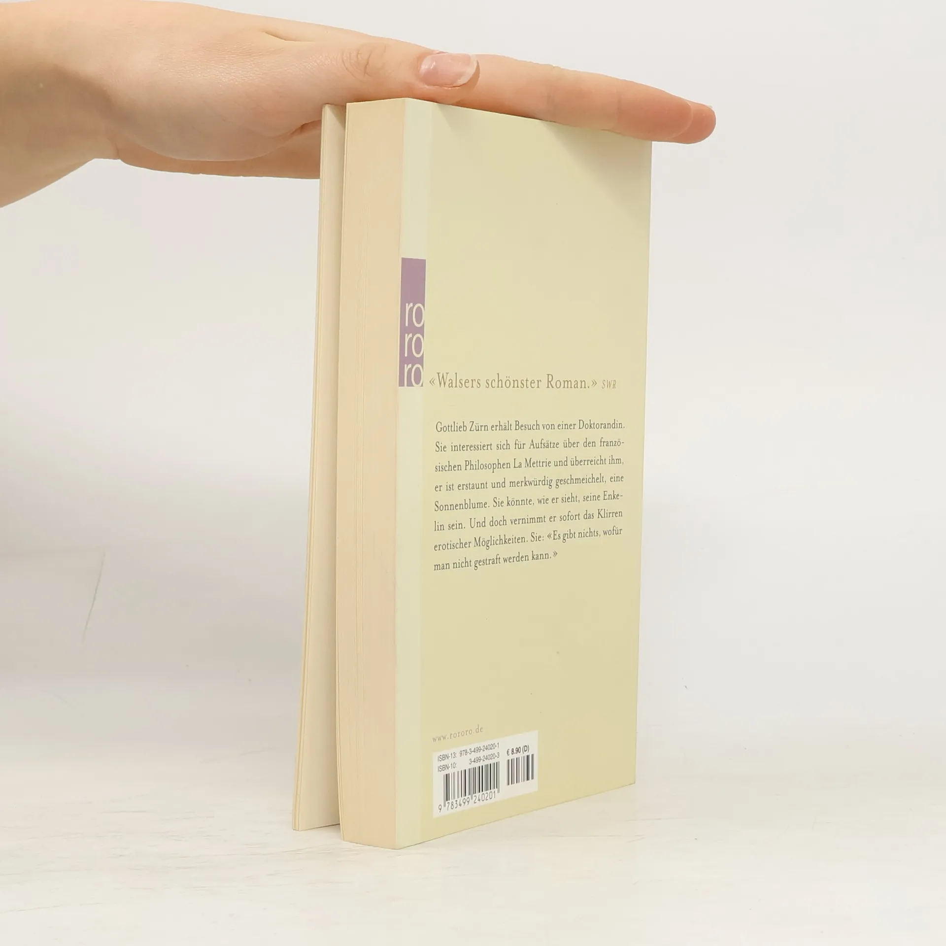 „Walsers schönster Roman.“ (Martin Lüdke, SWR)Gottlieb Zürn erhält Besuch von einer Doktorandin. Sie interessiert sich für Aufsätze über den französischen Philosophen La Mettrie und überreicht ihm, er ist erstaunt und merkwürdig geschmeichelt, eine Sonnenblume. Sie könnte, wie er sieht, seine Enkelin sein. Und doch vernimmt er sofort das Klirren erotischer Möglichkeiten. Sie: „Es gibt nichts, wofür man nicht gestraft werden kann.“ „Ein Buch, das mit literarischer Brillanz und insistierender Intelligenz der Wahrheit unserer Empfindungen nachgeht.“ (Ulrich Greiner, Die Zeit)