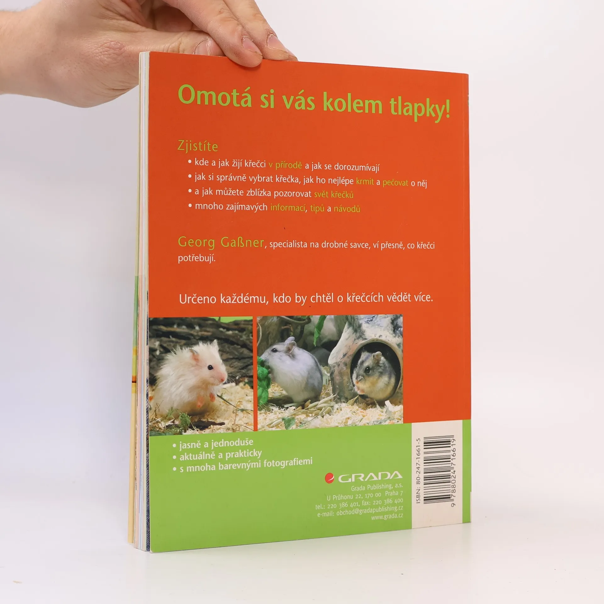 Víte, čím uděláte svému křečkovi radost? Poskytneme vám veškeré informace o tom, jak se máte o toto úžasné zvířátko starat. Dozvíte se, jaký domov křečkovi vyhovuje, jak mu klec nejlépe zařídit, aby měl dost prostoru na pohyb, hraní i na schovávání zásob. Budete vědět, jak křečka zdravě a správně krmit, jakými pamlsky jej odměňovat, jak se starat o jeho zdraví. Rozeznáte základní nemoci a budete vědět, jak poskytnou první pomoc. Jako Extra téma knihu zakončuje Dětský koutek, kde se děti dozví, jak si s křečekem užít co nejvíc legrace a jak pozorovat jeho zajímavý život. K knize je řada dalších důležitých informací, tipů a návodů Autor Georg Gaßner, specialista na drobné savce ví přesně, co křečci potřebují.... celý text