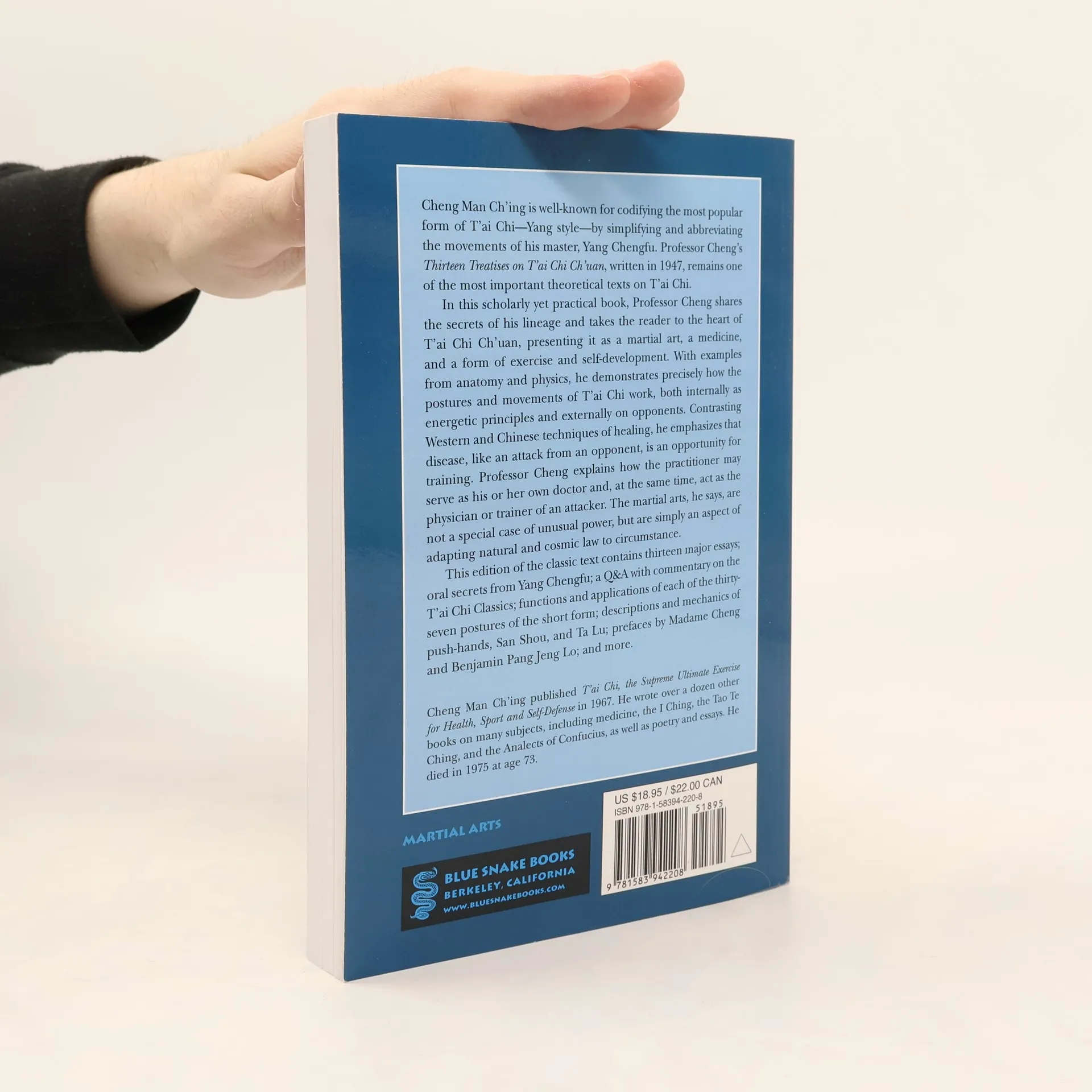 Millions of people worldwide practice t’ai chi, the most popular form of which was codified beginning in the 1960s by Cheng Man Ch’ing. In this scholarly yet practical book, Professor Cheng shows precisely how the postures and moves of t’ai chi work, with examples from anatomy and physics, both internally as energetic principles and externally on opponents. He clarifies the spheres, triangles, and centripetal and centrifugal forces within physical exchanges such as push-hands. Contrasting Western and Chinese techniques of healing, he also explores the relationships of organs to one another in pathology and the necessary dynamics of treatment. Professor Cheng explains how the practitioner may serve as his or her own doctor and, likewise, as the physician or trainer of an attacker. The martial arts, he says, are not a special case of unusual power, simply an aspect of adapting natural and cosmic law to circumstance. This edition of the classic text contains 13 major essays; oral secrets from Cheng’s teacher Yang Cheng’fu; a Q&A with commentary on martial arts classics; the author’s application and functions of each of the 37 postures of the short form, with the original photographs of him as a young man; two prefaces; and much more.