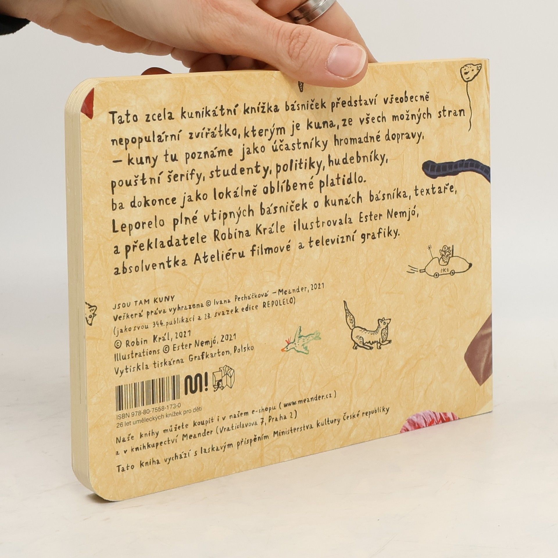 Tato zcela kunikátní knížka básniček představí všeobecně nepopulární zvířátko, kterým je kuna, ze všech možných stran – kuny tu poznáme jako účastníky hromadné dopravy, pouštní šerify, studenty, politiky, hudebníky, ba dokonce jako lokálně oblíbené platidlo. Leporelo plné vtipných básniček o kunách básníka, textaře a překladatele Robina Krále ilustrovala Ester Nemjó, absolventka Ateliéru filmové a televizní grafiky na UMPRUM.