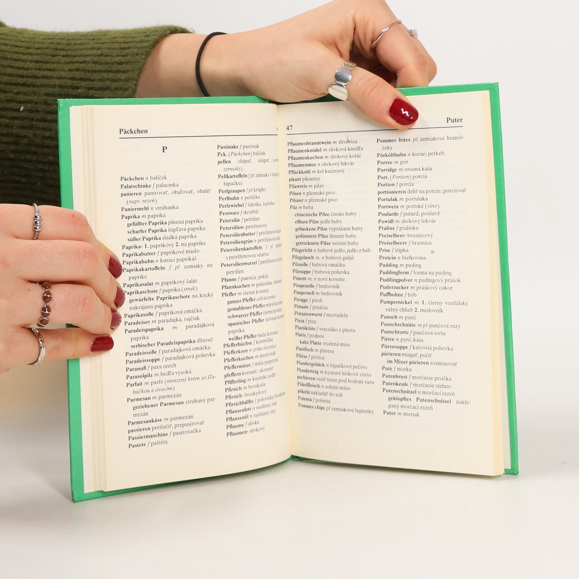 Slovníček obsahuje cca 3000 termínov používaných v kuchárskych predpisoch a to od názvu surovín (druhy mäsa, zeleniny, ovocia, korenín, húb) až po názvy základných druhov jedál (polievok, omáčok, príloh). Rozšírený je o odborné nemecké názvy kuchynských nádob, prístrojov, nástrojov a pod.