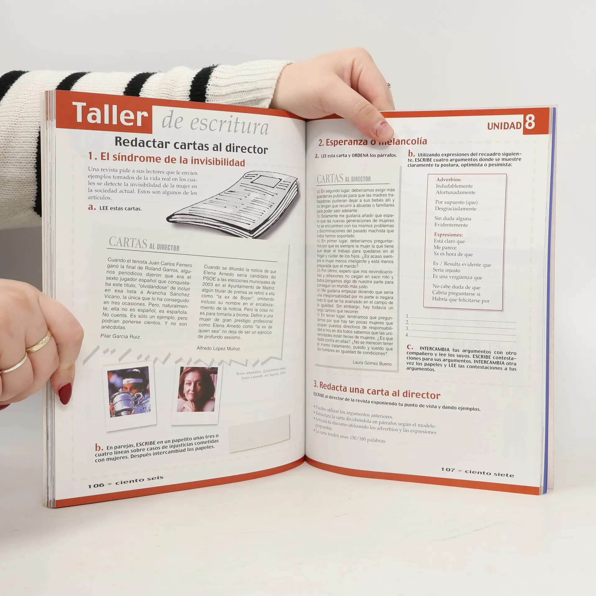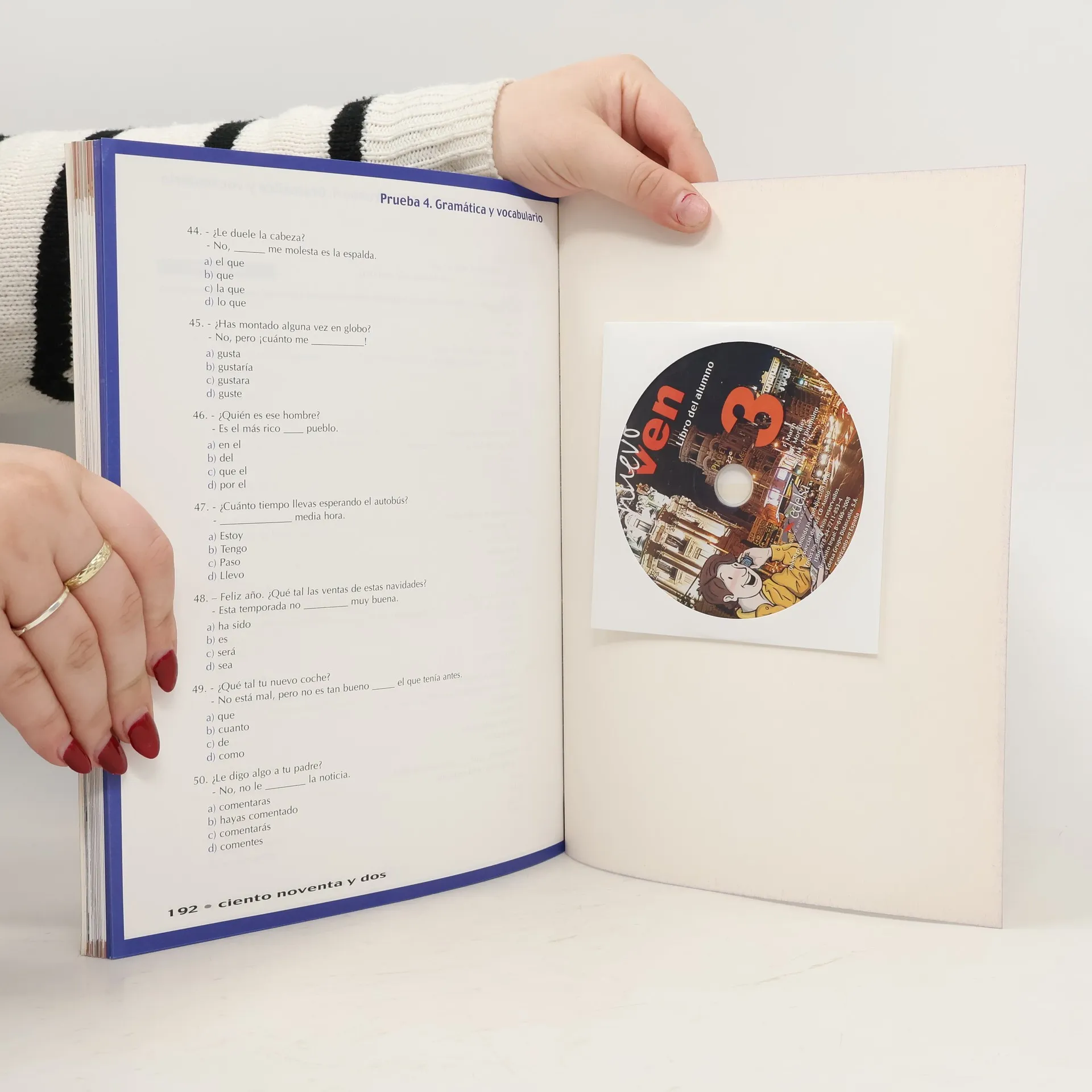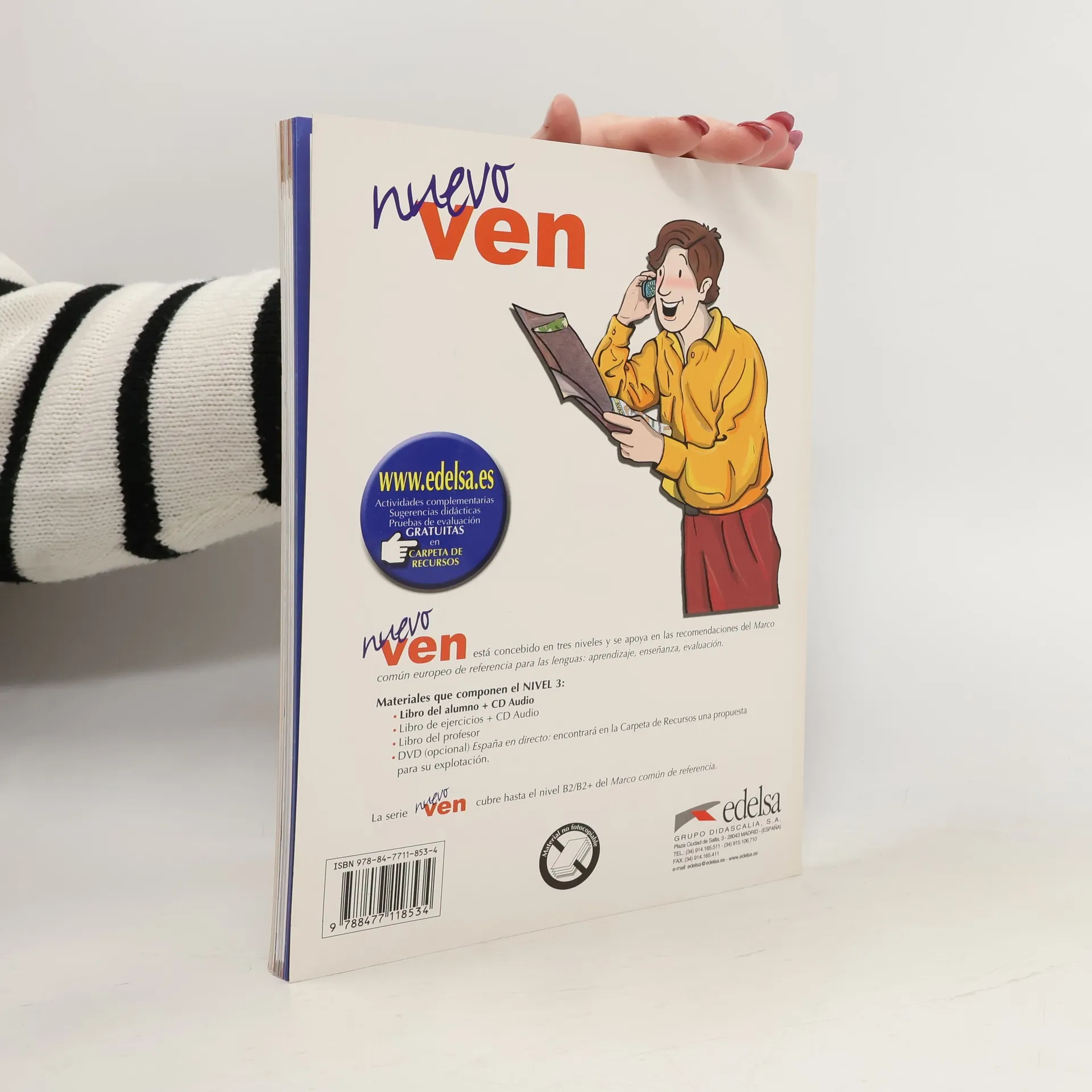 "Unidad 1". Extensión los alumnos encontrarán material de apoyo gratuito en "Zona estudiante". Corresponde a un nivel B2 del MCER. El libro empieza por una unidad 0 que ofrece al alumno un repaso comunicativo y gramatical de los puntos esenciales de Nuevo Ven 2. Se estructura en 12 unidades organizadas de acuerdo con unas secciones que responden a una clara idea del proceso de aprendizaje. Cada unidad empieza por secciones de compresión auditiva y de comprensión lectora de manera alternada en las que se trabajan diferentes tipos de textos y audiciones mediante actividades de control de la comprensión y trabajo del léxico. En la sección Lengua se consolidan las formas y estructuras gramaticales que aparecen en la unidad. En el Taller de escritura el alumno redacta diferentes tipos de escritos a partir de un modelo. En 8 de las 12 unidades aparece la Tertulia en la que los alumnos se expresan y debaten a partir del tema de la unidad. En las otras 4 unidades, el alumno descubre varias realidades socioculturales de España a través de secuencias del vídeo "España en directo". La cultura está presente en todas las secciones a través de los diferentes documentos que permiten analizar distintos fenómenos, usos o realidades de la cultura de España o Hispanoamérica. Además, al final del libro presentamos tres modelos de exámenes del DELE Intermedio.