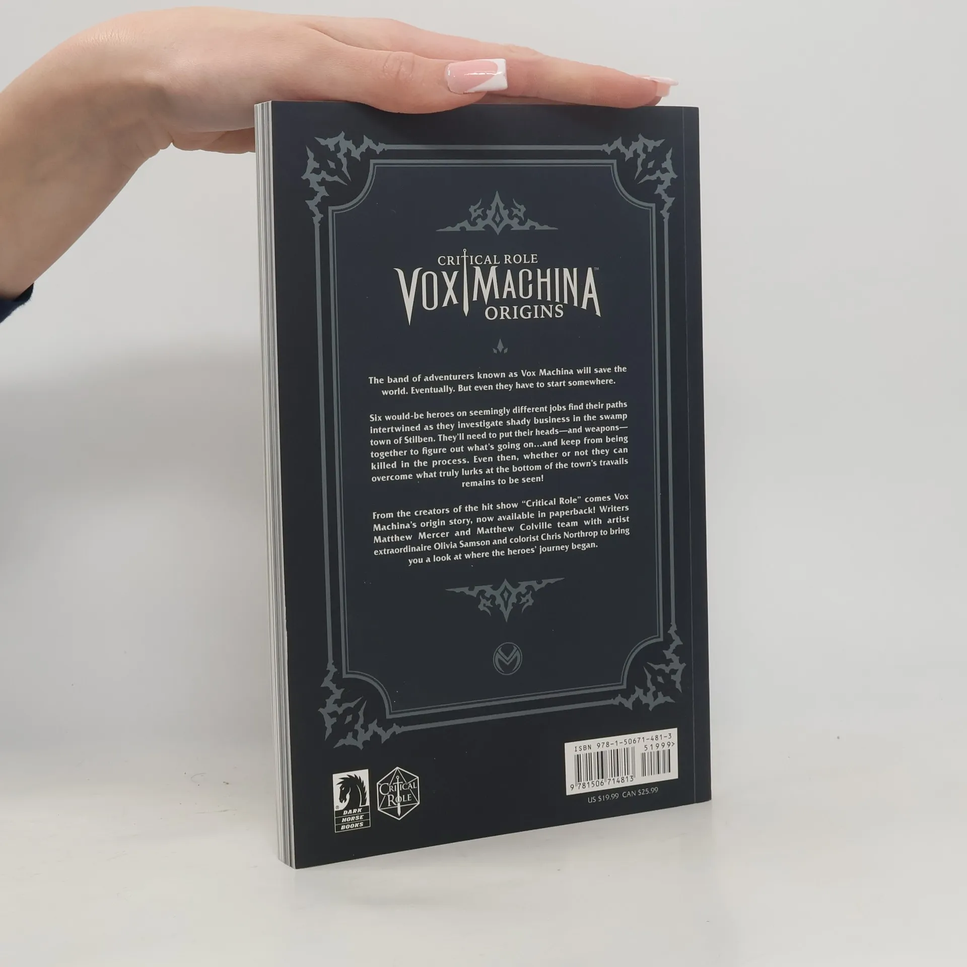 From the creators of the hit show "Critical Role" comes Vox Machina's origin story! Writers Matthew Mercer and Matthew Colville team with artist extraordinaire Olivia Samson and colorist Chris Northrop to bring you the story of where the heroes' journey began. The band of adventurers known as Vox Machina will save the world. Eventually. But even they have to start somewhere. Six would-be heroes on seemingly different jobs find their paths intertwined as they investigate shady business in the swamp town of Stilben. They'll need to put their heads-- and weapons--together to figure out what's going on...and keep from being killed in the process. Even then, whether or not they can overcome what truly lurks at the bottom of the town's travails remains to be seen! Collects Critical Role Vox Machina: Origins comics issues #1-6, one of the best selling digital comics ever!