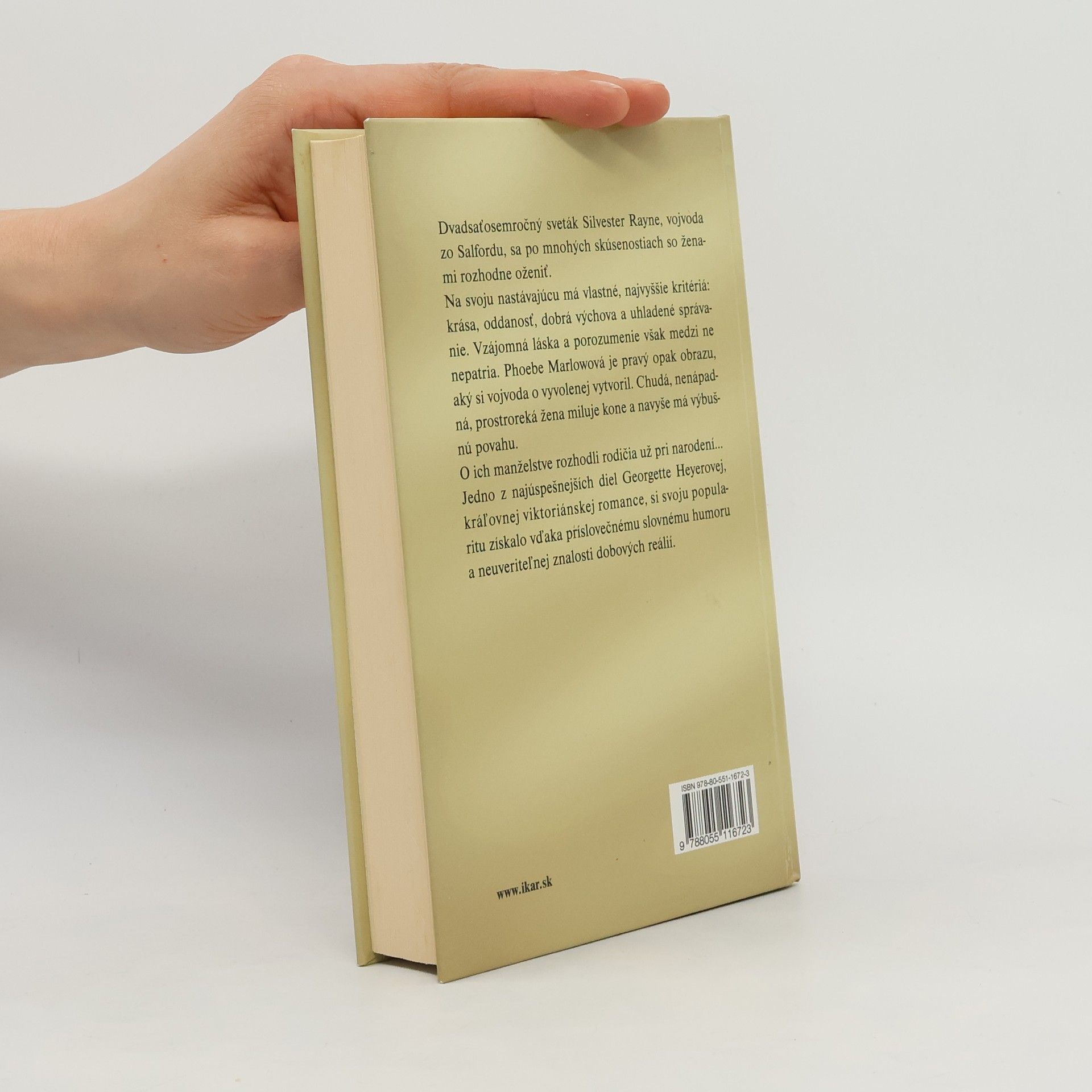 Dvadsaťosemročný sveták, Silvester Rayne, vojvoda zo Salfordu, sa po mnohých skúsenostiach so ženami rozhodne oženiť. Na svoju nastávajúcu má vlastné, najvyššie kritériá: krása, oddanosť, dobrá výchova a uhladené správanie. Vzájomná láska a porozumenie však medzi ne nepatria. Phoebe Marlowová je pravý opak obrazu, aký si vojvoda o vyvolenej vytvoril. Chudá, nenápadná, prostroreká žena miluje kone a navyše má výbušnú povahu. O ich manželstve rozhodli rodičia už pri narodení... Jedno z najúspešnejších diel Georgette Heyerovej, kráľovnej viktoriánskej romance, si svoju popularitu získalo vďaka príslovečnému slovnému humoru a neuveriteľnej znalosti dobových reálií.