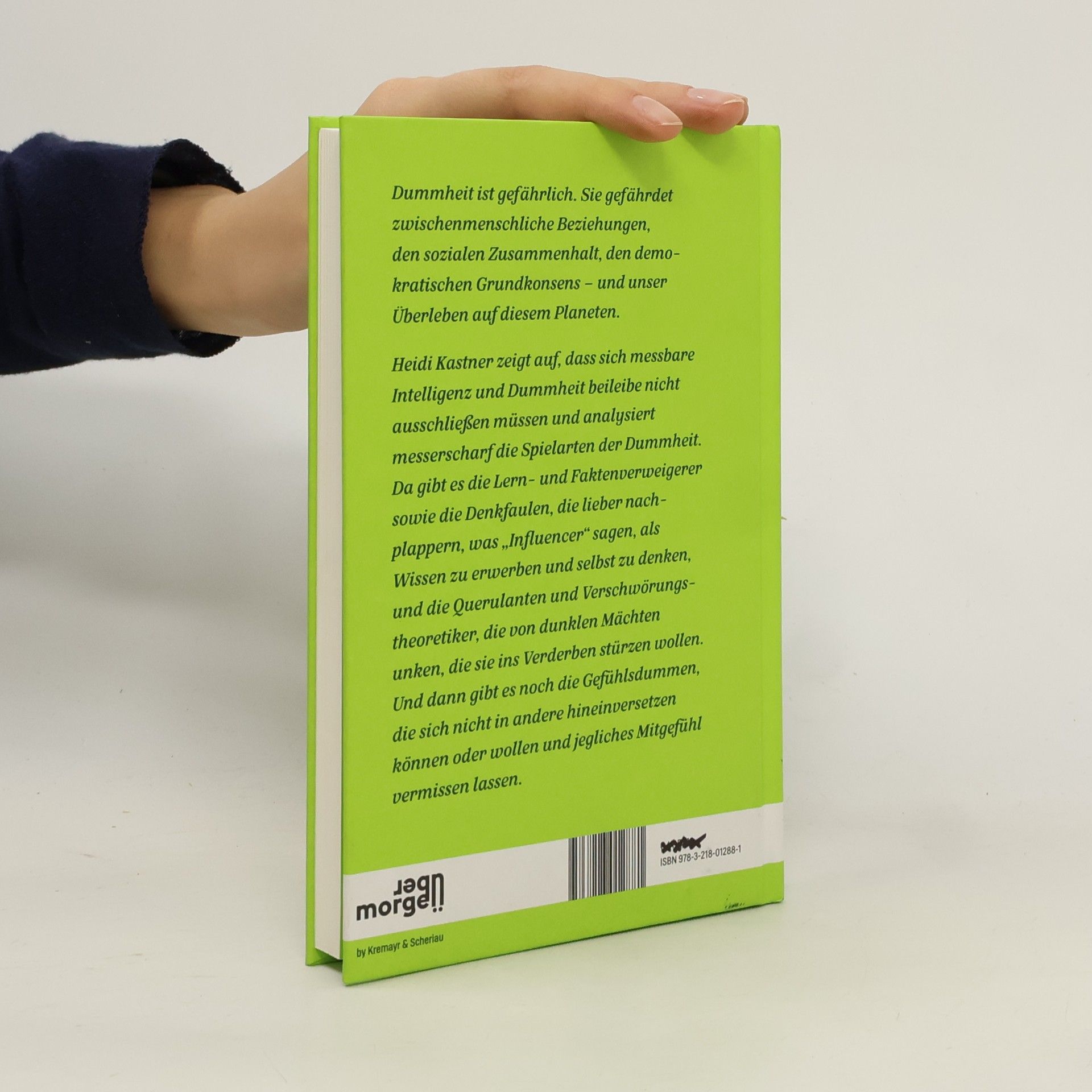„Dummheit begegnet uns in vielerlei Form – doch woran kann man sie erkennen?“ Was haben so unterschiedliche Dinge wie „alternative Fakten“, menschenleere Begegnungszonen in Satellitensiedlungen und Schönheits-OPs als Maturageschenk gemeinsam? Heidi Kastner wagt sich an den aufgeladenen Begriff der Dummheit und betrachtet sowohl die sogenannte messbare Intelligenz (IQ) sowie die „heilige Einfalt“ und die emotionale Intelligenz, deren Fehlen immensen Schaden anrichten kann. Was treibt Menschen, die an sich rational-kognitiv nachdenken könnten, dazu, sich und andere durch „dumme“ Entscheidungen ins Unglück zu stürzen? Wie ist kollektive Bereitschaft zu Ignoranz zu erklären und warum nimmt dieses Phänomen scheinbar so eklatant zu? Gibt es einen Konsens dafür, dass langfristig fatales, aber unmittelbar subjektiv vorteilhaftes Verhalten als „dumm“ anzusehen ist? Sind Abwägen und Nachdenken altmodisch? Und was um Himmels Willen ist so attraktiv am Konzept des Leithammels, der uns das Denken abnimmt, oder des Influencers, der uns den einzig wahren Weg zeigt?