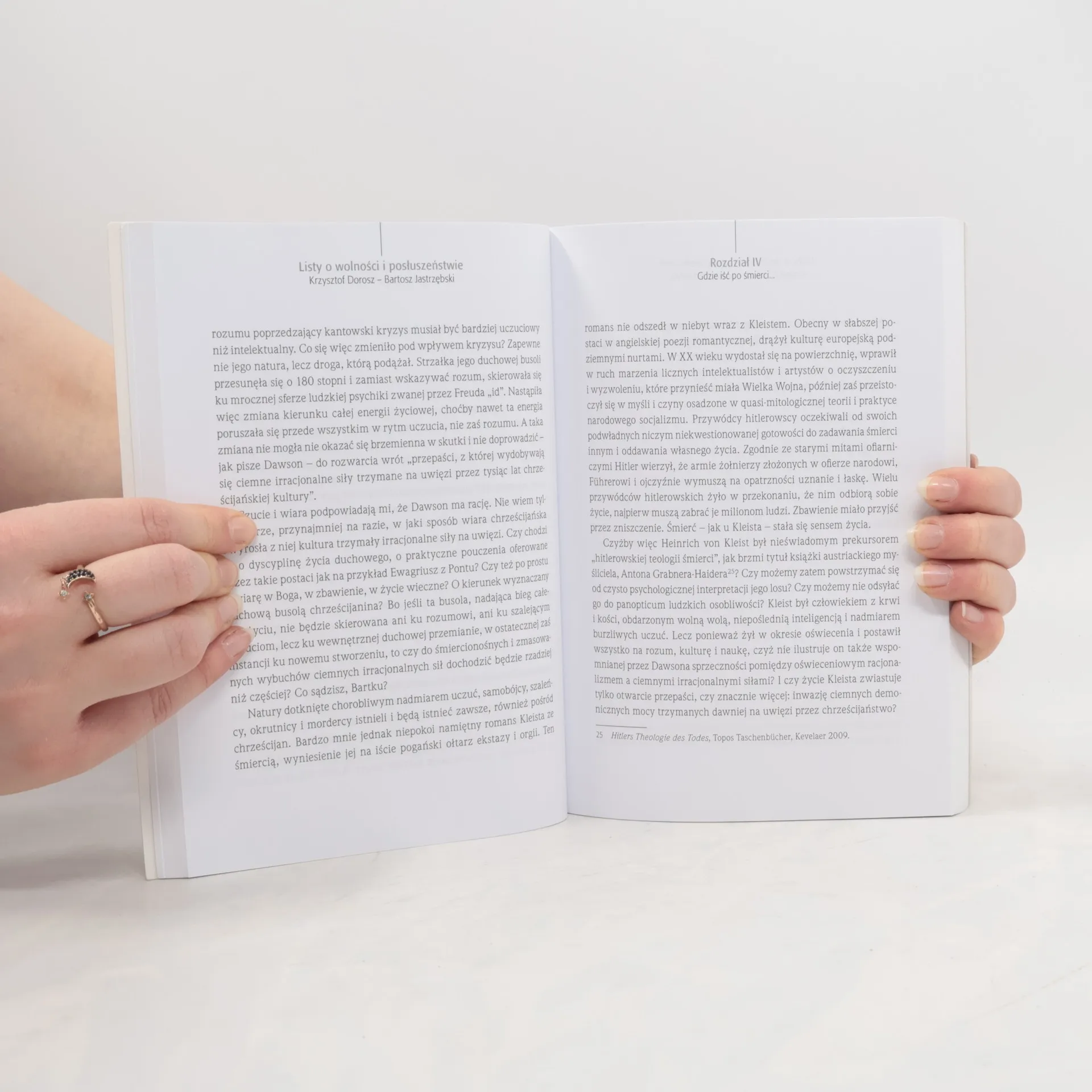 Listy o wolności i posłuszeństwie, będąc jednocześnie zaskakująco intymnym świadectwem duchowych zmagań jak i intelektualnym wyrazem zatroskania o wartości chrześcijańskie tonące w pluralizmie nowoczesnych propozycji ideowych, są dla Czytelnika prawdziwą szkołą dialogu międzyreligijnego, ale także po prostu międzyludzkiego. Zarówno Dorosz jak i Jastrzębski zwracają się nieustannie do wielkich przewodników i mistrzów, którzy kształtowali tradycję Kościoła Katolickiego oraz Protestanckiego Karla Bartha, Mistrza Eckharta czy szczególnie ciekawego w tym kontekście konwertyty J.H. Newmana. Niniejszy tom, oprócz więc wartości refleksji i wiedzy bezpośrednio w niej zawartej, niesie również naukę ukrytą między wierszami. Jest świadectwem odwagi pozwalającej wkładać klin w letnią i mdlą rzeczywistość odnawiać zagadnienia, które okazały się zbyt trudne, by mogły być modne: pytanie o pochodzenie zła, wolną wolę, łaskę.
