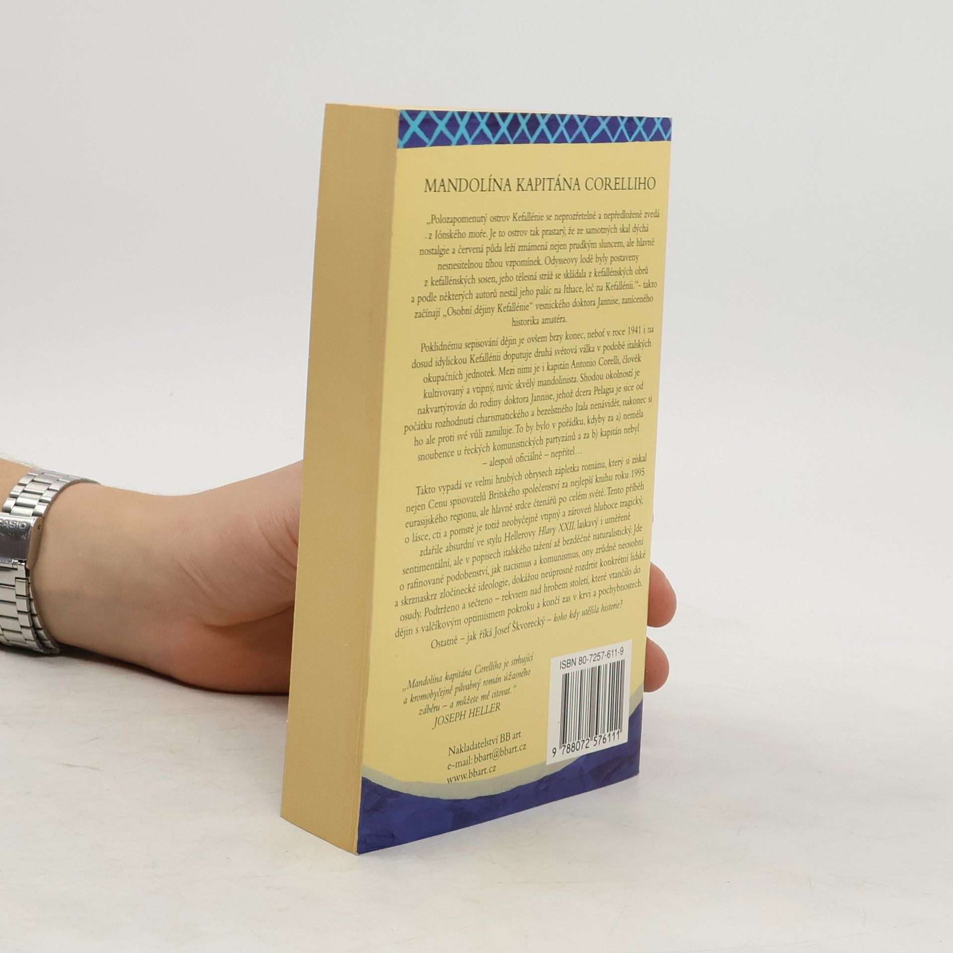 Kefallénie, zapomenutý ostrov v Iónském moři, dýchá nostalgií a vzpomínkami. Odysseovy lodě byly postaveny z místních sosen, a podle některých autorů jeho palác stál právě zde. Takto začíná „Osobní dějiny Kefallénie“ od vesnického doktora Jannise, nadšeného historika amatéra. Poklidné sepisování dějin však brzy přeruší příchod druhé světové války v roce 1941, kdy na ostrov dorazí italské okupační jednotky. Mezi nimi je kapitán Antonio Corelli, kultivovaný a vtipný mandolinista, který se ubytuje u rodiny doktora Jannise. Jeho dcera Pelagia se rozhodne, že charismatického Itala nenávidí, ale nakonec si ho proti své vůli zamiluje. Problémem je, že má snoubence mezi řeckými komunistickými partyzány a Corelli je oficiálně nepřítel. Tento román, oceněný Cenou spisovatelů Britského společenství, kombinuje humor s tragédií a absurdností. V popisech italského tažení je naturalistický a nabízí rafinované podobenství o tom, jak nacismus a komunismus devastují lidské osudy. Příběh je rekviem nad stoletím, které začalo s optimismem pokroku a končí v krvi a pochybnostech. Jak říká Josef Škvorecký, koho kdy utěšila historie?