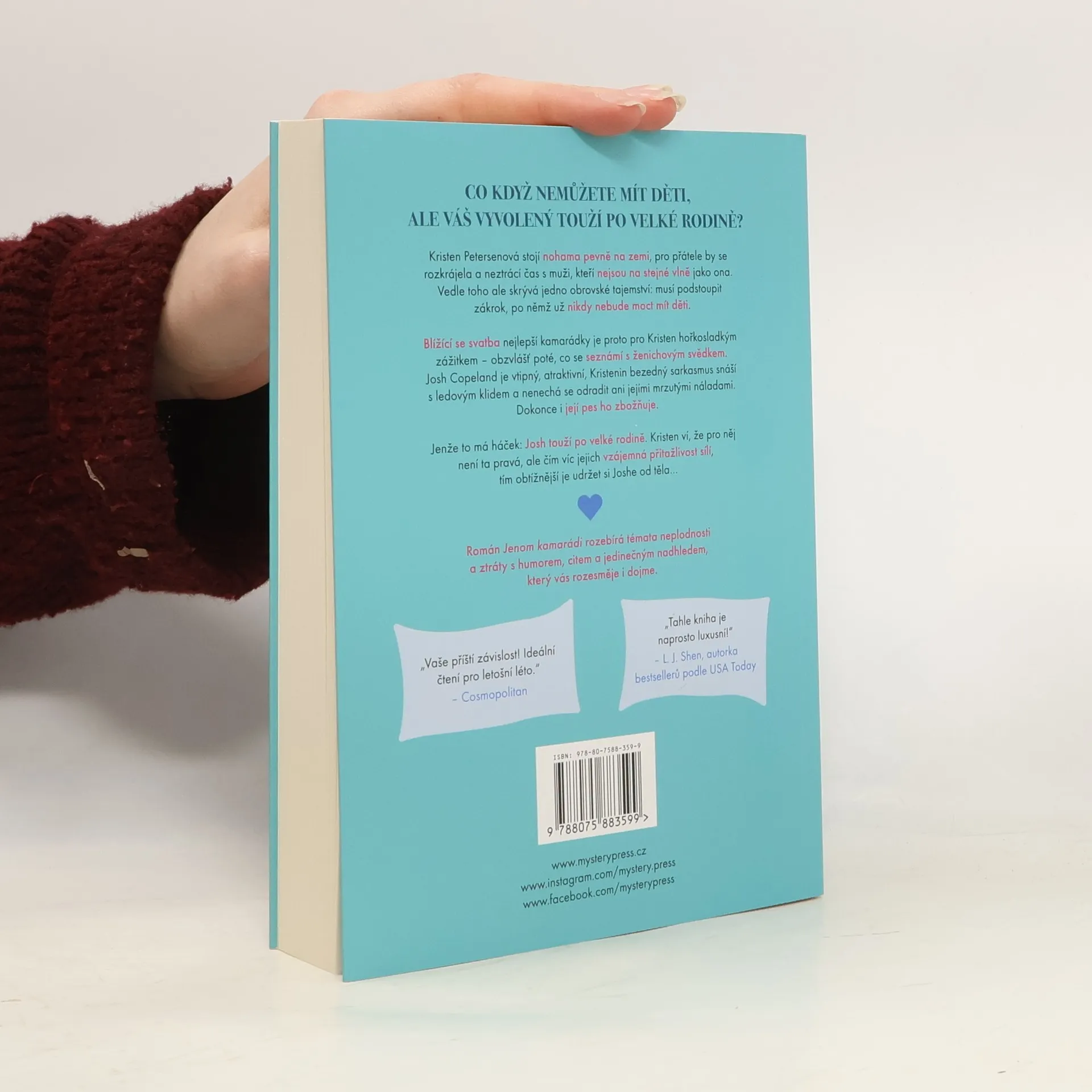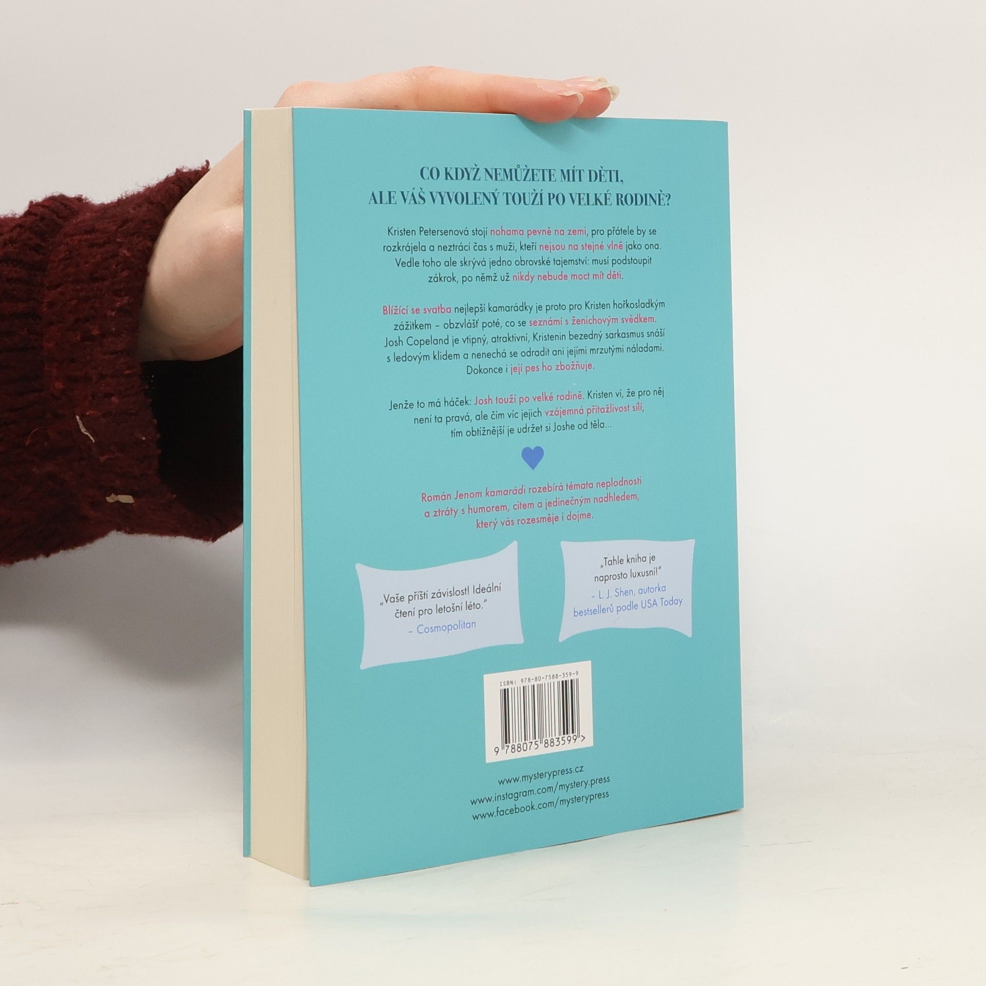 CO KDYŽ NEMŮŽETE MÍT DĚTI, ALE VÁŠ VYVOLENÝ TOUŽÍ PO VELKÉ RODINĚ? Kristen Petersenová stojí nohama pevně na zemi, pro přátele by se rozkrájela a neztrácí čas s muži, kteří nejsou na stejné vlně jako ona. Vedle toho ale skrývá jedno obrovské tajemství: musí podstoupit zákrok, po němž už nikdy nebude moct mít děti. Blížící se svatba nejlepší kamarádky je proto pro Kristen hořkosladkým zážitkem – obzvlášť poté, co se seznámí s ženichovým svědkem. Josh Copeland je vtipný, atraktivní, Kristenin bezedný sarkasmus snáší s ledovým klidem a nenechá se odradit ani jejími mrzutými náladami. Dokonce i její pes ho zbožňuje. Jenže to má háček: Josh touží po velké rodině. Kristen ví, že pro něj není ta pravá, ale čím víc jejich vzájemná přitažlivost sílí, tím obtížnější je udržet si Joshe od těla…