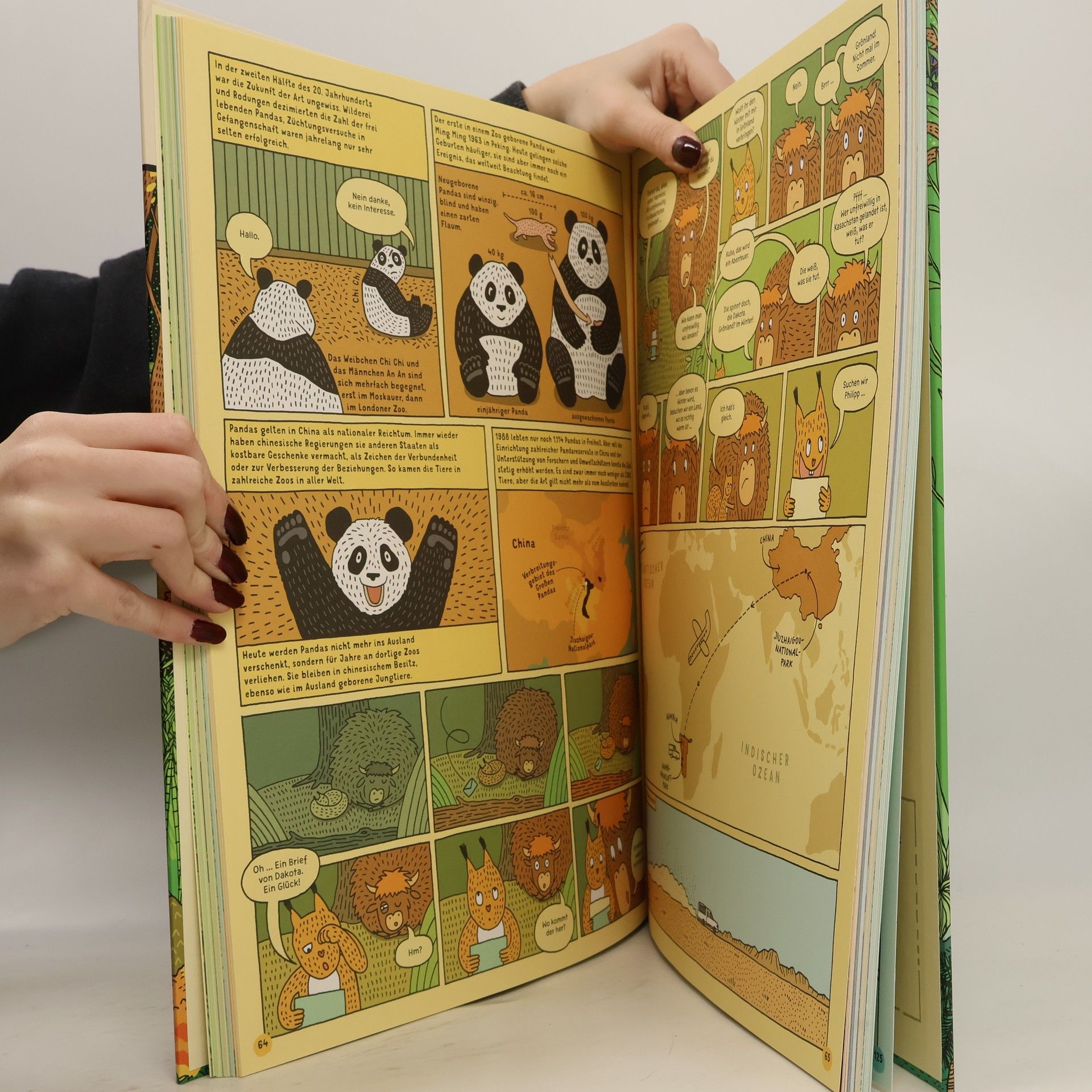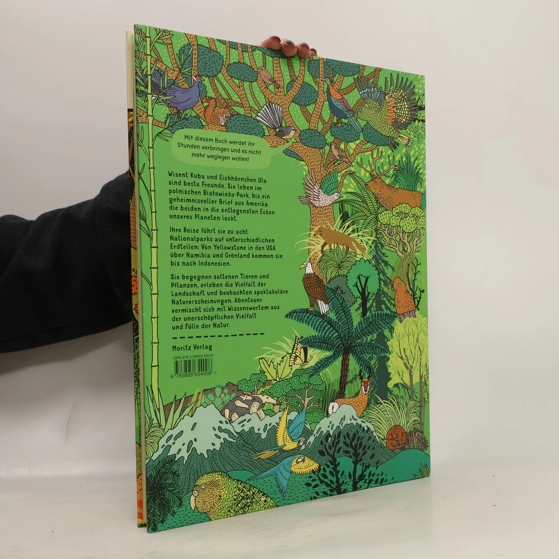 Der Wunsch, die Umwelt zu bewahren, steht am Anfang eines jeden Nationalparks. Ausgehend vom polnischen Białowieza-Park wird acht von ihnen ein Besuch abgestattet – eine Reise über die Kontinente beginnt. Dabei folgen wir dem Wisent Kuba und dem Eichhörnchen Ula zu sieben Parks von Peru über China, Namibia, Grönland, Indonesien, Neuseeland und Wyoming. Eine ungeheure Themenvielfalt zeigt Blattschneiderameisen und Komodowarane, erklärt Polarnacht und Permafrost, spricht die Erosion und das Überleben in der Wüste an. Zusammengehalten wird das Buch durch eine Comicgeschichte, die auch WenigleserInnen bei der Stange hält. So ist dem polnischen Grafikerpaar nach »Alle Welt. Das Landkartenbuch« und »Unter der Erde/Tief im Wasser« wieder ein beeindruckendes Buch im Großformat gelungen, mit dem sie auf ihrer Suche nach der optimalen Darbietungsform von Kindersachbüchern noch ein Stück weiter vorangekommen sind. Und nicht nur das: Zum ersten Mal gibt es ergänzend zu einem ihrer Bücher einen kurzen Animationsfilm: Darin erfahren Kuba und Ula, wie ein natürlicher Waldbrand entstehen kann und was dieser für Tiere und Pflanzen bedeutet. https://youtu.be/r5Z4hoke8MY