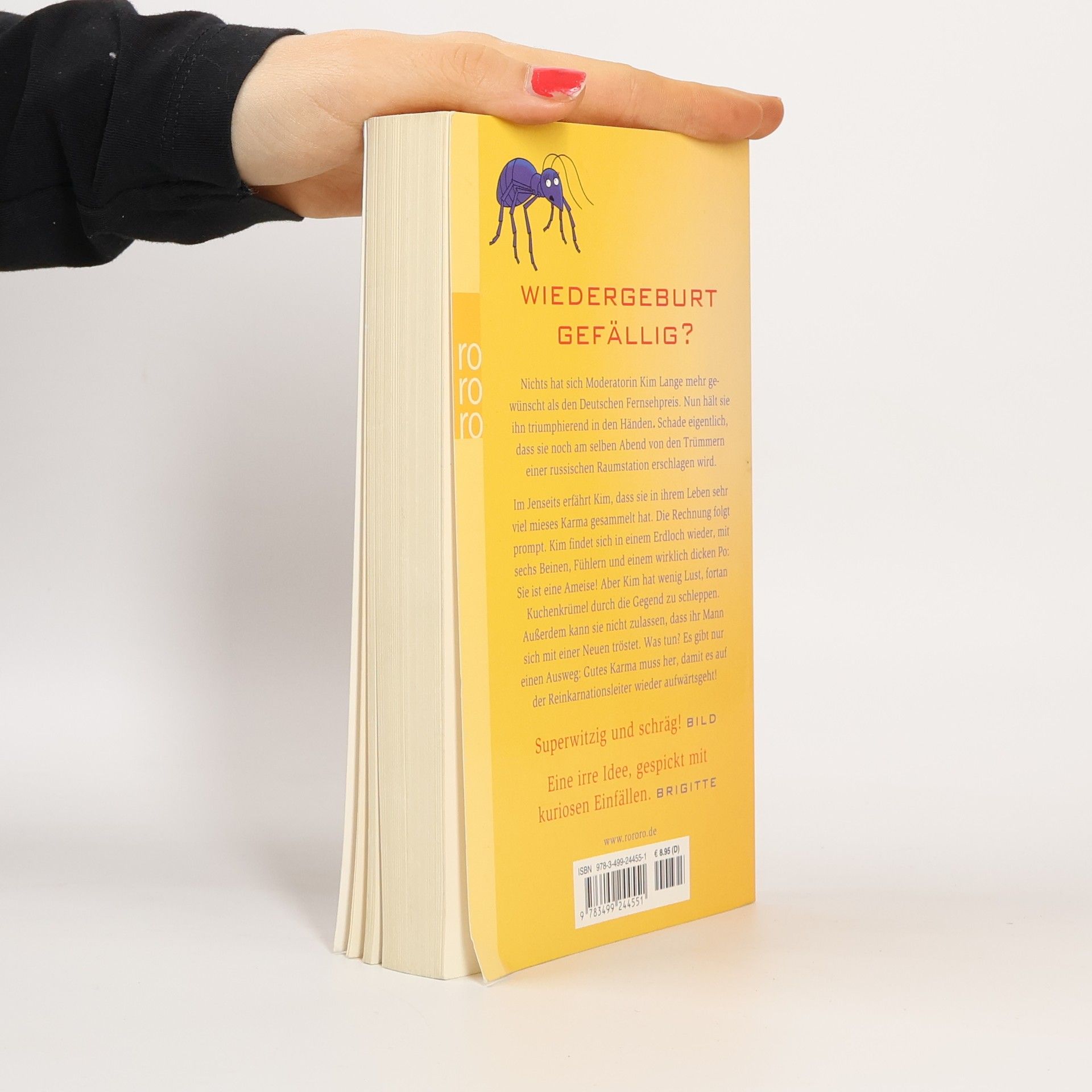 Wiedergeburt gefällig? Nichts hat sich Moderatorin Kim Lange mehr gewünscht als den deutschen Fernsehpreis. Nun hält sie ihn triumphierend in den Händen. Schade eigentlich, dass sie noch am selben Abend von den Trümmern einer russischen Raumstation erschlagen wird.Im Jenseits erfährt Kim, dass sie in ihrem Leben sehr viel mieses Karma gesammelt hat. Die Rechnung folgt prompt. Kim findet sich in einem Erdloch wieder, mit sechs Beinen, Fühlern und einem wirklich dicken Po: Sie ist eine Ameise! Aber Kim hat wenig Lust, fortan Kuchenkrümel durch die Gegend zu schleppen. Außerdem kann sie nicht zulassen, dass ihr Mann sich mit einer Neuen tröstet. Was tun? Es gibt nur einen Ausweg: Gutes Karma muss her, damit es auf der Reinkarnationsleiter wieder aufwärts geht! «Superwitzig und schräg!» (Bild) «Eine irre Idee, gespickt mit kuriosen Einfällen.» (Brigitte)