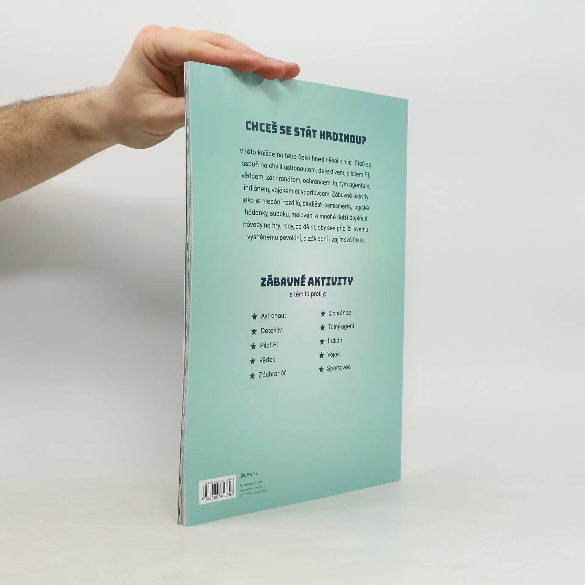 Chceš se stát hrdinou? V této knížce na tebe čeká hned několik misí. Staň se aspoň na chvíli astronautem, detektivem, pilotem F1, vědcem, záchranářem, ochráncem, tajným agentem, indiánem, vojákem či sportovcem. Zábavné aktivity jako je hledání rozdílů, bludiště, osmisměrky, logické hádanky, sudoku, malování a mnohé další doplňují návody na hry, rady co dělat, aby ses přiblížil svému vysněnému povolání, a základní i zajímavá fakta.