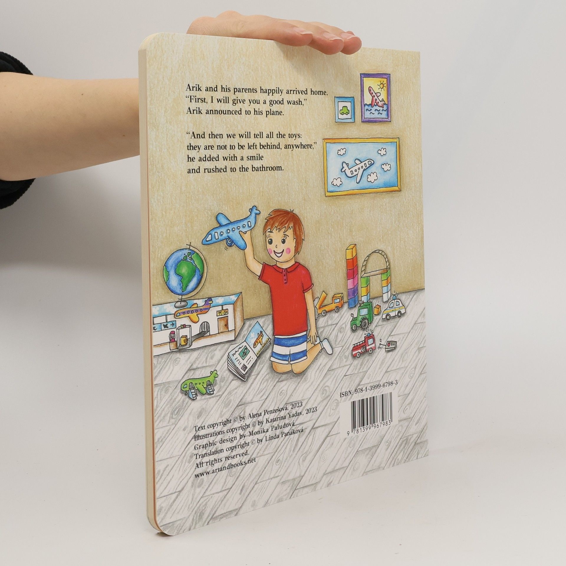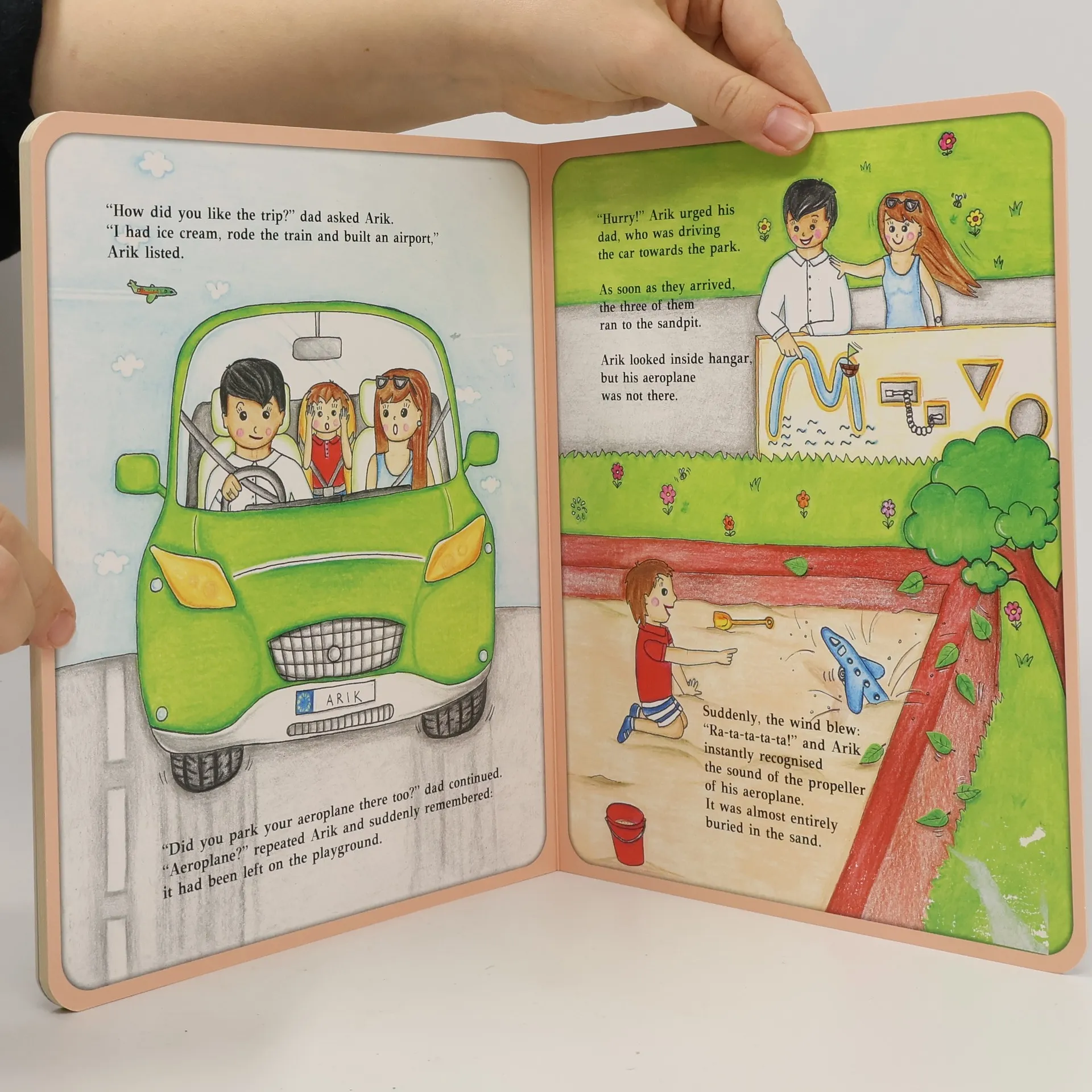 Arik is looking forward to today’s trip. So, he packs his favourite aeroplane. Together with his mommy they first visit the park, where Arik plays with children, from there they get an ice cream and also hop on a tourist train which takes them straight to Arik’s daddy. Thanks to Daddy, Arik remembers his aeroplane. It was left in the park on the sandpit. Arik is worried if the aeroplane will still be there. Luckily, with the help of his parents he finds the aeroplane and they all return home satisfied and happy.