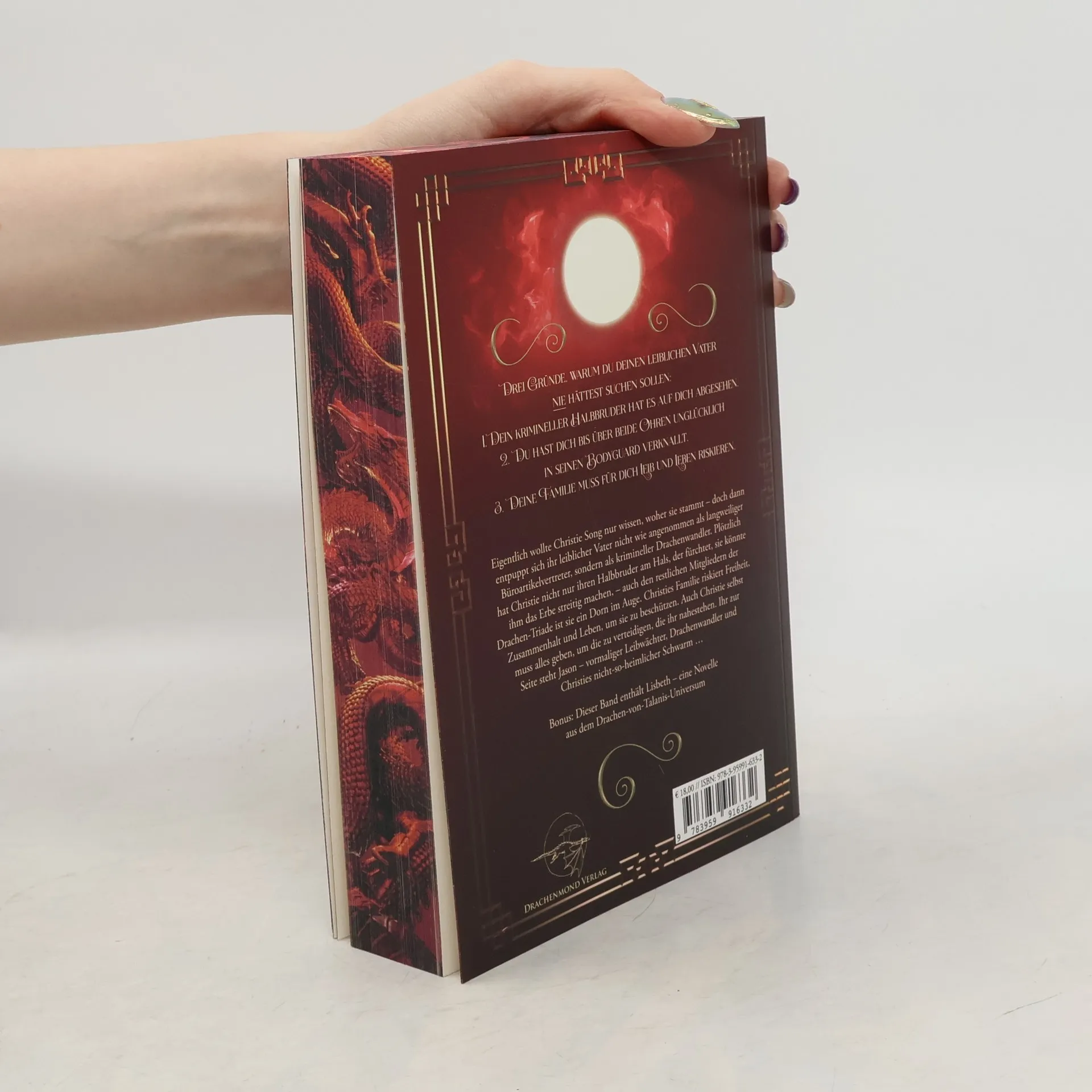 Drei Gründe, warum du deinen leiblichen Vater nie hättest suchen sollen: 1. Dein krimineller Halbbruder hat es auf dich abgesehen.2. Du hast dich bis über beide Ohren unglücklich in seinen Bodyguard verknallt.3. Deine Familie muss für dich Leib und Leben riskieren.Eigentlich wollte Christie Song nur wissen, woher sie stammt – doch dann entpuppt sich ihr leiblicher Vater nicht wie angenommen als langweiliger Büroartikelvertreter, sondern als krimineller Drachenwandler. Plötzlich hat Christie nicht nur ihren Halbbruder am Hals, der fürchtet, sie könnte ihm das Erbe streitig machen, – auch den restlichen Mitgliedern der Drachen-Triade ist sie ein Dorn im Auge. Christies Familie riskiert Freiheit, Zusammenhalt und Leben, um sie zu beschützen. Auch Christie selbst muss alles geben, um die zu verteidigen, die ihr nahestehen. Ihr zur Seite steht Jason – vormaliger Leibwächter, Drachenwandler und Christies nicht-so-heimlicher Schwarm …Bonus: Dieser Band enthält Lisbeth – eine Novelle aus dem Drachen-von-Talanis-Universum