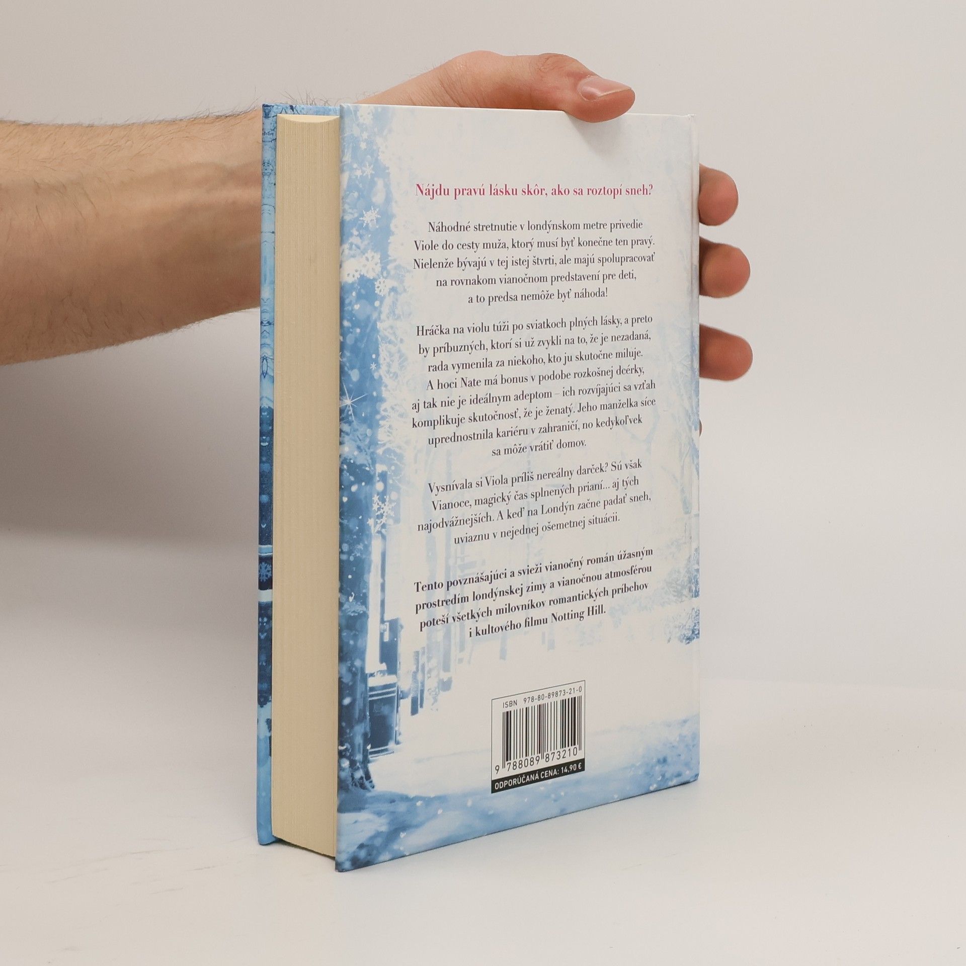 Náhodné stretnutie v londýnskom metre privedie Viole do cesty muža, ktorý musí byť konečne ten pravý. Nielenže bývajú v tej istej štvrti, ale majú spolupracovať na rovnakom vianočnom predstavení pre deti, a to predsa nemôže byť náhoda! Hráčka na violu túži po sviatkoch plných lásky, a preto by príbuzných, ktorí si už zvykli na to, že je nezadaná, rada vymenila za niekoho, kto ju skutočne miluje. A hoci Nate má bonus v podobe rozkošnej dcérky, aj tak nie je ideálnym adeptom - ich rozvíjajúci sa vzťah komplikuje skutočnosť, že je ženatý. Jeho manželka síce uprednostnila kariéru v zahraničí, no kedykoľvek sa môže vrátiť domov. Vysnívala si Viola príliš nereálny darček? Sú však Vianoce, magický čas splnených prianí. .. aj tých najodvážnejších. A keď na Londýn začne padať sneh, uviaznu v nejednej ošemetnej situácii. Tento povznášajúci a svieži vianočný román úžasným prostredím londýnskej zimy a vianočnou atmosférou poteší všetkých milovníkov romantických príbehov i kultového filmu Notting Hill.