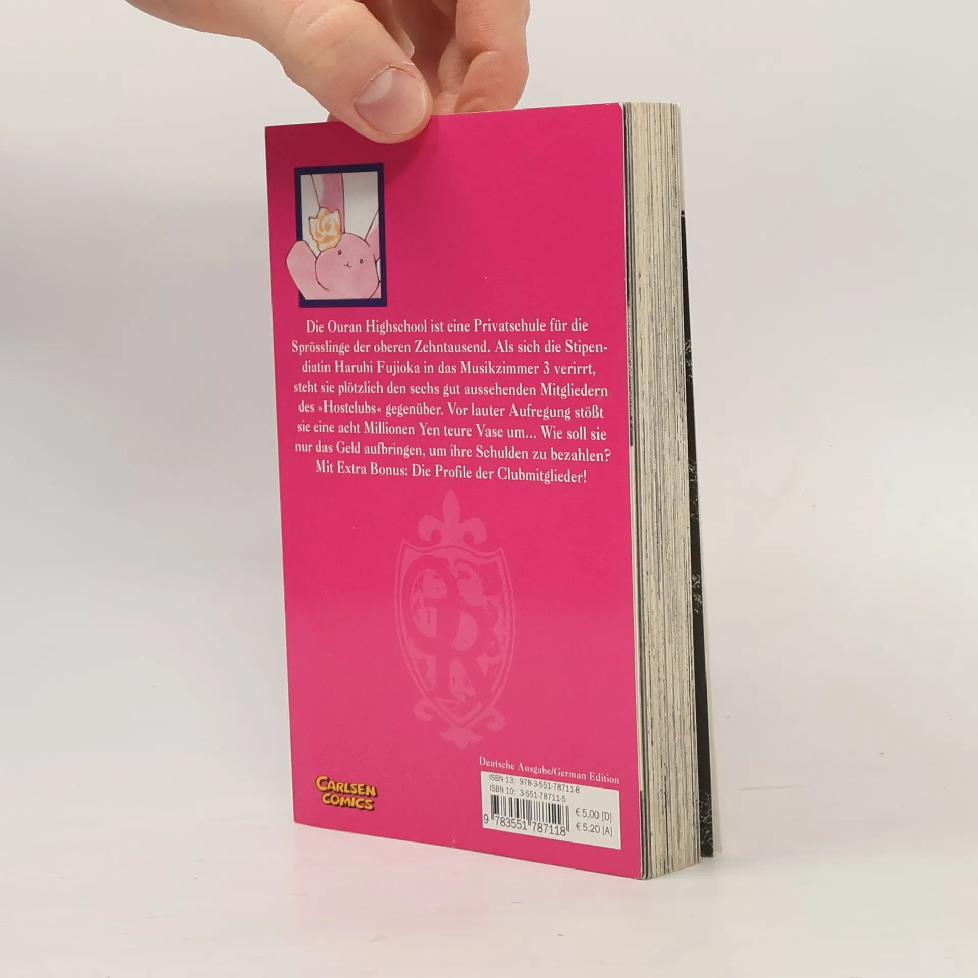 Die Ouran Highschool ist eine Privatschule für die Sprösslinge der oberen Zehntausend. Als sich die Stipendiatin Haruhi Fujioka in das Musikzimmer 3 verirrt, steht sie plötzlich den sechs gut aussehenden Mitgliedern des »Hostclubs« gegenüber. Vor lauter Aufregung stößt sie eine acht Millionen Yen teure Vase um Wie soll sie nur das Geld aufbringen, um ihre Schulden zu bezahlen? Mit Extra Bonus: Die Profile der Clubmitglieder!
