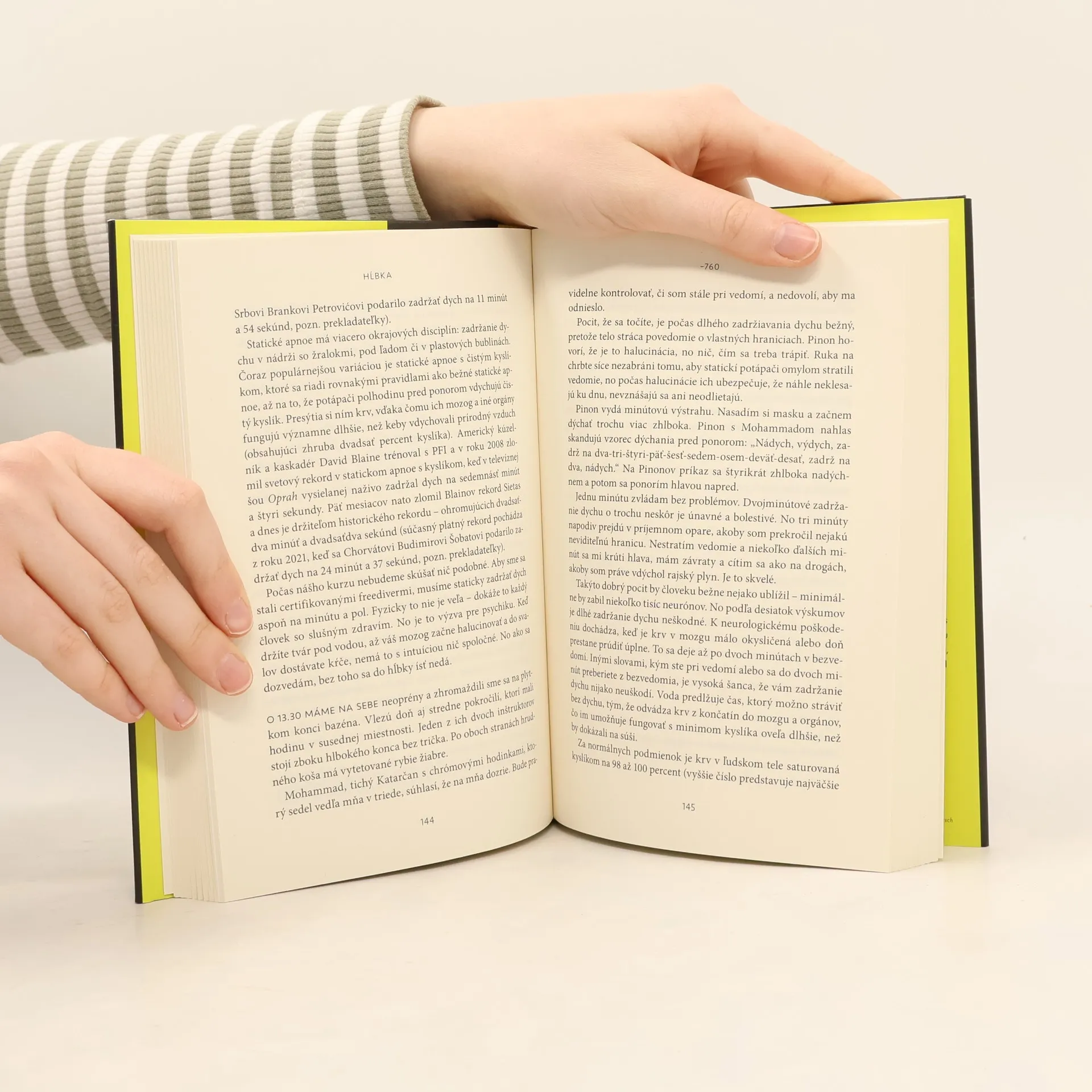 Keď bol novinár James Nestor na služobnej ceste v Grécku, bol svedkom niečoho, čo ho zmiatlo: muž sa na jeden nádych ponoril 300 metrov pod hladinu a po štyroch minútach sa vrátil späť, nezranený a usmiaty. Tento muž bol freediver a jeho obojživelné schopnosti inšpirovali Nestora, aby pátral po tajomstvách tejto málo známej disciplíny. Hĺbka je putovaním z hladiny oceánu do jeho najtemnejších hlbín, najzáhadnejších miest na planéte Zem. Nestor sa pridá k partii extrémnych športovcov a rebelských vedcov, ktorí menia nielen naše poznatky o planéte a jej tvoroch, ale aj naše chápanie ľudského tela a mysle. Zavedie nás do hĺbky 8,5 metra pod hladinu Atlantického oceánu a zoznámi nás s veľrybami, ktoré komunikujú s inými veľrybami vzdialenými stovky kilometrov, žralokmi, ktoré plávajú neomylne priamo cez čierno-čierne hlbiny vody, tulene, ktoré sa ponárajú až na osemdesiat minút do hĺbok pod 730 metrov, a ukáže nám aj iné zvláštne fenomény. Najpoučnejšie zo všetkého je, že tieto schopnosti sú odrazom pozoruhodného a často skrytého potenciálu nášho vlastného druhu – vrátane echolokácie, orientačného zmyslu a pod vodou navyše dochádza aj k iným významným telesným zmenám. Nestor cestou odomyká vlastné freedivingové zručnosti, keď sa dá dokopy s priekopníkmi, ktorí rozširujú definíciu toho, čo je možné v prírode a v nás samých.