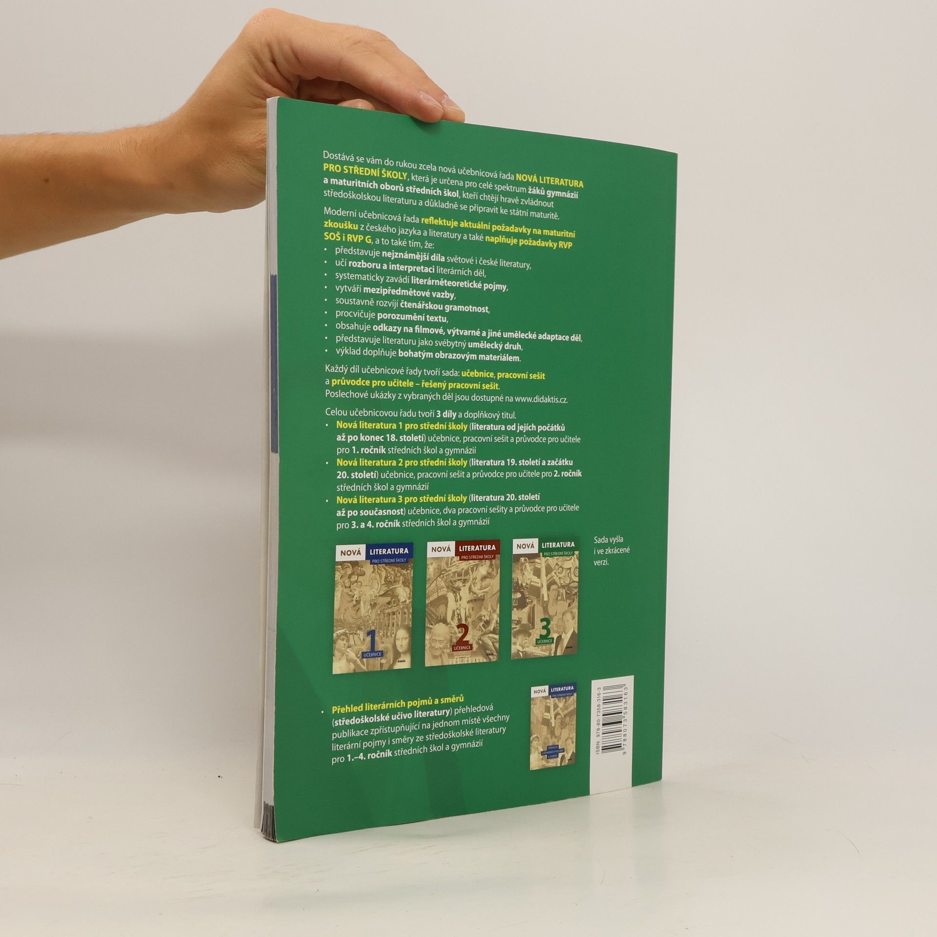 Pracovní sešity přímo navazují na učebnici. V každé jejich části naleznete úlohy seřazené od těch nejjednodušších faktografických až po náročnější úlohy pracující s konkrétním výňatkem z literárního díla, u nichž je třeba textu porozumět, vnímat ho v kontextu díla a interpretovat jeho dílčí části i celek. Úlohy jsou velmi pestré, což podporuje různé způsoby uvažování i odlišné postupy při zpracování informací. Vedle prostého zápisu řešení se dopisují do textů vynechané údaje, opravují se faktické chyby, doplňují se tabulky či schémata, pracuje se s obrazovým materiálem a řada úloh vychází i z poslechových ukázek. Za každou kapitolou se pak nachází dvoustrana opakování, která umožní ověřit si nabyté vědomosti, příp. odhalit nedostatky. Cíle pracovních sešitů Nová literatura 3 pro střední školy jsou: ověřit znalost učiva z výkladu v učebnici a rozvíjet u žáků schopnost analyzovat umělecký text připravit žáky ke společné části maturity (do pracovního sešitu jsou pravidelně zařazovány typy testových úloh užívané v ostrých maturitních testech a při analýzách výňatků uměleckých textů se operuje s kategoriemi ústní zkoušky, např. s časem, prostorem, kompozicí, vypravěčem, veršovou výstavbou, uměleckými prostředky apod.) rozvíjet čtenářskou gramotnost žáků motivovat žáky k četbě, vytvořit u nich kladný vztah k literatuře a ke čtenářství