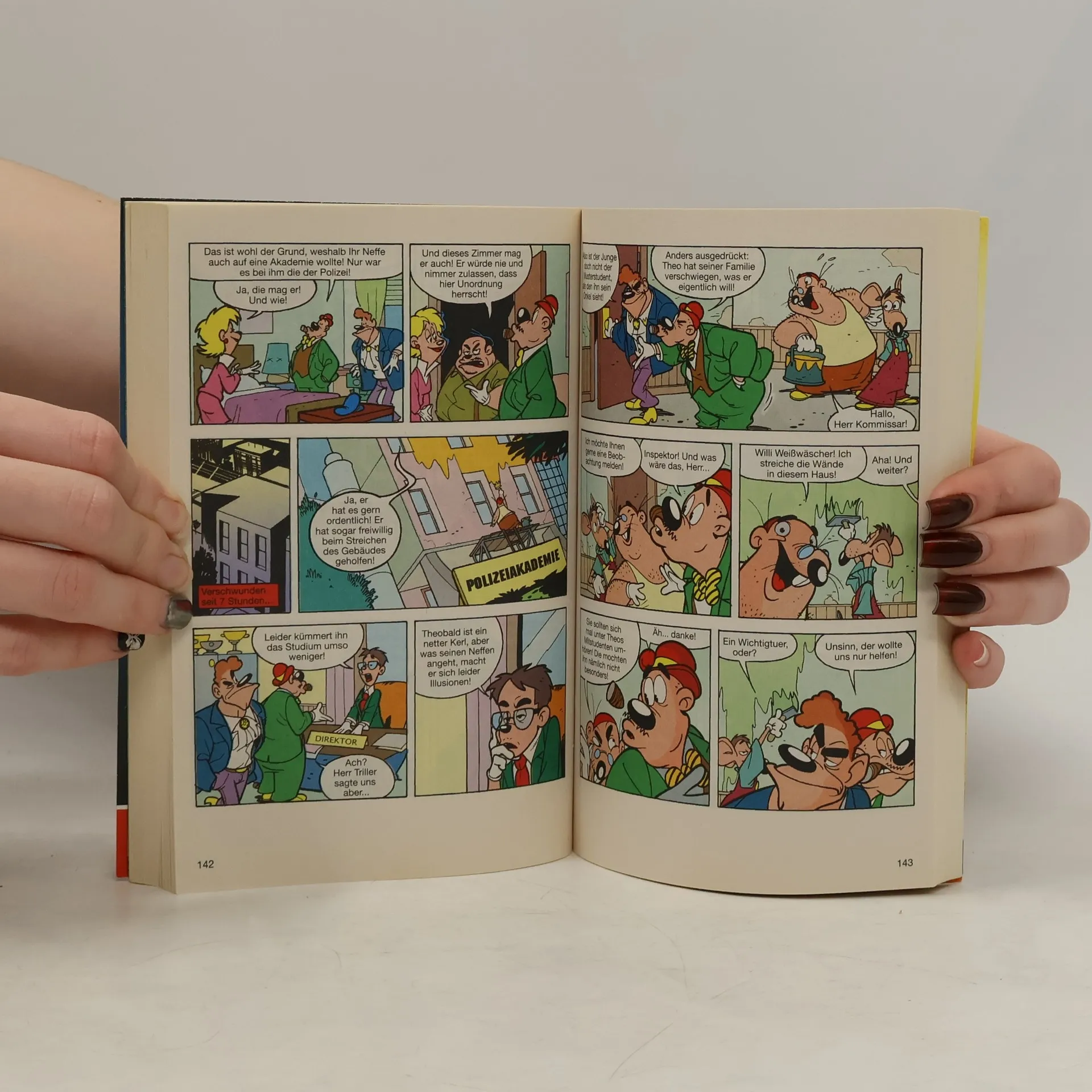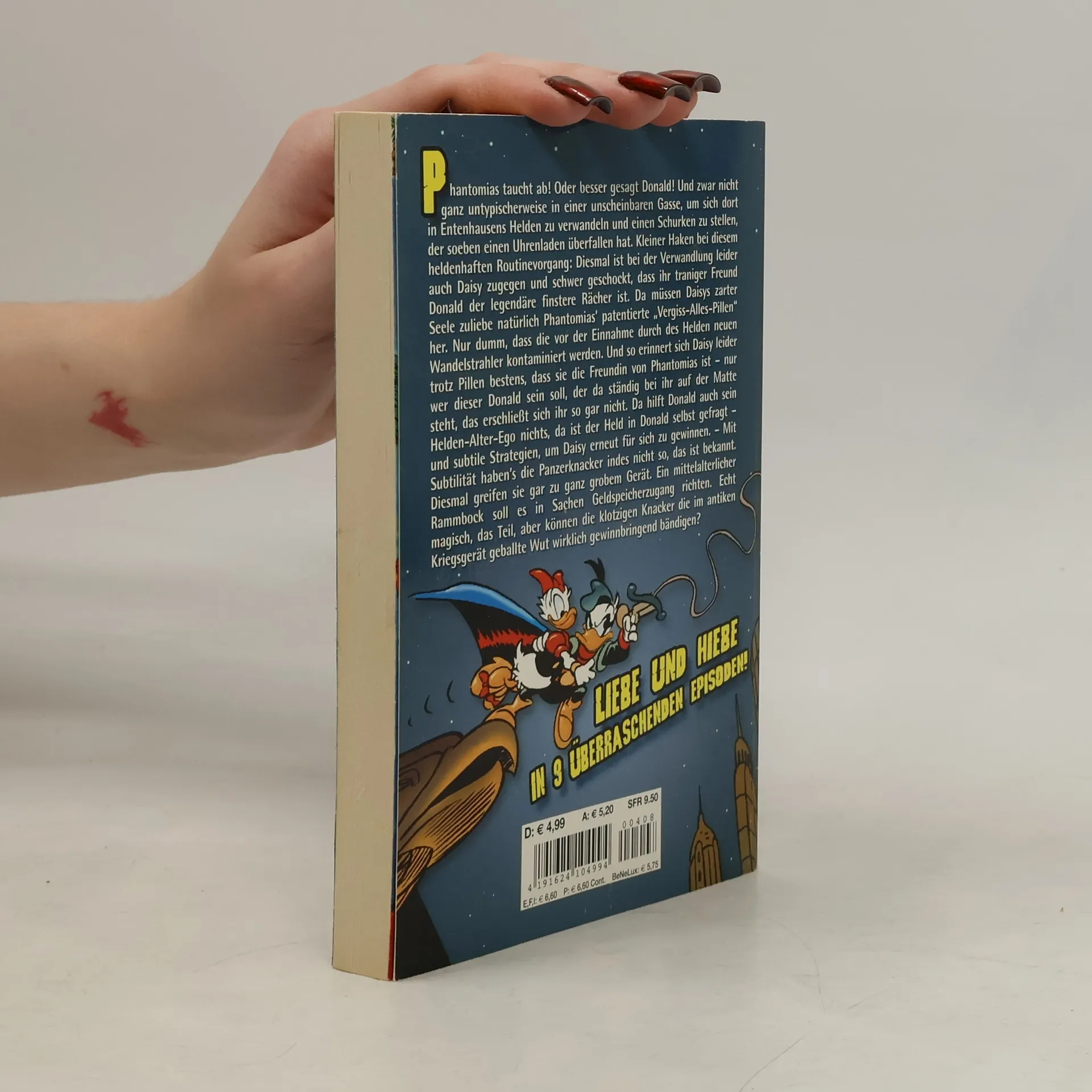 Phantomias taucht ab! Oder besser gesagt Donald! Und zwar nicht ganz untypischerweise in einer unscheinbaren Gasse, um sich dort in Entenhausens Helden zu verwandeln und einen Schurken zu stellen, der soeben einen Uhrenladen überfallen hat. Kleiner Haken bei diesem heldenhaften Routinevorgang: Diesmal ist bei der Verwandlung leider auch Daisy zugegen und schwer geschockt, dass ihr traniger Freund Donald der legendäre finstere Rächer ist. Da müssen Daisys zarter Seele zuliebe natürlich Phantomias’ patentierte „Vergiss-Alles-Pillen“ her. Nur dumm, dass die vor der Einnahme durch des Helden neuen Wandelstrahler kontaminiert werden. Und so erinnert sich Daisy leider trotz Pillen bestens, dass sie die Freundin von Phantomias ist – nur wer dieser Donald sein soll, der da ständig bei ihr auf der Matte steht, das erschließt sich ihr so gar nicht. Da hilft Donald auch sein Helden-Alter-Ego nichts, da ist der Held in Donald selbst gefragt – und subtile Strategien, um Daisy erneut für sich zu gewinnen. – Mit Subtilität haben’s die Panzerknacker indes nicht so, das ist bekannt. Diesmal greifen sie gar zu ganz grobem Gerät. Ein mittelalterlicher Rammbock soll es in Sachen Geldspeicherzugang richten. Echt magisch, das Teil, aber können die klotzigen Knacker die im antiken Kriegsgerät geballte Wut wirklich gewinnbringend bändigen?Liebe und Hiebe in 9 überraschenden Episoden!