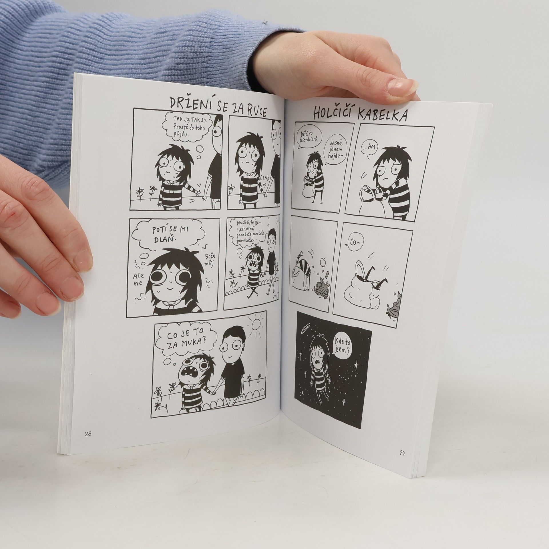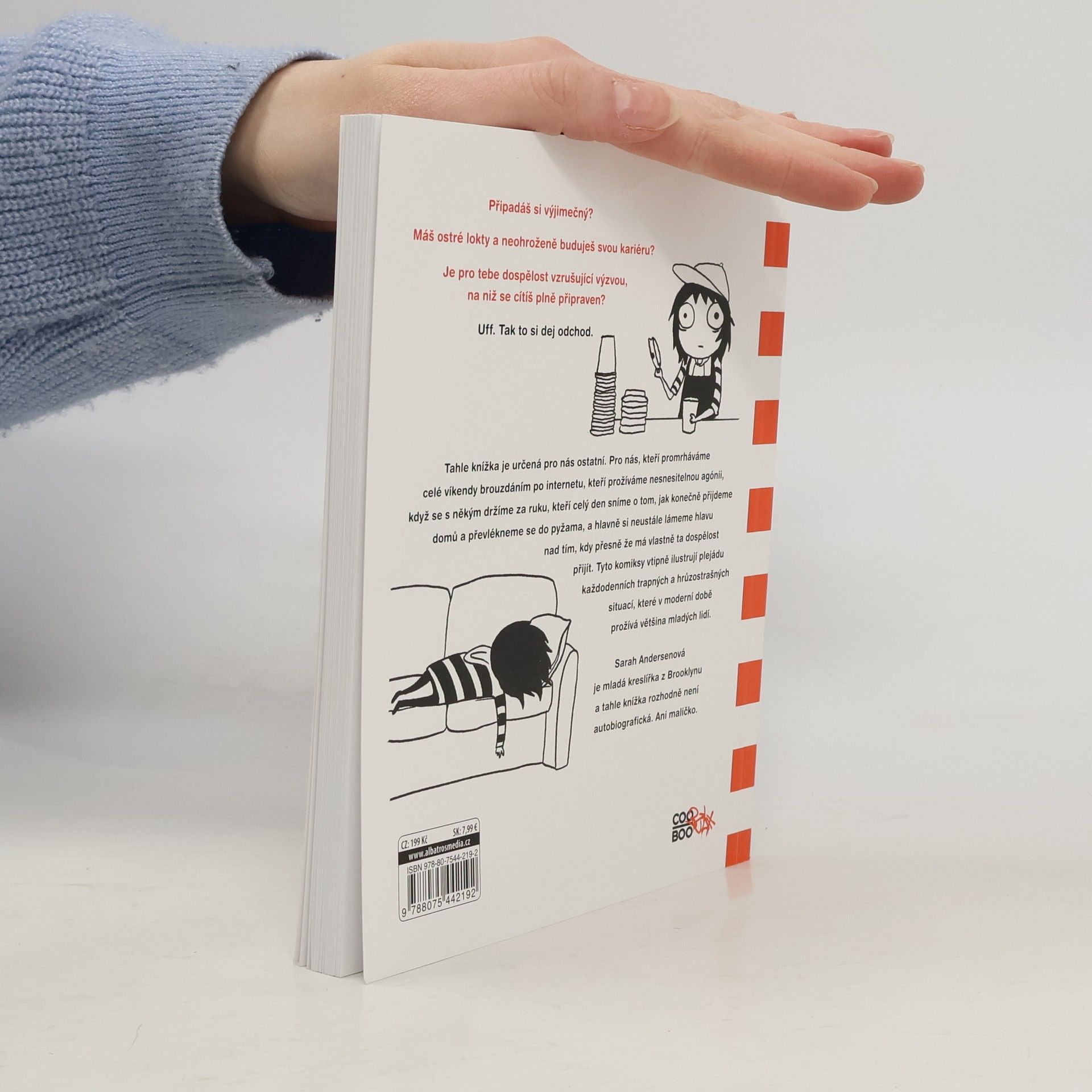 Tenhle komiks je pro všechny, kdo dokážou proflákat celé víkendy na internetu, pro které je držení se za ruce na ulici s naprosto úchvatným klukem nesnesitelná agónie, pro všechny, kdo sní o tom, že celý den zůstanou doma a budou se válet v pyžamu. A pro všechny, kdo přemýšlejí, kdy přesně vlastně ta dospělost začíná. Jinými slovy pro nás, kteří prožíváme hrůzy a trapnosti dnešního mladého života. Připadáš si výjimečný? Máš ostré lokty a neohroženě buduješ svou kariéru? Je pro tebe dospělost vzrušující výzvou, na niž se cítíš plně připravený? Uff. Tak to si dej odchod. Tahle knížka je určená pro nás ostatní, Pro nás, kteří promrháváme celé víkendy brouzdáním po internetu, kteří prožíváme nesnesitelnou agónii, když se s někým držíme za ruku, kteří celý den sníme o tom, jak konečně přijdeme domů a převlékneme se do pyžama, a hlavně si neustále lámeme hlavu nad tím, kdy přesně že má vlastně dospělost přijít. Tyto komiksy vtipně ilustrují plejádu každodenních trapných a hrůzostrašných situací, které v moderní době prožívá většina mladých lidí. Sarah Andersenová je mladá kreslířka z Brooklynu a tahle knížka rozhodně není autobiografická. Ani maličko.