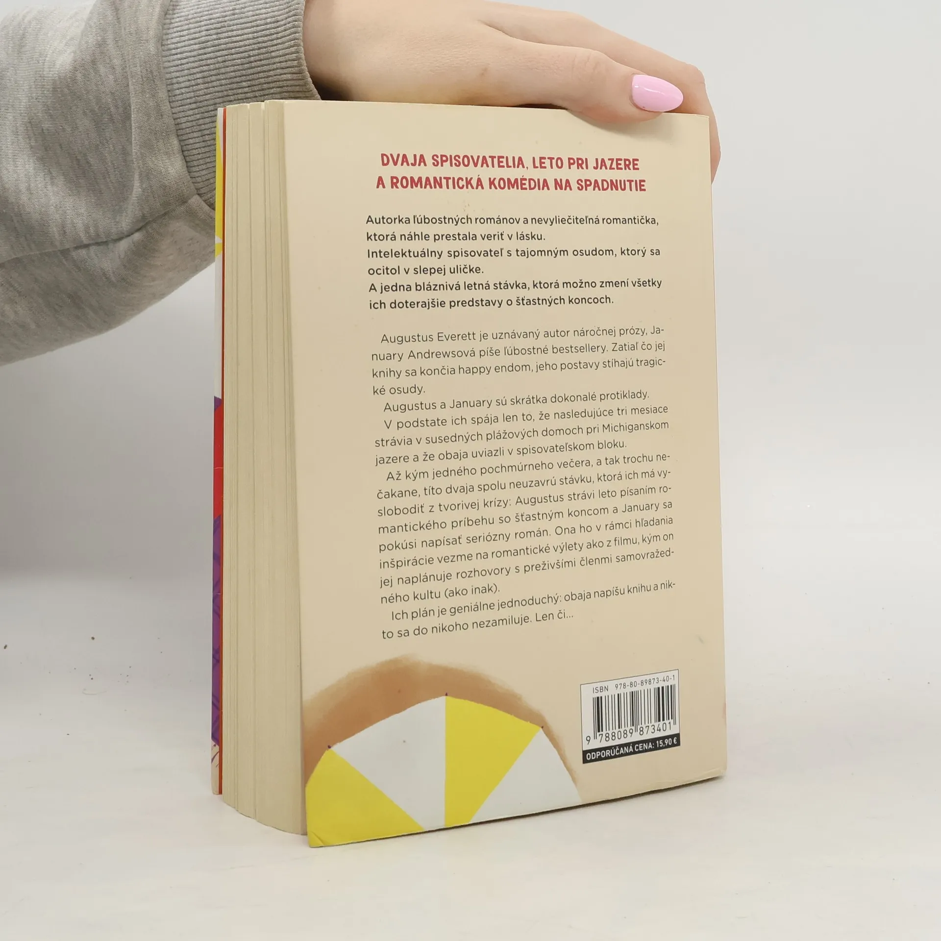 Autorka ľúbostných románov a nevyliečiteľná romantička, ktorá náhle prestala veriť v lásku. Renomovaný spisovateľ s tajomným osudom, ktorý sa ocitol v slepej uličke. A jedna bláznivá letná stávka, ktorá možno zmení všetky ich doterajšie predstavy o šťastných koncoch. Augustus Everett je uznávaný autor náročnejšej prózy, January Andrewsová píše ľúbostné bestsellery. Zatiaľ čo jej knihy sa končia happy endom, jeho postavy stíhajú tragické osudy. Augustus a January sú skrátka dokonalé protiklady. V podstate ich spája len to, že nasledujúce tri mesiace strávia v susedných plážových domoch pri Michiganskom jazere a že obaja uviazli v spisovateľskom bloku. Až kým jedného pochmúrneho večera a tak trochu nečakane títo dvaja spolu neuzavrú stávku, ktorá ich má vyslobodiť z tvorivej krízy: Augustus strávi leto písaním romantického príbehu so šťastným koncom a January sa pokúsi napísať seriózny román. Ona ho v rámci hľadania inšpirácie vezme na romantické výlety ako z filmu, kým on jej naplánuje rozhovory s preživšími členmi samovražedného kultu (ako inak). Ich plán je geniálne jednoduchý: obaja dopíšu knihu a nikto sa do nikoho nezamiluje. Len či...