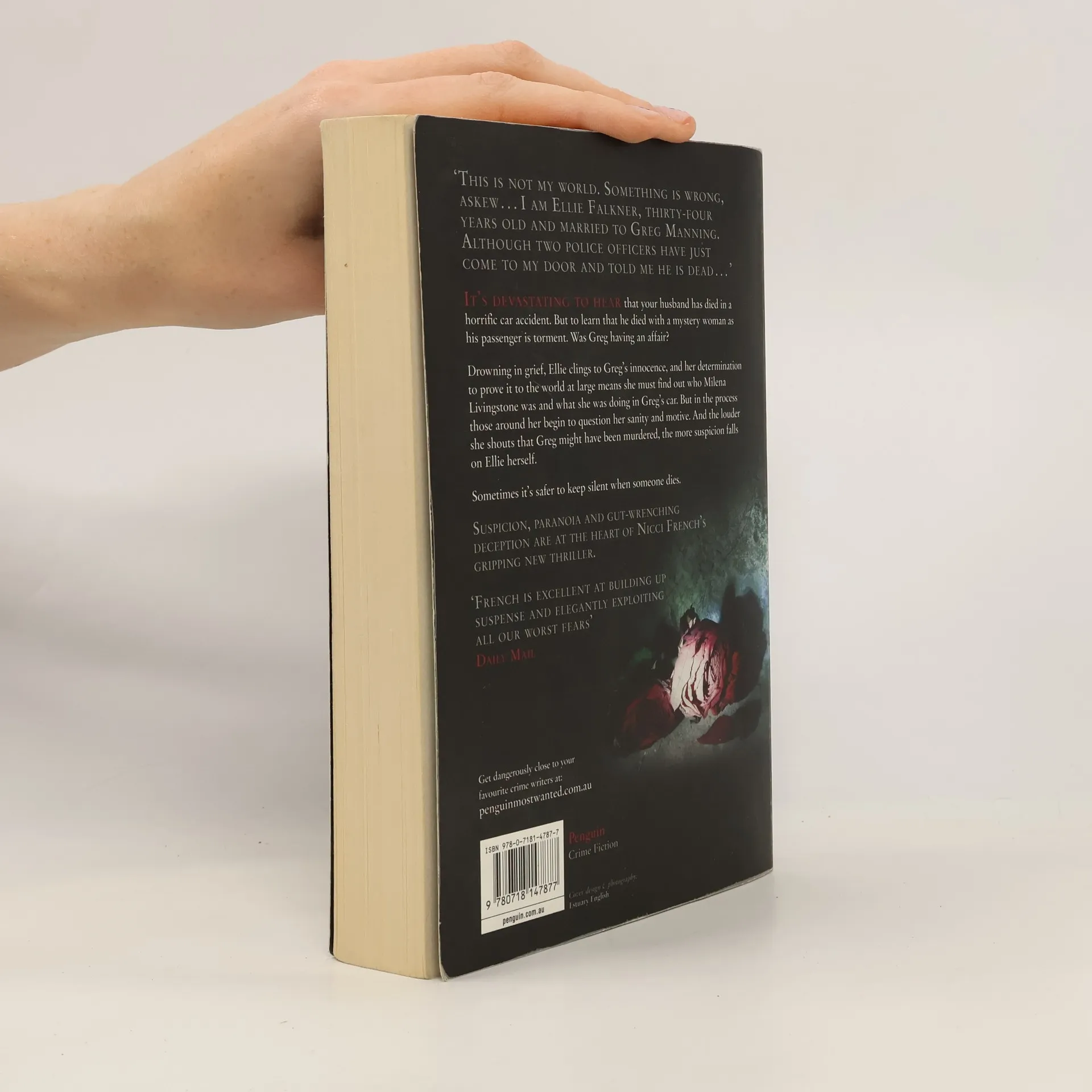 'This is not my world. Something is wrong, askew. . . I am Ellie Falkner, thirty-four years old and married to Greg Manning. Although two police officers have just come to my door and told me he is dead . . . ' It's devastating to hear that your husband has died in a horrific car accident. But to learn that he died with a mystery woman as his passenger is torment. Was Greg having an affair? Drowning in grief, Ellie clings to Greg's innocence, and her determination to prove it to the world at large means she must find out who Milena Livingstone was and what she was doing in Greg's car. But in the process those around her begin to question her sanity and motive. And the louder she shouts that Greg must have been murdered, the more suspicion falls on Ellie herself. Sometimes it's safer to keep silent when someone dies. Suspicion, paranoia and gut-wrenching deception are at the heart of Nicci French's gripping new thriller. 'French is excellent at building up suspense and elegantly exploiting all our worst fears.' Daily Mail