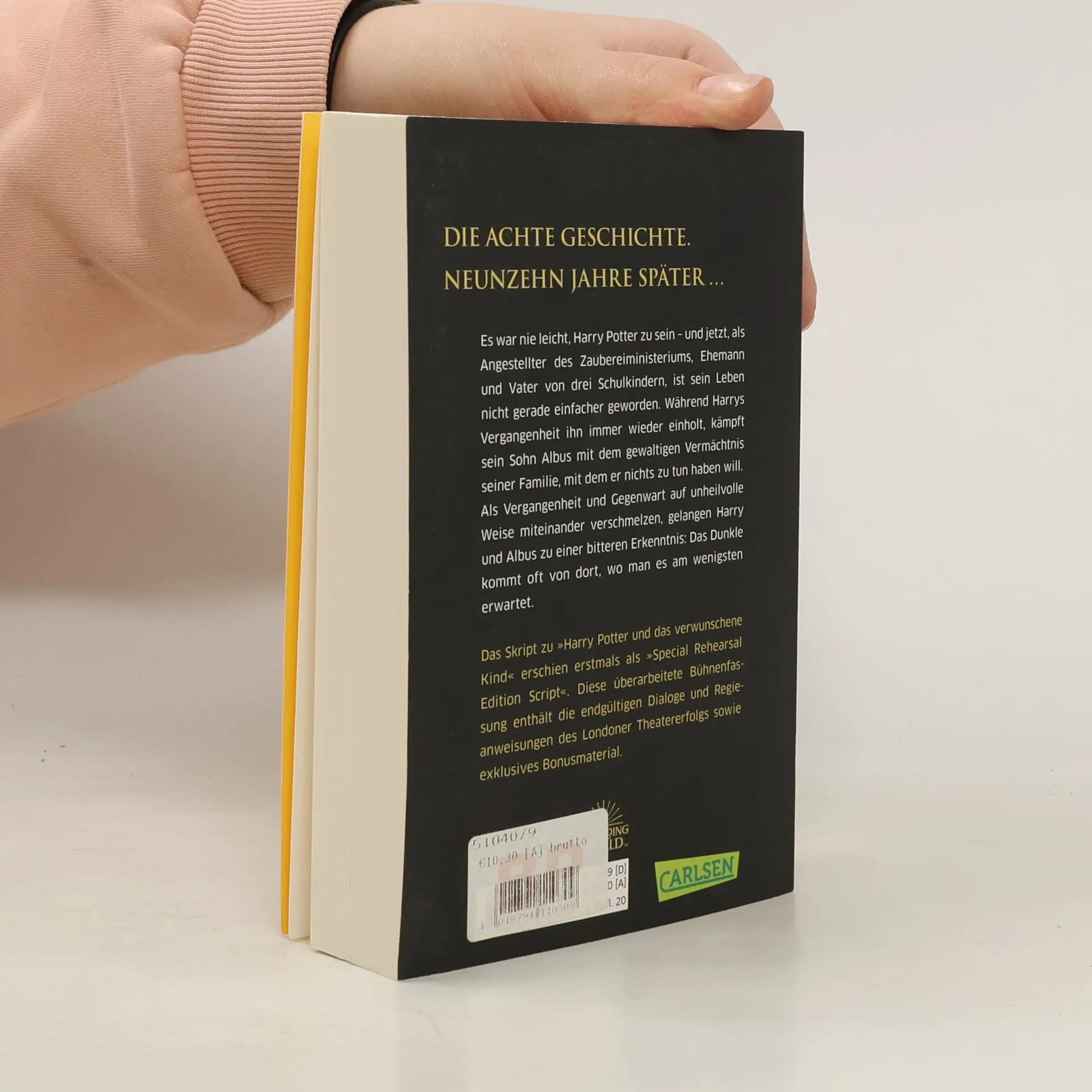 Die achte Geschichte. Neunzehn Jahre später … Es war nie leicht, Harry Potter zu sein – und jetzt, als Angestellter des Zaubereiministeriums, Ehemann und Vater von drei Schulkindern, ist sein Leben nicht gerade einfacher geworden. Während Harrys Vergangenheit ihn immer wieder einholt, kämpft sein Sohn Albus mit dem gewaltigen Vermächtnis seiner Familie, mit dem er nichts zu tun haben will. Als Vergangenheit und Gegenwart auf unheilvolle Weise miteinander verschmelzen, gelangen Harry und Albus zu einer bitteren Erkenntnis: Das Dunkle kommt oft von dort, wo man es am wenigsten vermutet. Das Skript zu »Harry Potter und das verwunschene Kind« erschien erstmals als »Special Rehearsal Edition Script«. Diese überarbeitete Bühnenfassung enthält die endgültigen Dialoge und Regieanweisungen des Londoner Theatererfolgs sowie exklusives Bonusmaterial. Dazu gehören ein Gespräch zwischen dem Regisseur John Tiffany und dem Autor Jack Thorne und nützliche Hintergrundinformationen: der Stammbaum der Familie Potter und eine Chronologie der Ereignisse, die vor Beginn von »Harry Potter und das verwunschene Kind« stattfanden.