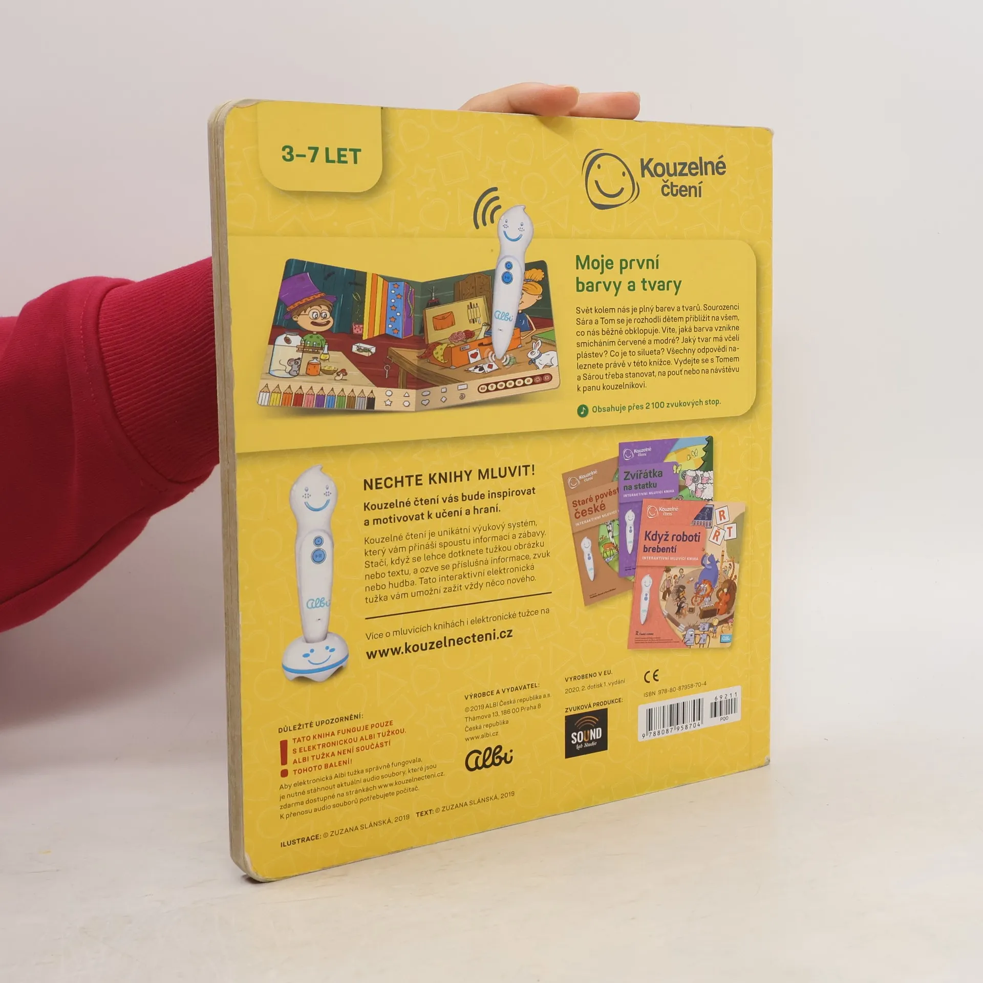 Interaktivní mluvící kniha Moje první barvy a tvary z edice Kouzelné čtení provede děti od 3 let světem kolem nás a ukáže jim, jak již název napovídá, všemožné barvy a tvary. Průvodci se stanou sourozenci Sára a Tom a poví dětem například jaká barva vznikne smícháním červené a modré, jaký tvar má včelí plástev a co je silueta.Kniha je plná dialogů a zvuků, které děti zaujmou. Nechybí ani oblíbené zábavné kvízy ve 3 úrovních obtížnosti.Kniha Moje první barvy a tvary obsahuje přes 2100 zvuků a textů.