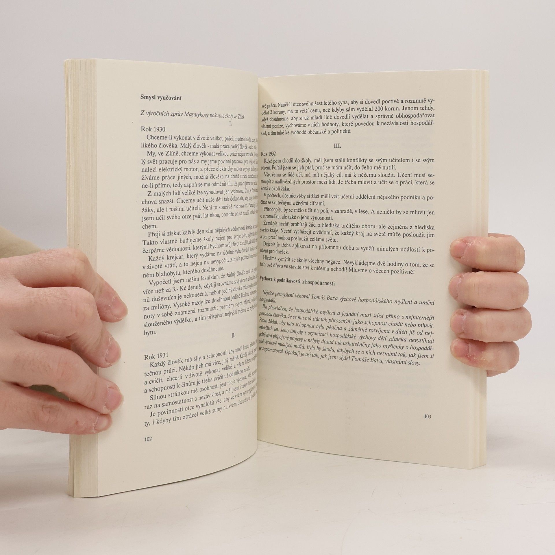 Knižní publikace Tomáše Bati „Úvahy a projevy“ byla poprvé vydána roku 1932 vydavatelstvím TISK Zlín. Tomáše Baťu pochopíme nejlépe studiem jeho vlastních myšlenek. Základním dílem jsou jeho „Úvahy a projevy“. Kniha obsahuje kompletní soubor písemných projevů, úvah a článků Tomáše Bati, kterými se obracel k posluchačům hlavně prostřednictvím podnikového časopisu a materiálů vydaných firemním nakladatelstvím Tisk. Pro pochopení Baťovy podnikatelské a životní filozofie je studium tohoto díla nevyhnutelné. Předmluva Milan Zelený a Antonín Cekota. 3. vydání