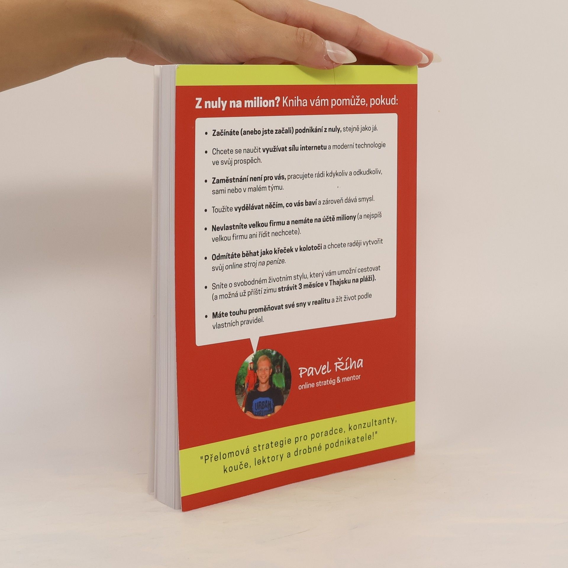 Neobvyklý návod, jak vydělat přes internet (první) milion a víc... Kniha vám pomůže, pokud: - Začínáte (anebo jste začali) podnikání z nuly, stejně jako já. - Chcete se naučit využívat sílu internetu a moderní technologie ve svůj prospěch (a dosáhnout finanční i časové svobody). - Zaměstnání není pro vás, pracujete rádi kdykoliv a odkudkoliv, sami nebo v malém týmu. - Toužíte vydělávat něčím, co vás baví a zároveň dává smysl. - Nevlastníte velkou firmu a nemáte na účtě miliony (a nejspíš velkou firmu ani řídit nechcete). - Odmítáte běhat jako křeček v kolotoči a chcete raději vytvořit svůj online stroj na peníze. - Sníte o svobodném životním stylu, který vám umožní cestovat a možná už příští zimu strávit v Thajsku na pláži (nebo celé léto na chatě a v lese s rodinou).