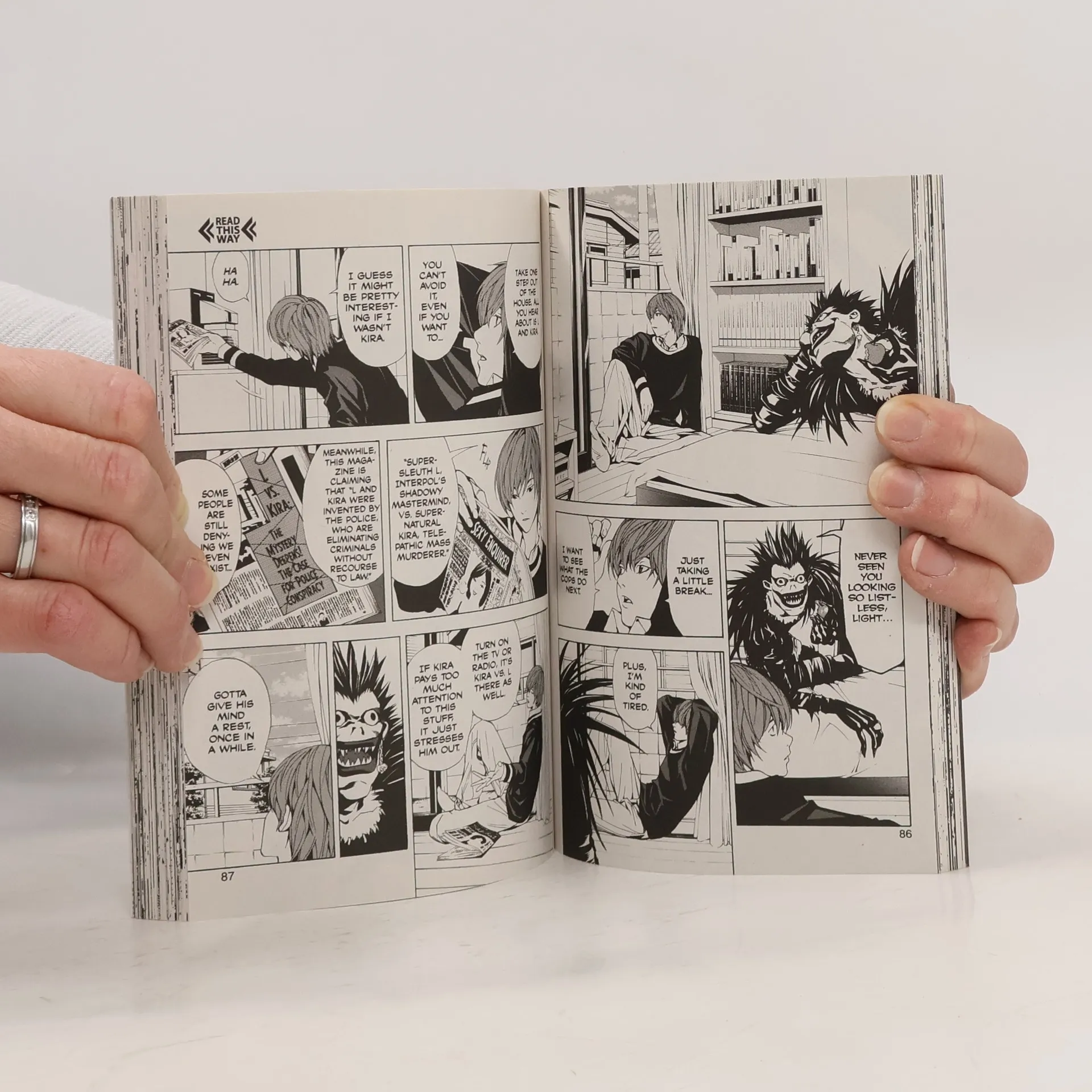 Light Yagami is an ace student with great prospects - and he's bored out of his mind. But all that changes when he finds the Death Note, a notebook dropped by a rogue Shinigami death god. Any human whose name is written in the notebook dies, and now Light has vowed to use the power of the Death Note to rid the world of evil. But when criminals begin dropping dead, the authorities send the legendary detective L to track down the killer. With L hot on his heels, will Light lose sight of his noble goal...or his life? Light tests the boundaries of the Death Note's powers as L and the police begin to close in. Luckily Light's father is the head of the Japanese National Police Agency and leaves vital information about the case lying around the house. With access to his father's files, Light can keep one step ahead of the authorities. But who is the strange man following him, and how can Light guard against enemies whose names he doesn't know?