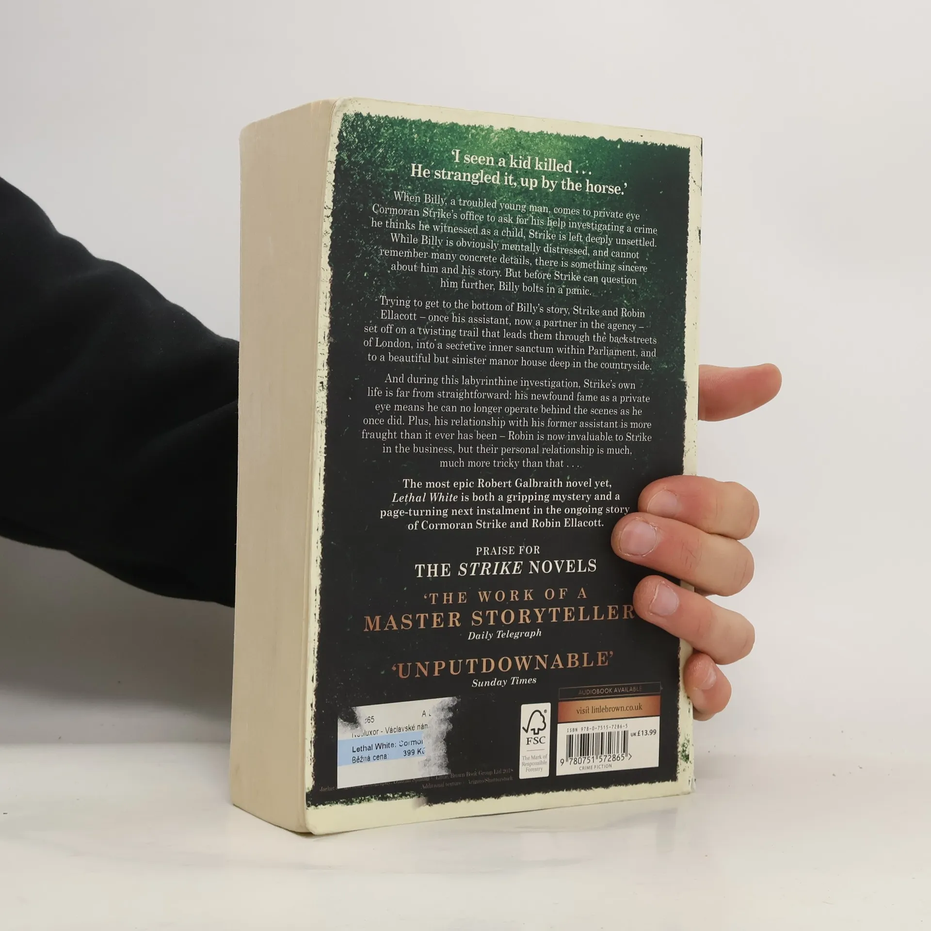 LETHAL WHITE is both a gripping mystery and the page-turning next instalment in the highly acclaimed series featuring Cormoran Strike and Robin Ellacott, written by J.K. Rowling under the pseudonym Robert Galbraith. 'I seen a kid killed . . . He strangled it, up by the horse.' When Billy, a troubled young man, comes to private eye Cormoran Strike's office to ask for his help investigating a crime he thinks he witnessed as a child, Strike is left deeply unsettled. While Billy is obviously mentally distressed, and cannot remember many concrete details, there is something sincere about him and his story. But before Strike can question him further, Billy bolts from his office in a panic. Trying to get to the bottom of Billy's story, Strike and Robin Ellacott - once his assistant, now a partner in the agency - set off on a twisting trail that leads them through the backstreets of London, into a secretive inner sanctum within Parliament, and to a beautiful but sinister manor house deep in the countryside. And during this labyrinthine investigation, Strike's own life is far from straightforward: his newfound fame as a private eye means he can no longer operate behind the scenes as he once did. Plus, his relationship with his former assistant is more fraught than it ever has been - Robin is now invaluable to Strike in the business, but their personal relationship is much, much more tricky than that . . .