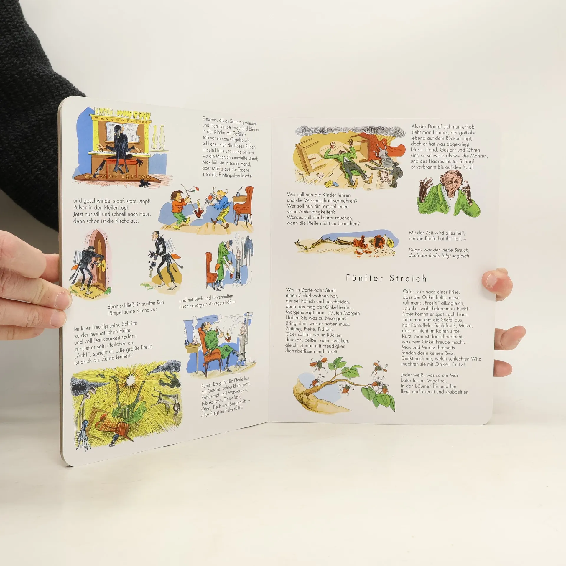 Der Kinderbuch-Klassiker • Strapazierfähige Pappe • abgerundete Ecken • Großformat Ach, was muss man oft von bösen Kindern hören oder lesen! Wie zum Beispiel hier von diesen, Welche Max und Moritz hießen. Bis heute haben die Reime von Max und Moritz, die der Witwe Bolte die Hühner stehlen und dem Lehrer Lämpel Schießpulver in die Pfeife füllen, nichts von ihrer Faszination verloren. Schneider Böck, Onkel Fritz, Plisch und Plum, die beiden Hunde treffend hat Wilhelm Busch seine Figuren beschrieben und das mitunter rasante Geschehen in witzigen Bildern festgehalten.