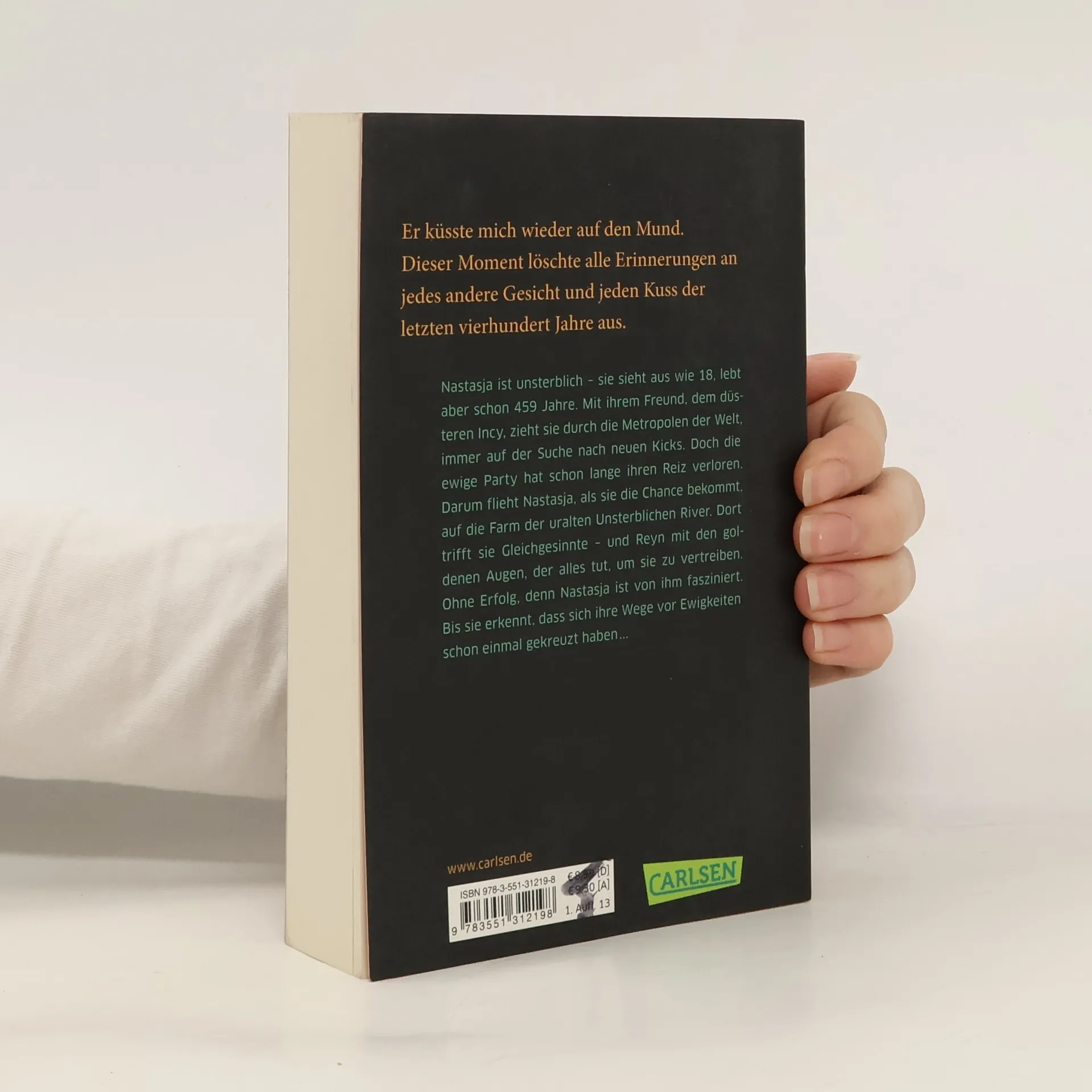 Nastasja ist unsterblich. Sie sieht aus wie 18, lebt aber schon 459 Jahre. Mit ihrem Freund Incy zieht sie durch die Metropolen der Welt, immer auf der Suche nach neuen Kicks. Doch das ewige Partyleben hinterlässt inzwischen nur noch einen schalen Geschmack - und Incy schlägt immer öfter über die Stränge. Darum flüchtet sich Nastasja auf die Farm von River, einer uralten Unsterblichen, die ein ganz anderes Leben gewählt hat. Dort trifft sie Reyn, der alles tut, um Nastasja wieder loszuwerden. Sie bleibt, denn Reyn fasziniert sie – bis sie mit Schrecken erkennt, dass sich ihre Wege vor Ewigkeiten schon einmal gekreuzt haben.