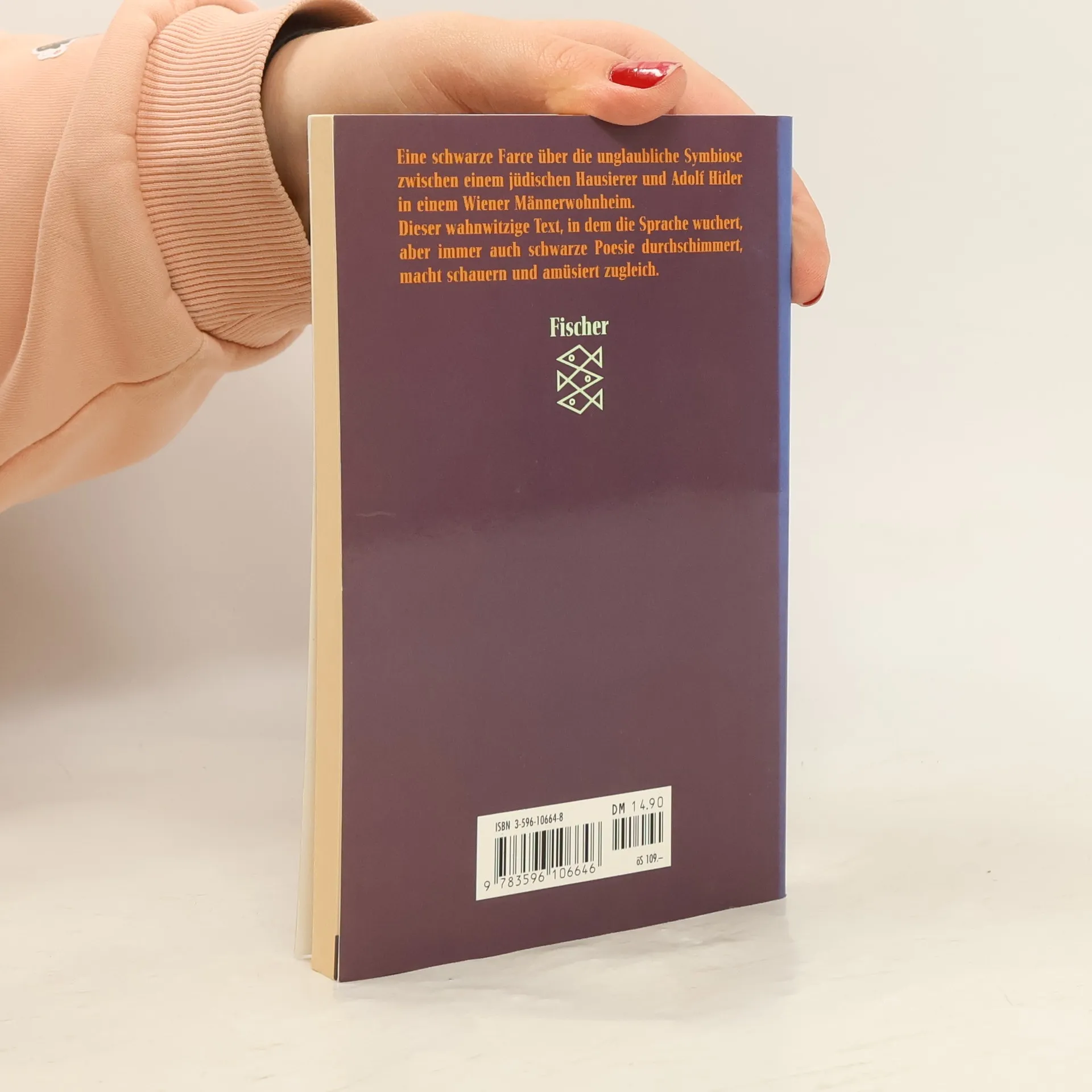 Eine schwarze Farce über die unglaubliche Symbiose zwischen einem jüdischen Hausierer und Adorlf Hitler in einem Wiener Männerwohnheim. Dieser wahnwitzige Text, in dem die Sprache wuchert, aber immer auch die schwarze Poesie durchschimmert, macht schauern und amüsiert zugleich.