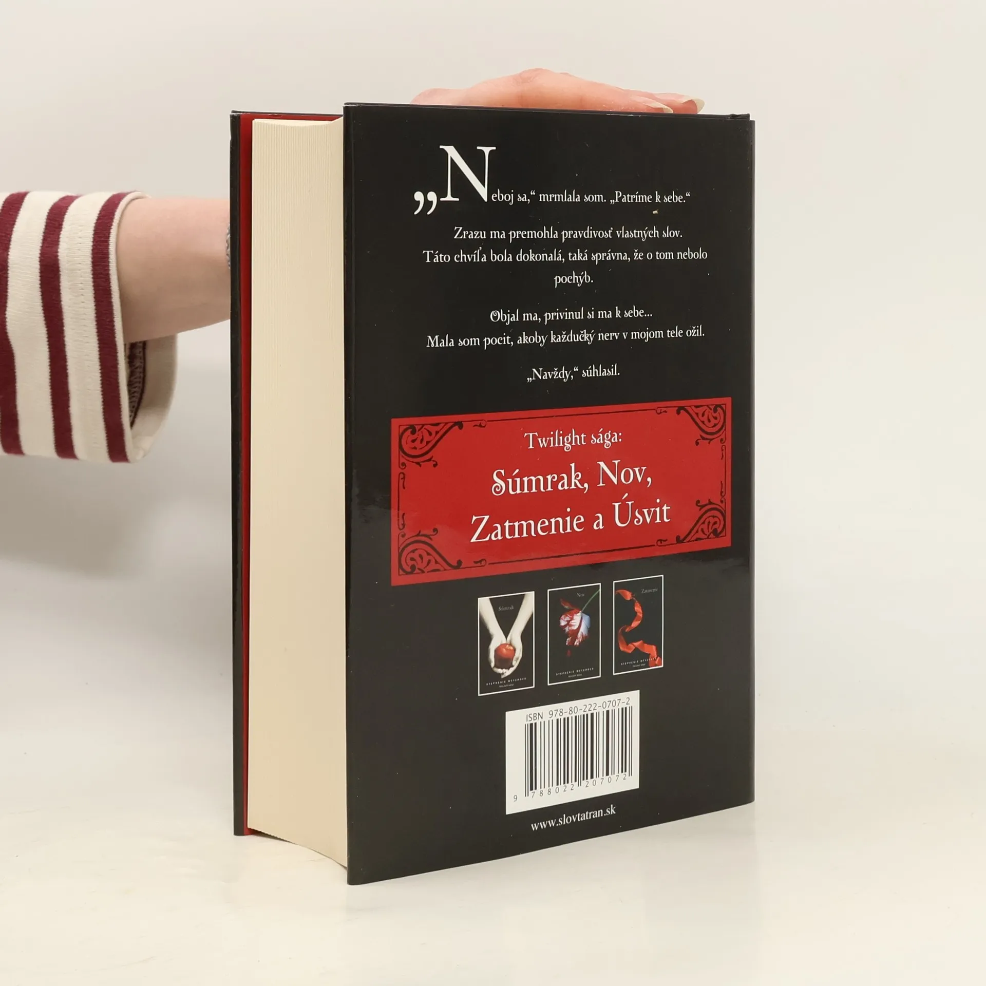 Keď milujete toho, kto vás zabíja, nemáte na výber. Ako by ste mohli utiecť, ako by ste mohli bojovať, keby ste práve tým ublížili niekomu, koho milujete? Ak mu nemáte dať nič viac a nič menej ako vlastný život, ako by ste mu ho mohli odoprieť? Niekomu, koho skutočne milujete? Bella Swanová je neodvolateľne zaľúbená do upíra – je to pre ňu krásny sen a zároveň nočná mora, ktoré vytvárajú jej nebezpečne vyhrotenú realitu. Na jednu stranu ju ťahá silná vášeň, ktorú cíti k Edwardovi Cullenovi a na druhú hlboké puto k vlkolakovi Jacobovi Blackovi a prežila búrlivý rok plný pokušenia, strát a sporov, kým dospela k rozhodujúcemu okamihu. Rozhodne sa teraz vstúpiť do temného, no zvodného sveta nesmrteľných, alebo bude pokračovať v ľudskom živote? Od odpovede na túto otázku závisí osud dvoch kmeňov. Keď sa Bella už raz rozhodla, začína sa prekvapivý sled nevídaných udalostí s potenciálne ničivými a tajomnými dôsledkami. Práve keď sa zdá, že sa zamotané pradivá Bellinho života – ktoré sa po prvý raz objavili v Súmraku, potom sa zamotali a potrhali v Nove a Zatmení – znova rozpletú a usporiadajú, mohli by byť zničené… navždy? Úsvit, úžasný a s napätím očakávaný záver ságy Twilight, odhaľuje tajomstvá a záhady tohto fascinujúceho romantického eposu, ktorý okúzlil milióny čitateľov.