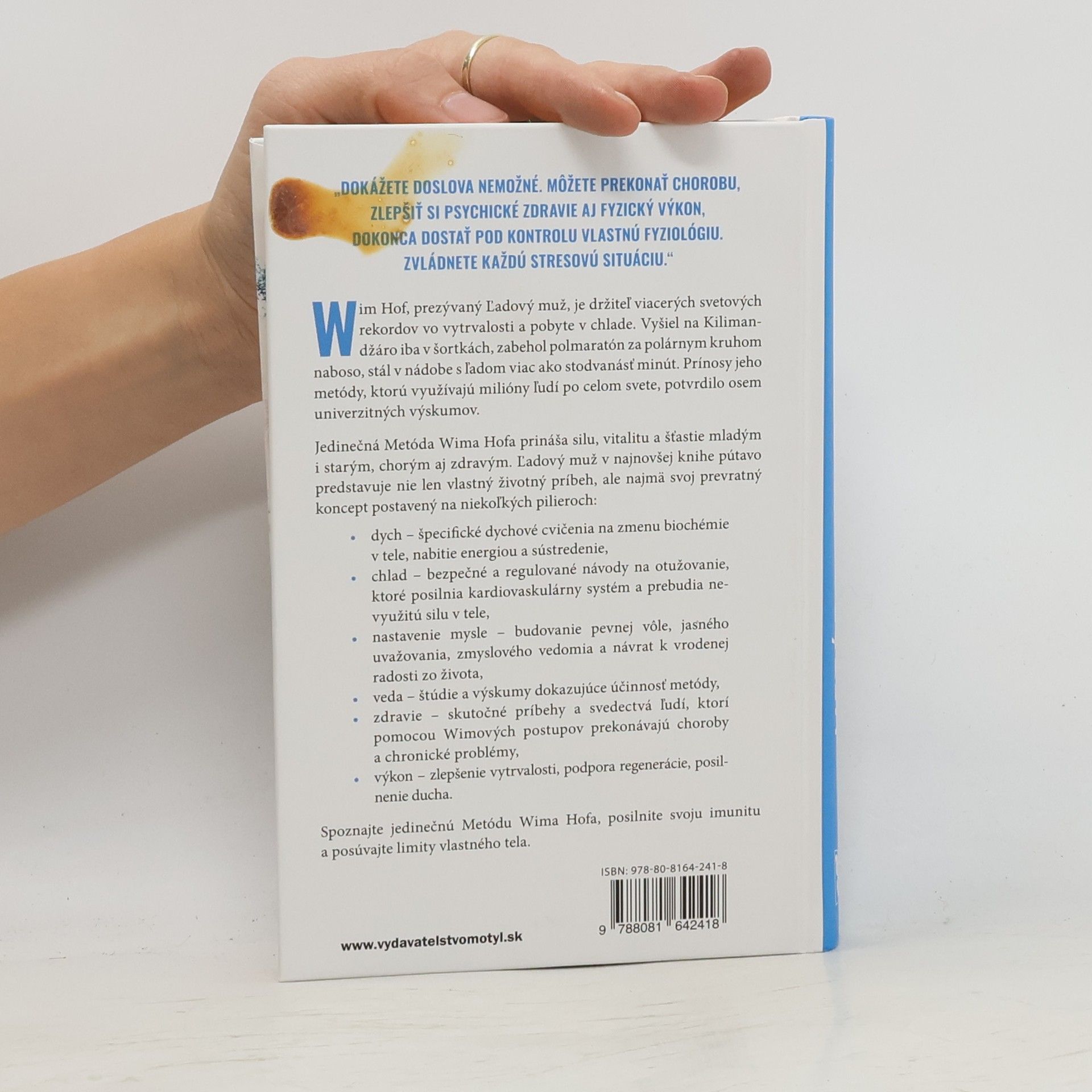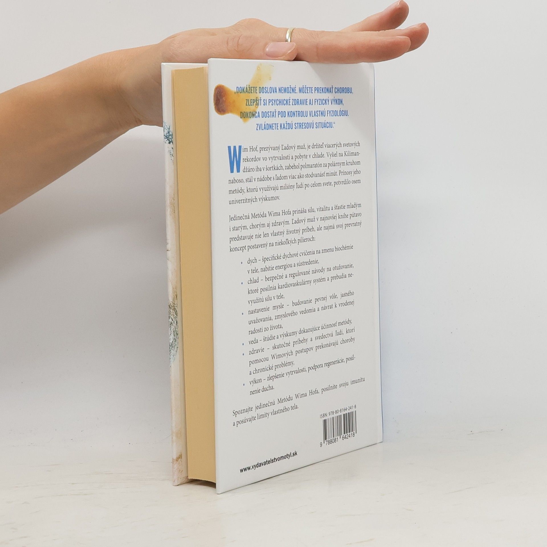„Dokážete doslova nemožné. Môžete prekonať chorobu, zlepšiť si psychické zdravie aj fyzický výkon, dokonca dostať pod kontrolu vlastnú fyziológiu. Zvládnete každú stresovú situáciu. “ Wim Hof, prezývaný Ľadový muž, je držiteľ viacerých svetových rekordov vo vytrvalosti a pobyte v chlade. Vyšiel na Kilimandžáro iba v šortkách, zabehol polmaratón za polárnym kruhom naboso, stál v nádobe s ľadom viac ako stodvanásť minút. Prínosy jeho metódy, ktorú využívajú milióny ľudí po celom svete, potvrdilo osem univerzitných výskumov.