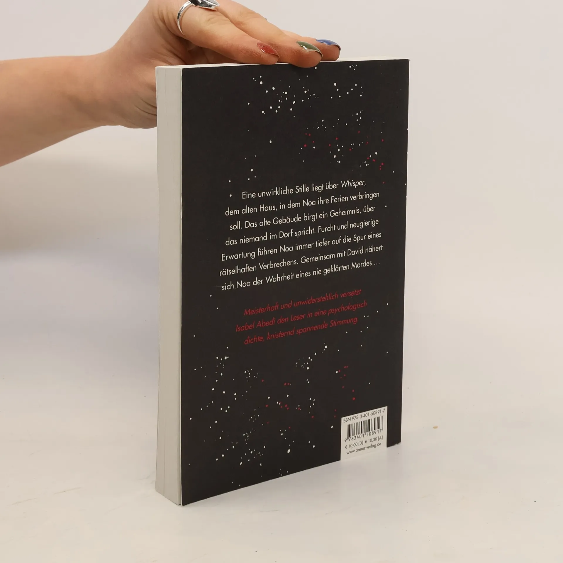 Eine unwirkliche Stille liegt über Whisper , dem alten Haus, in dem Noa ihre Ferien verbringen soll. Das alte Gebäude birgt ein Geheimnis, über das niemand im Dorf spricht. Gemeinsam mit David nähert sich Noa der Wahrheit eines nie geklärten Mordes. Meisterhaft und unwiderstehlich versetzt Isabel Abedi den Leser in eine psychologisch dichte, knisternd spannende Stimmung. Nominiert für den Deutschen Jugendliteraturpreis.