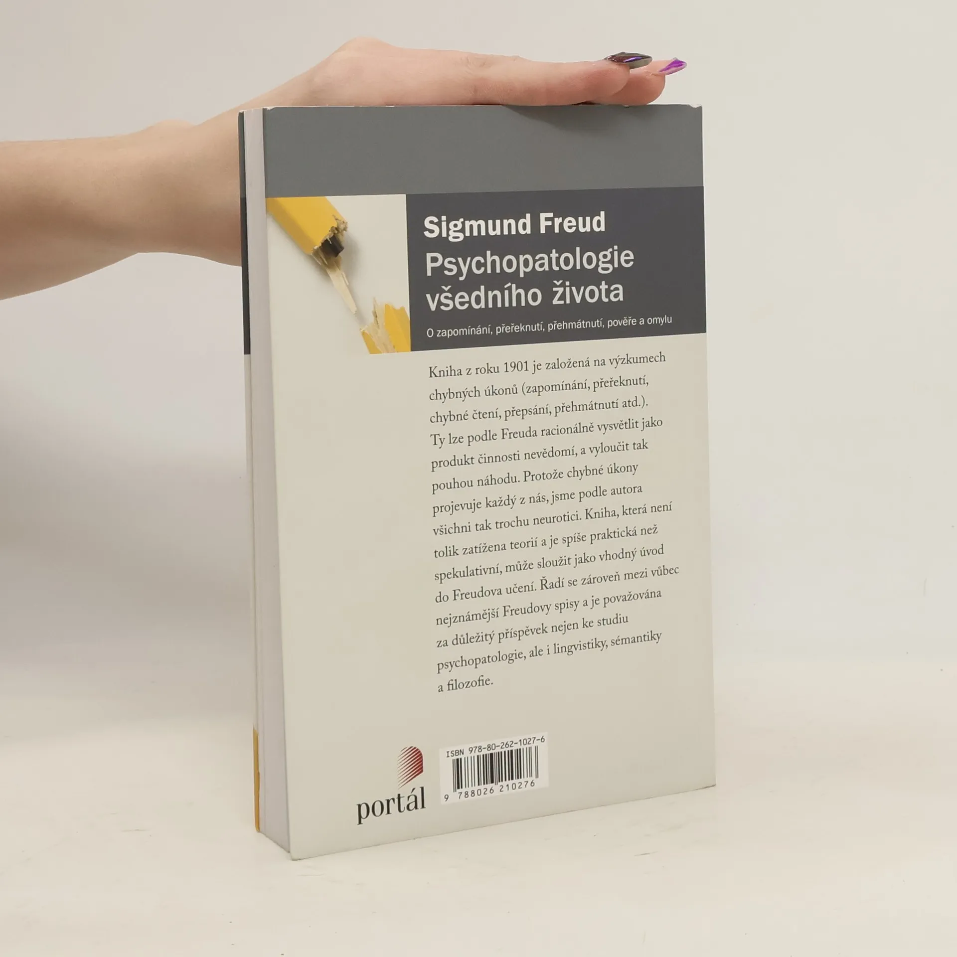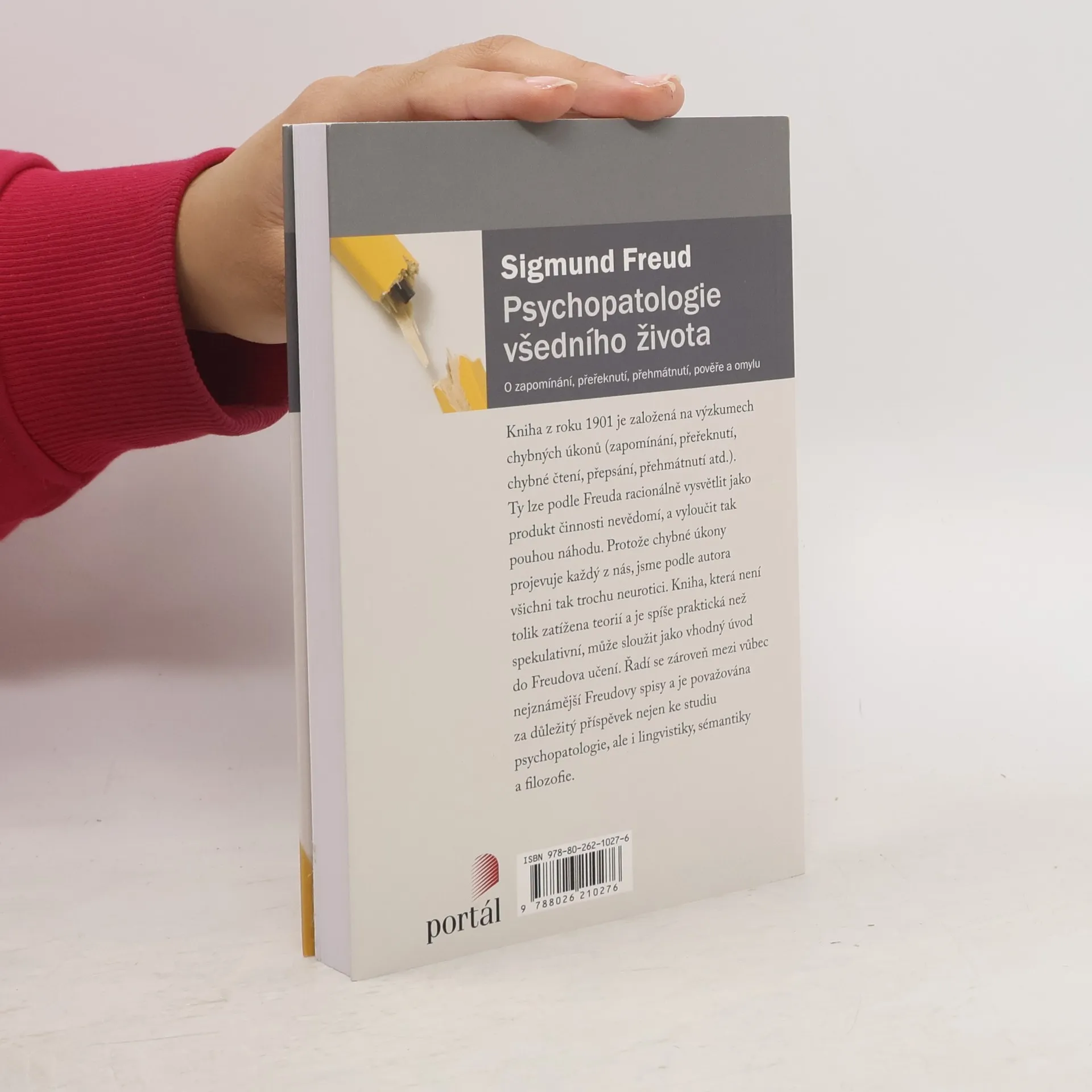 Kniha z roku 1901 je založená na výzkumech chybných úkonů (zapomínání, přeřeknutí, chybné čtení, přepsání, přehmátnutí atd.). Ty lze podle Freuda racionálně vysvětlit jako produkt činnosti nevědomí, a vyloučit tak pouhou náhodu. Protože chybné úkony projevuje každý z nás, jsme podle autora všichni tak trochu neurotici. Kniha, která není tolik zatížena teorií a je spíše praktická než spekulativní, může sloužit jako vhodný úvod do Freudova učení. Řadí se zároveň mezi vůbec nejznámější Freudovy spisy a je považována za důležitý příspěvek nejen studia psychopatologie, ale i lingvistiky, sémantiky a filosofie. Sigmund Freud (1856–1939), vídeňský neurolog a psychoterapeut, zakladatel psychoanalýzy, třetí nejcitovanější osoba v psychologii 20. století.