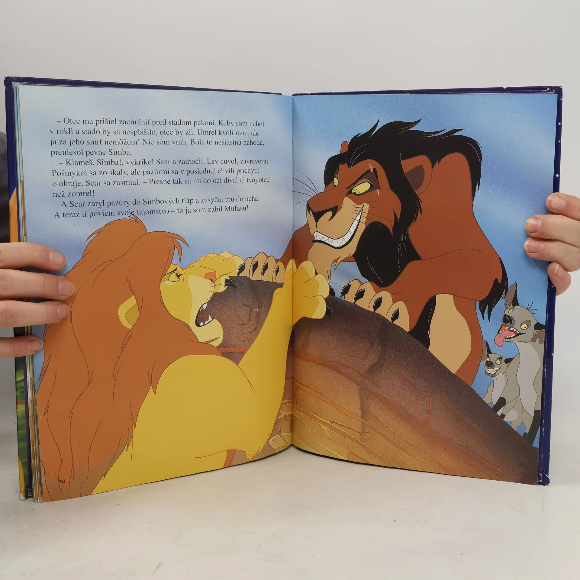 Kniha Leví kráľ z dieľne Watla Disneyho. Oranžový kotúč slnka nahliadol prvými žeravými lúčmi do nekonečnej krajiny piesku, skál a stepnej trávy a nad týmto dielom sveta, ktorý ľudia pomenovali Afrika, sa rozozneli tisícky bubnov a bubienkov. To však neduneli bubny! To dupali kopytá zebier a žiráf a mohutné slonie nohy. A nad bubnami vrieskali a pišťali hlasy tisíchlavého zboru ďalších zvierat. Všetky sa náhlili, aby sa po prvý raz mohli pokloniť prvorodenému synovi levieho kráľa Mufasu...