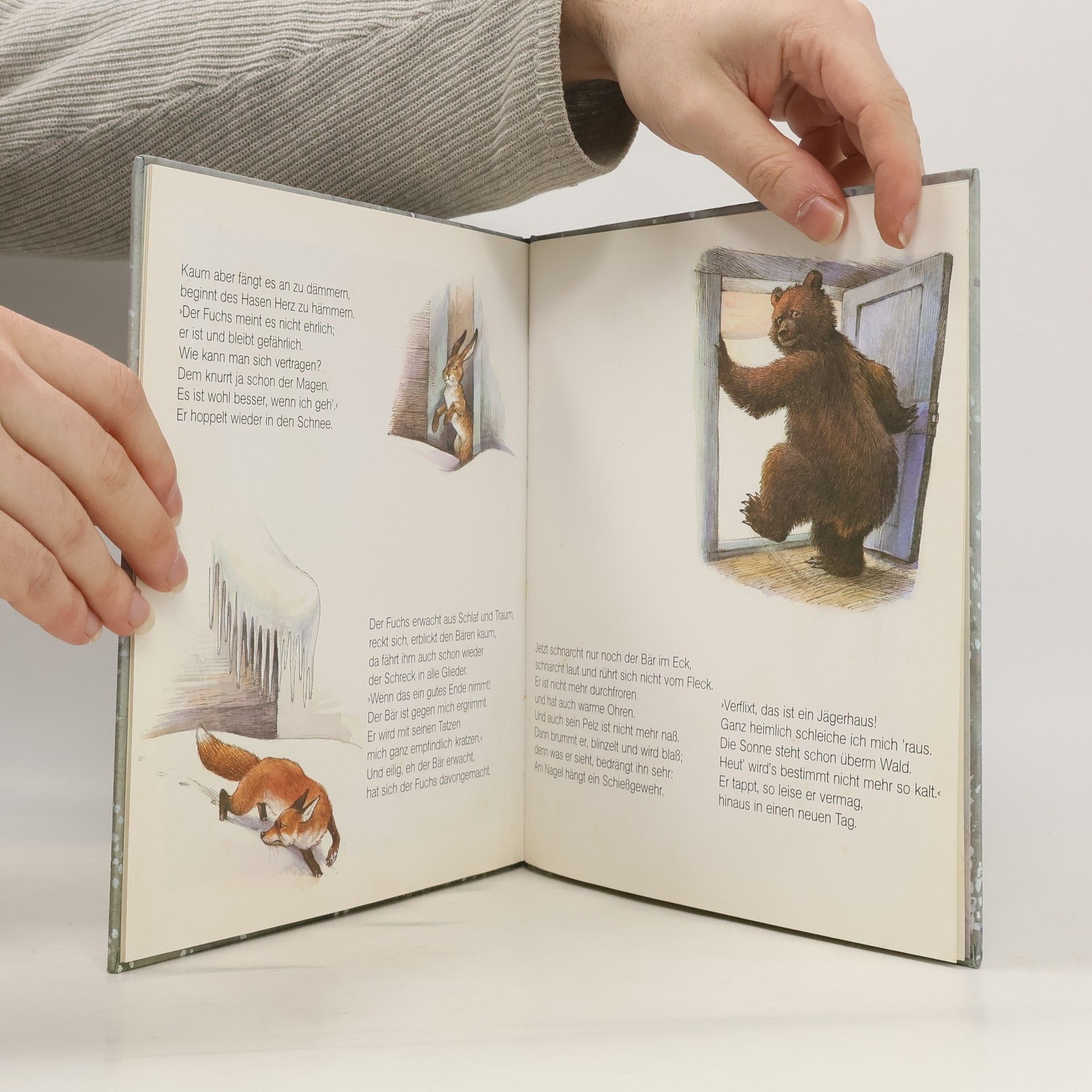 In einer eisigen Winternacht klopft es bei dem Jäger Wanja an der Tür: Ein frierender Hase bittet um Zuflucht und wird natürlich eingelassen. Doch dann folgen ihm ein wenig später noch ein Fuchs und ein Bär. Kann das gut gehen? Die Tiere versprechen Wanja, untereinander Frieden zu halten. Und als er am nächsten Morgen aufwacht, denkt er, er hätte alles nur geträumt. Doch dann sieht er die Spuren im Schnee ..