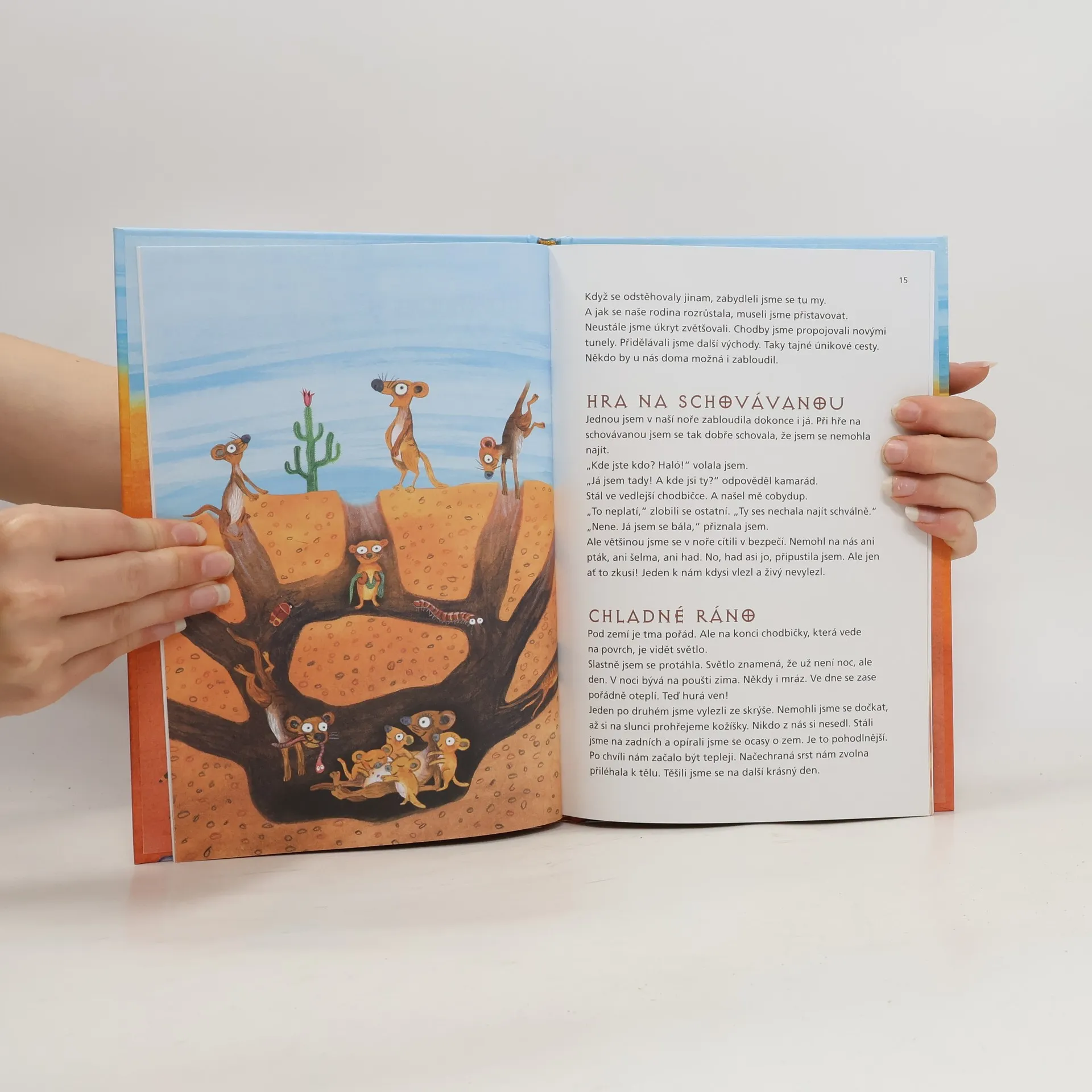 Příběh o životě surikat v africké poušti. Součástí knihy je pracovní sešit k luštění úkolů po přečtení knihy. V africké poušti Kalahari žije malá surikata Fína a její velká rodina. Fína se rozhodně nenudí, protože s kamarádem Zefem vyvádí jednu vylomeninu za druhou. Občas ale musí dávat pozor - život v poušti může být pěkně nebezpečný. Jednoho dne se poblíž surikatí nory objeví podivná skořápka, z níž vylezou dva neznámí tvorové. Nemají ocas, chodí po dvou a jejich tělo je pokryté barevnou svlékací srstí. Vyklubou se z nich přátelé, nebo nepřátelé? Nakladatelská anotace.